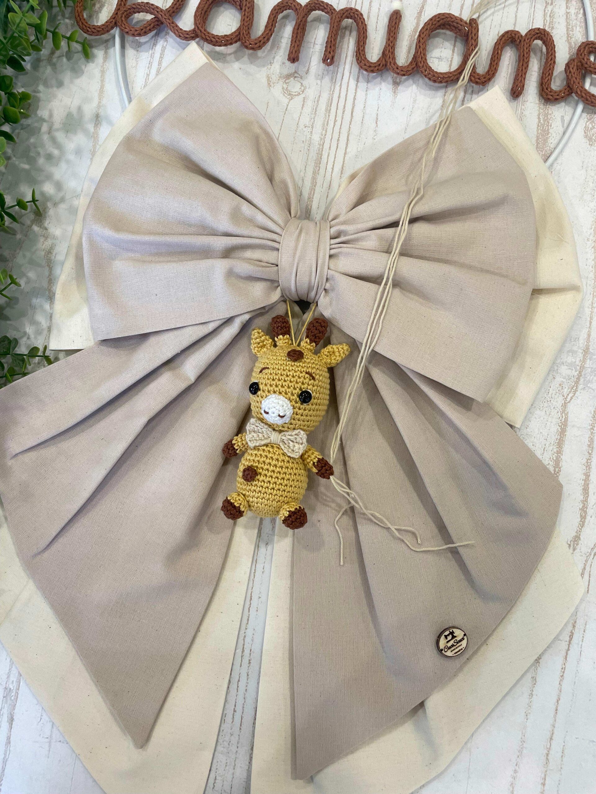 Dal fiocco pende una tenera giraffa realizzata con la tecnica amigurumi.