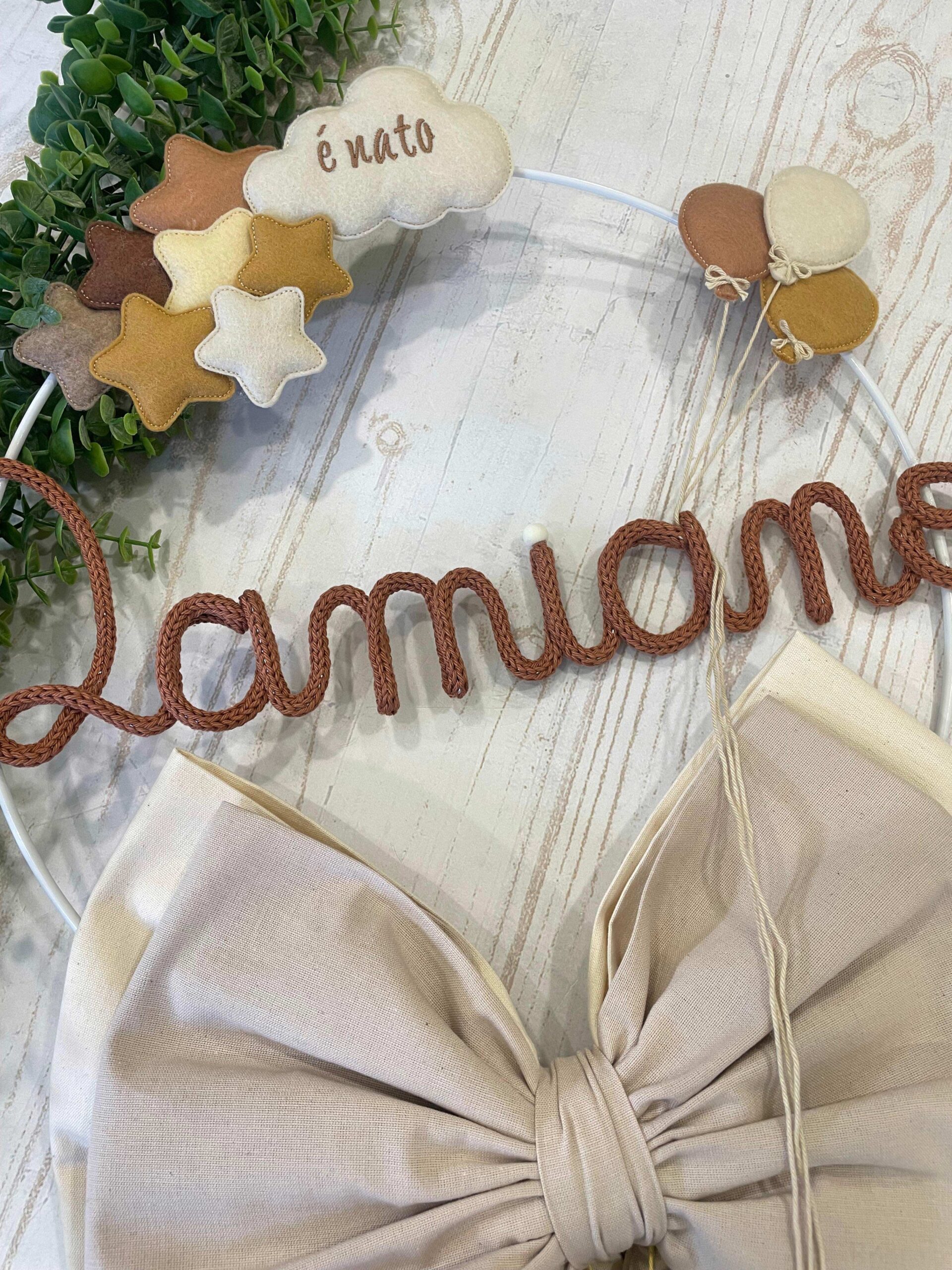 Un cerchio in metallo bianco decorato con soggetti in pannolenci, fanno da cornice a questo fiocco originale.