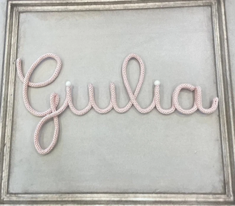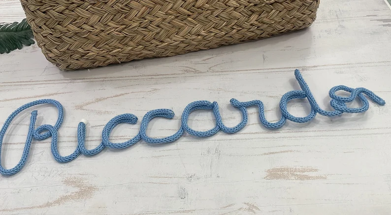 Questo fiocco nascita è composto dal nome del bimbo o bimba in tricotin, colore a scelta.