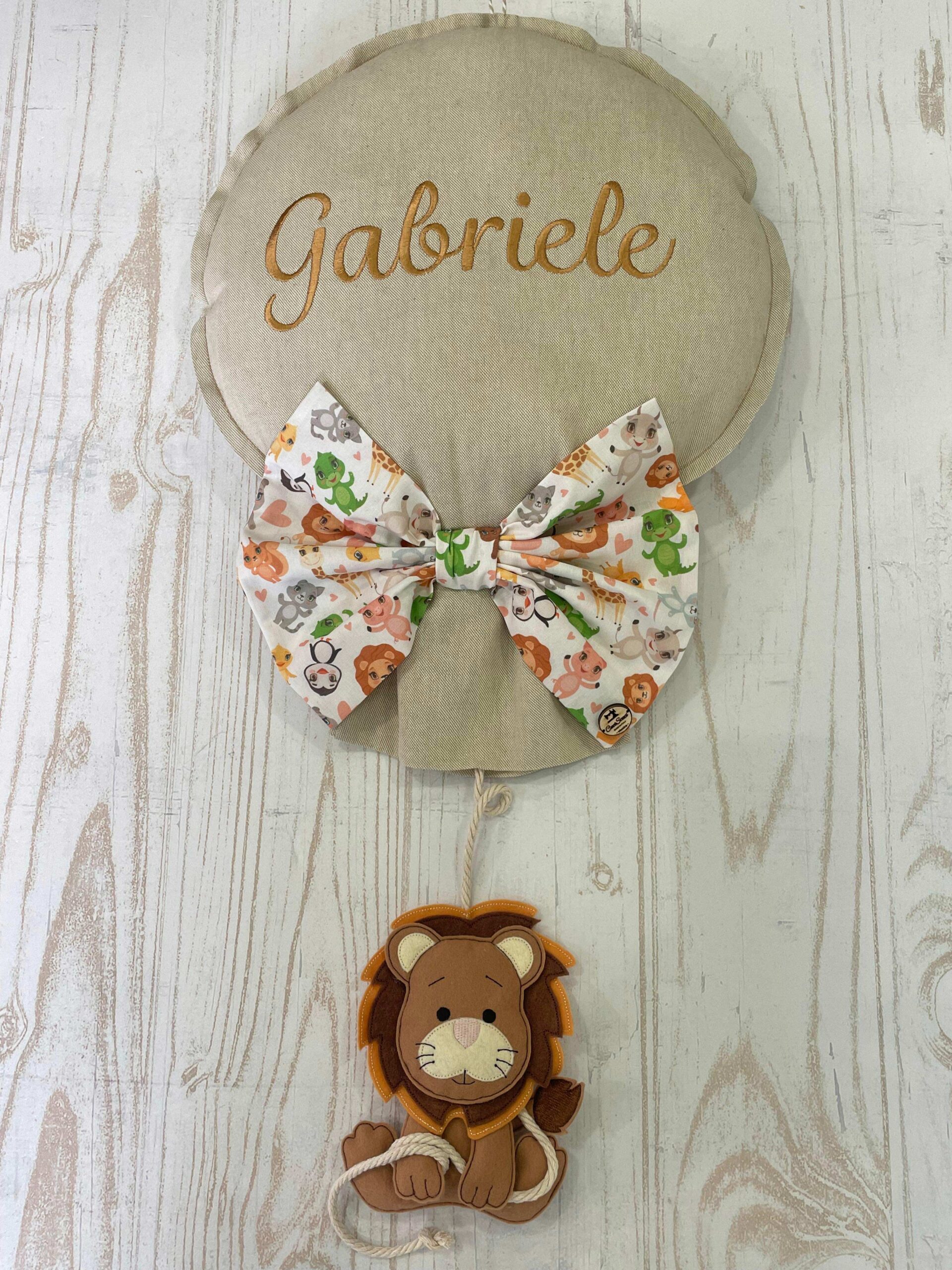 Dal fiocco pende un leoncino in pannolenci in 3d.