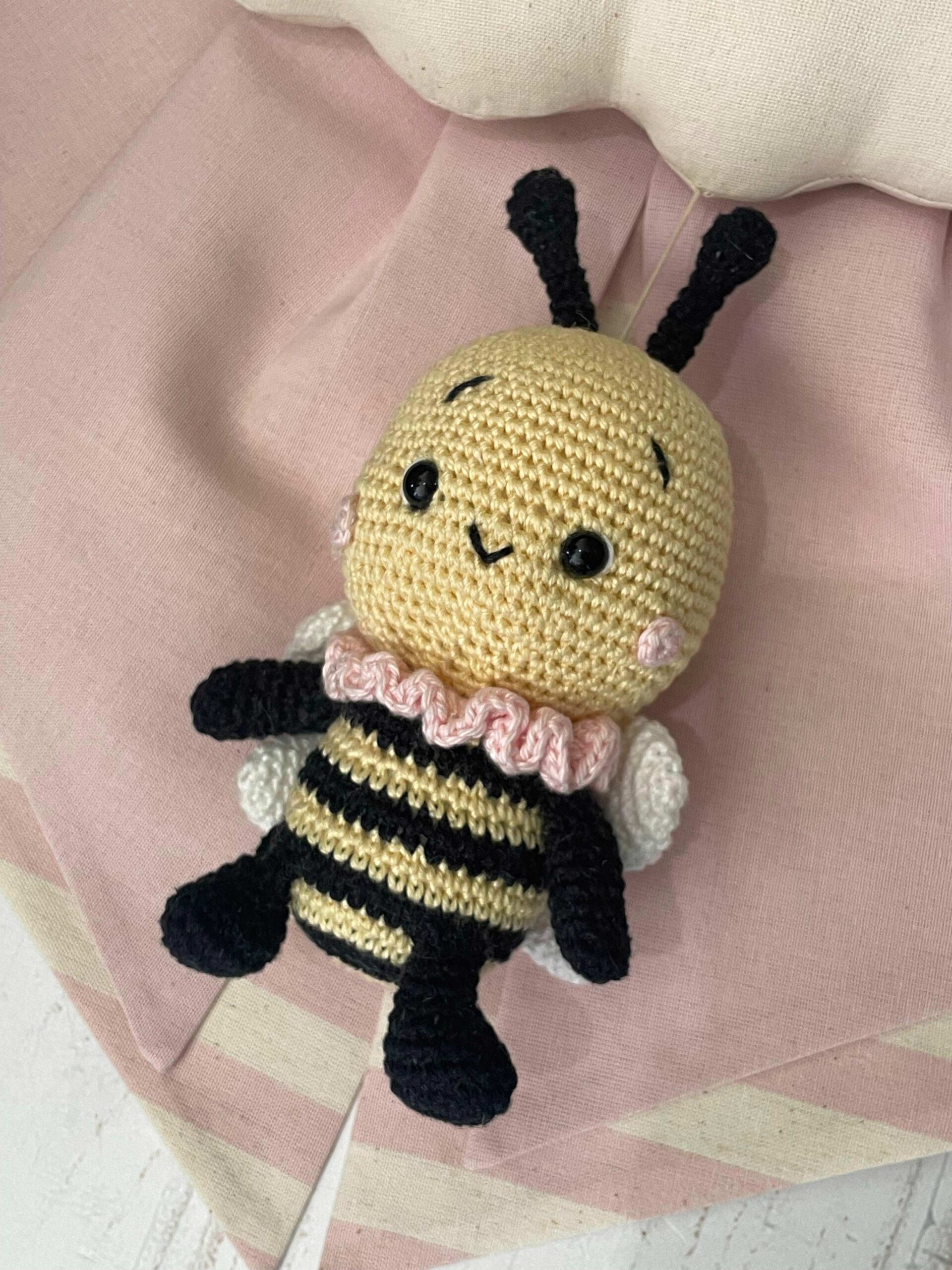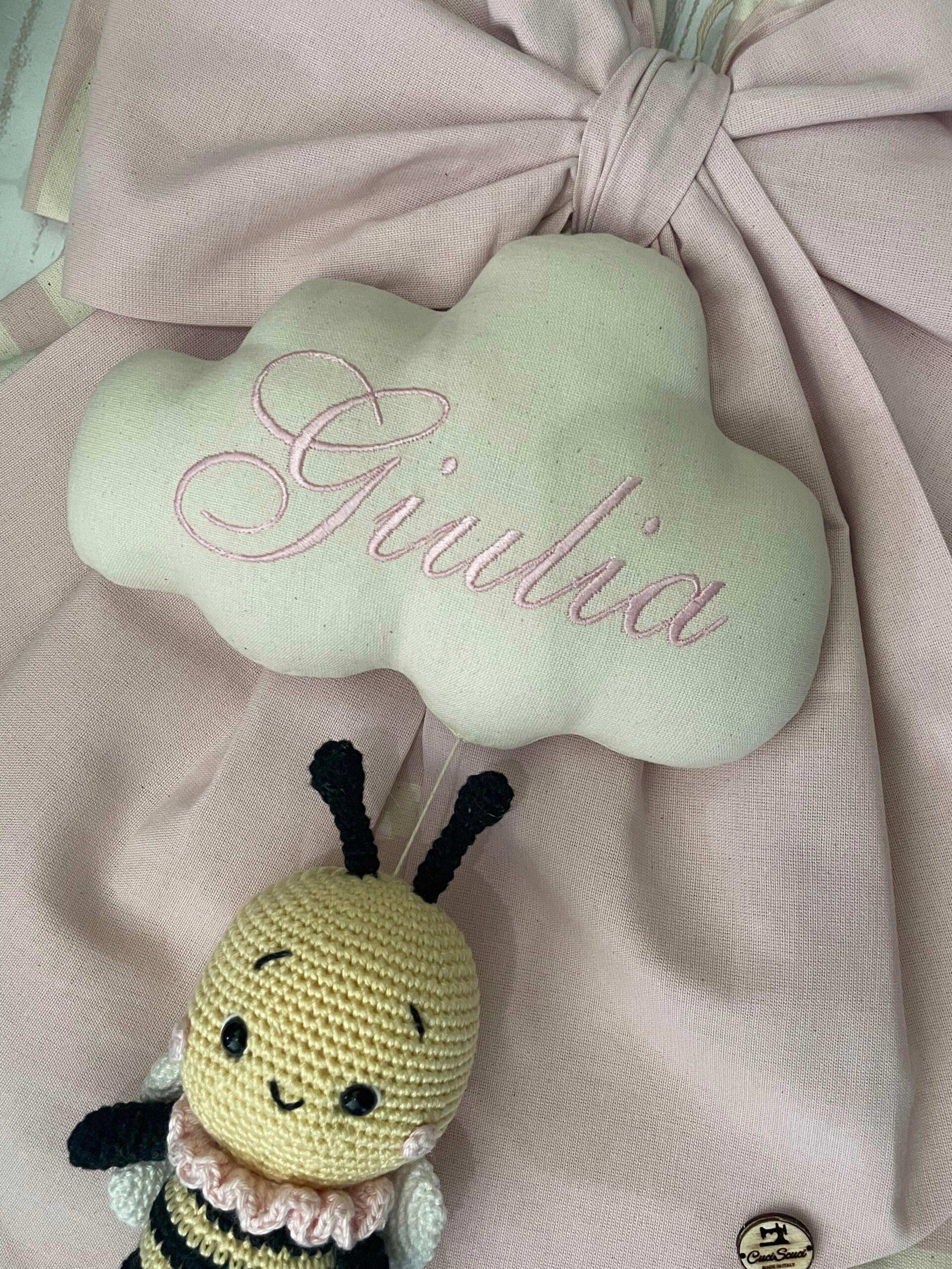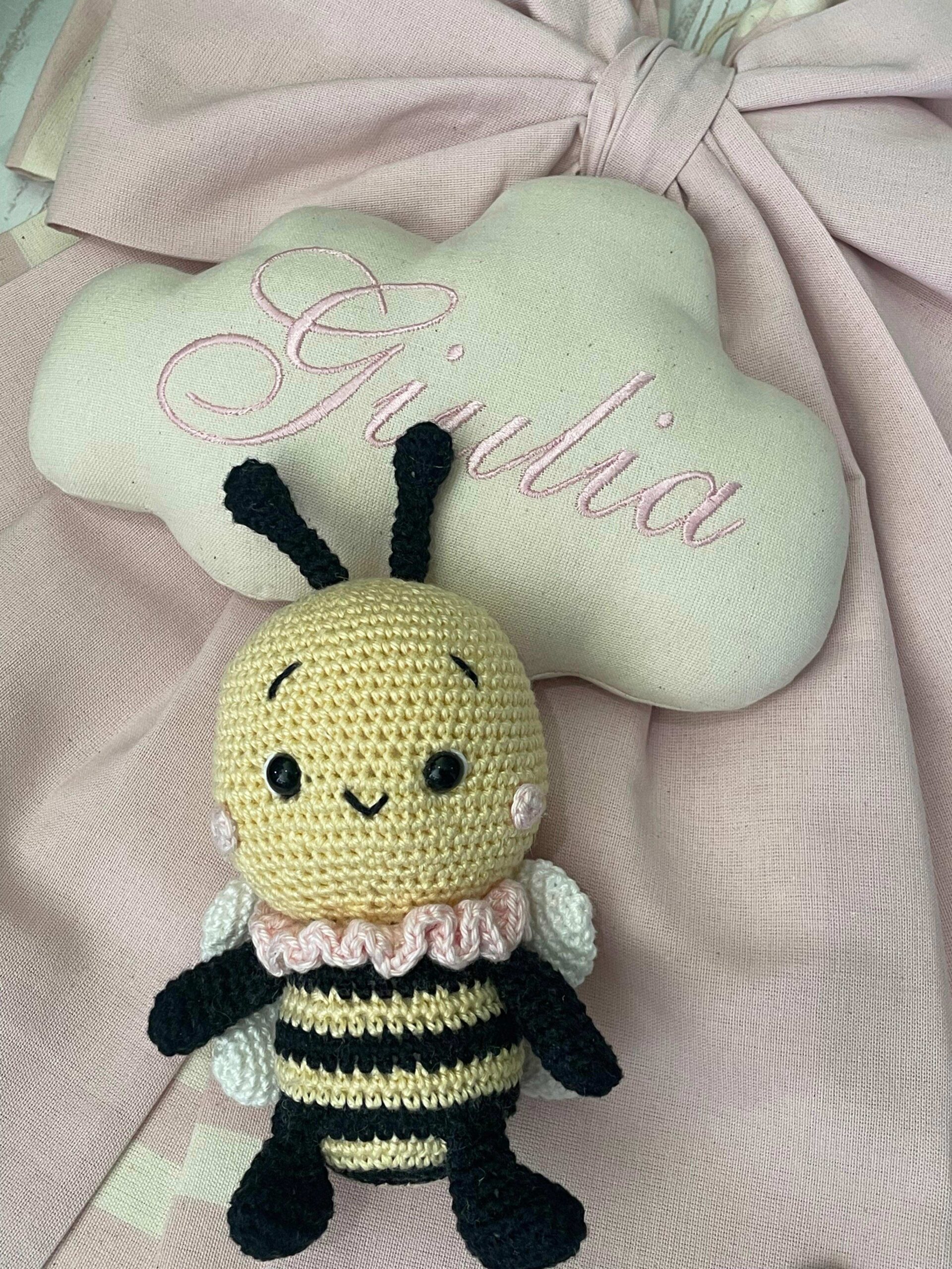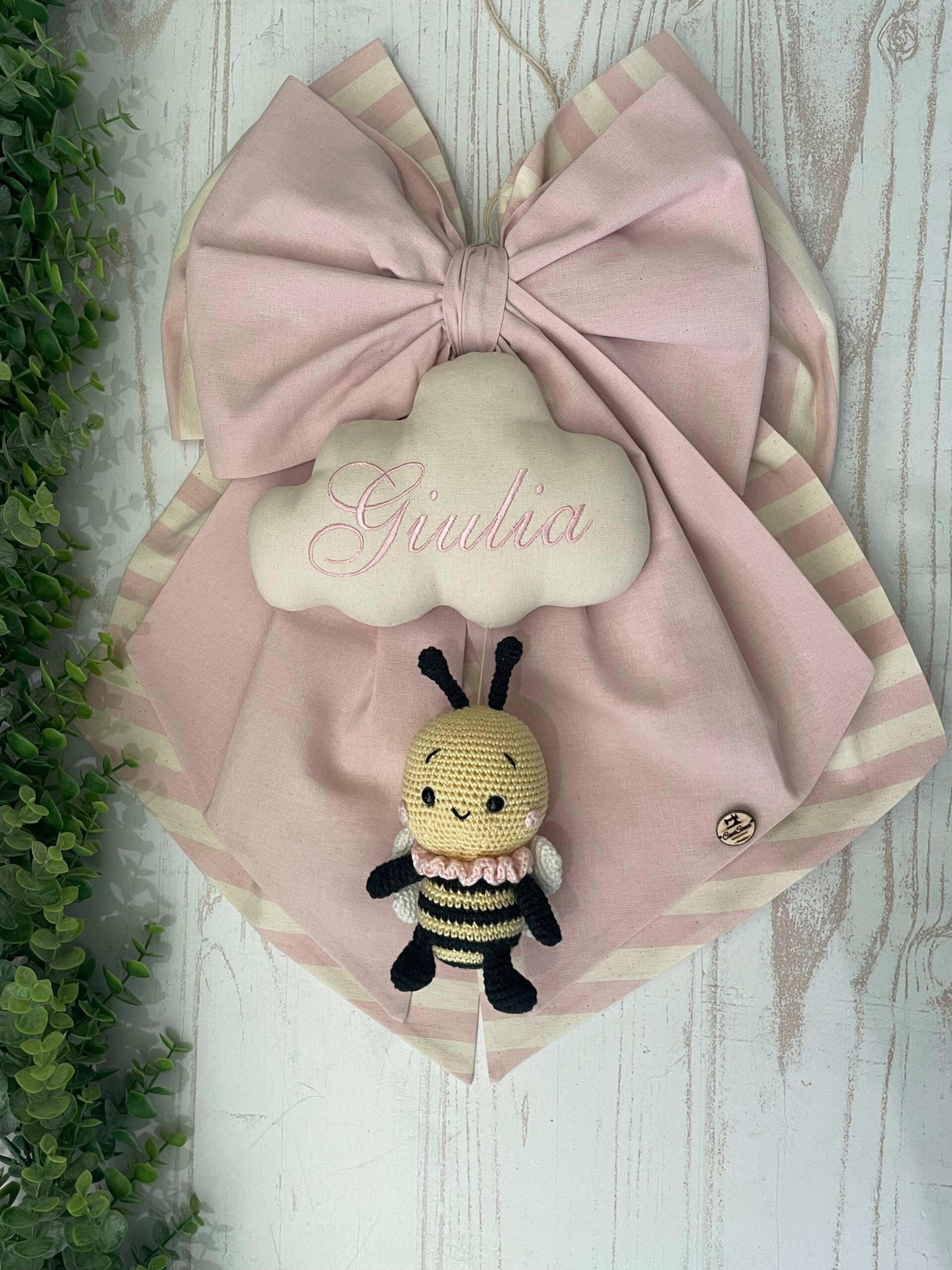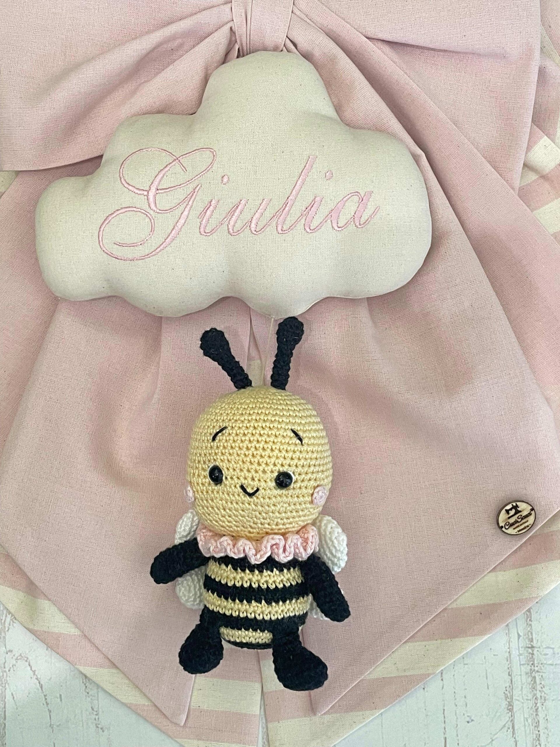 Sul fiocco è applicata una nuvola in tela di cotone con ricamato il nome della bimba (personalizzabile), da cui pende una tenera ape realizzata con la tecnica amigurumi.