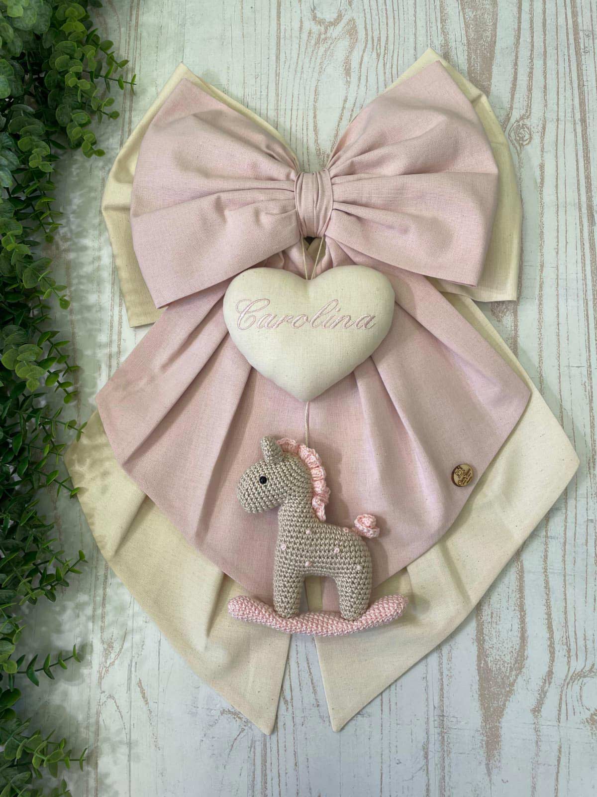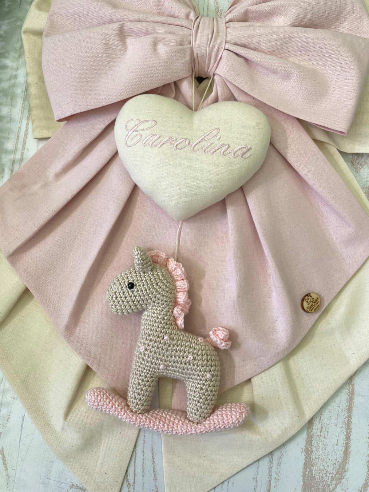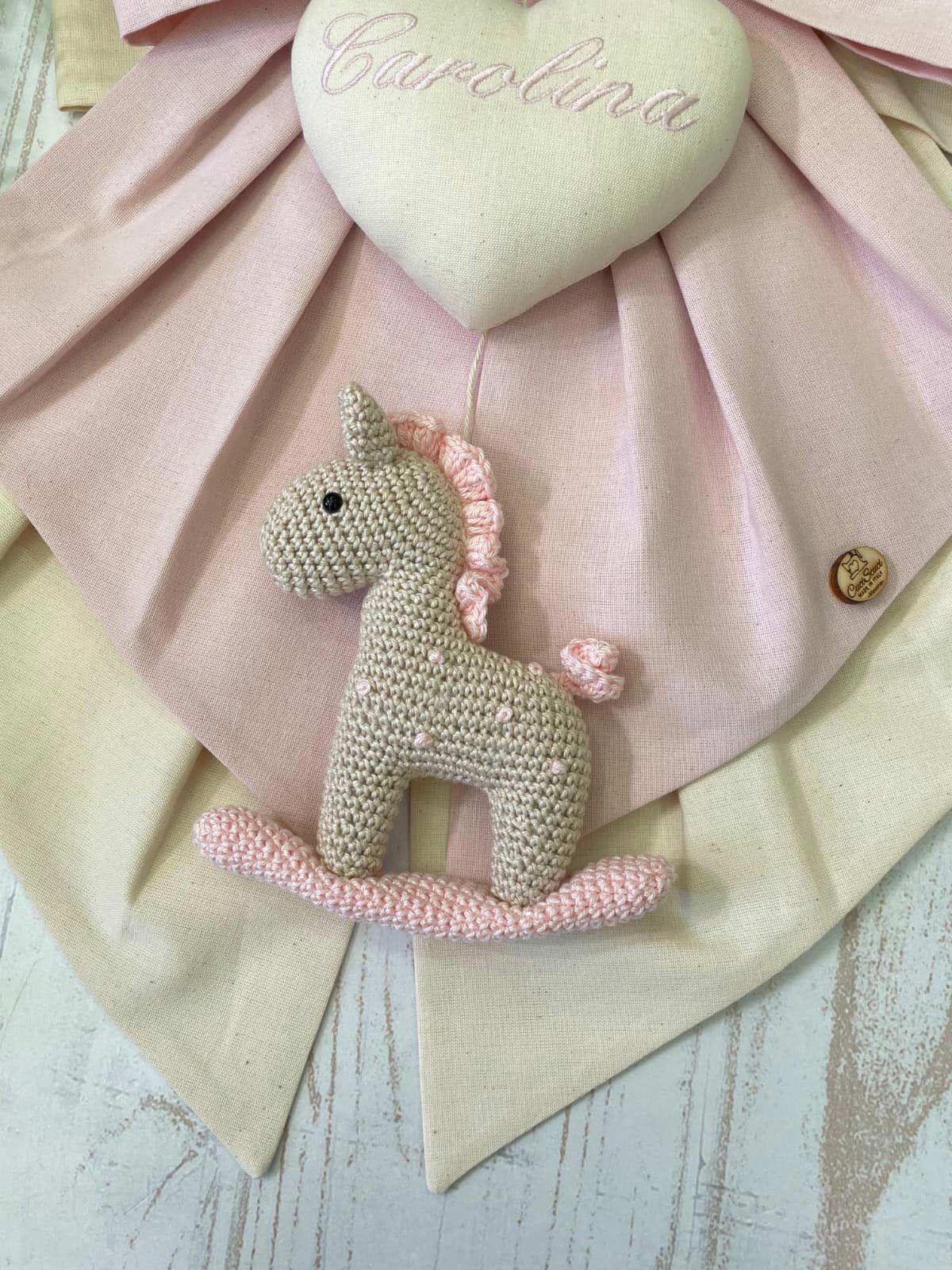 Sul fiocco è applicato un cuore in tessuto con ricamato il nome della bimba (personalizzabile), da cui pende un cavallino a dondolo realizzato con la tecnica amigurumi.