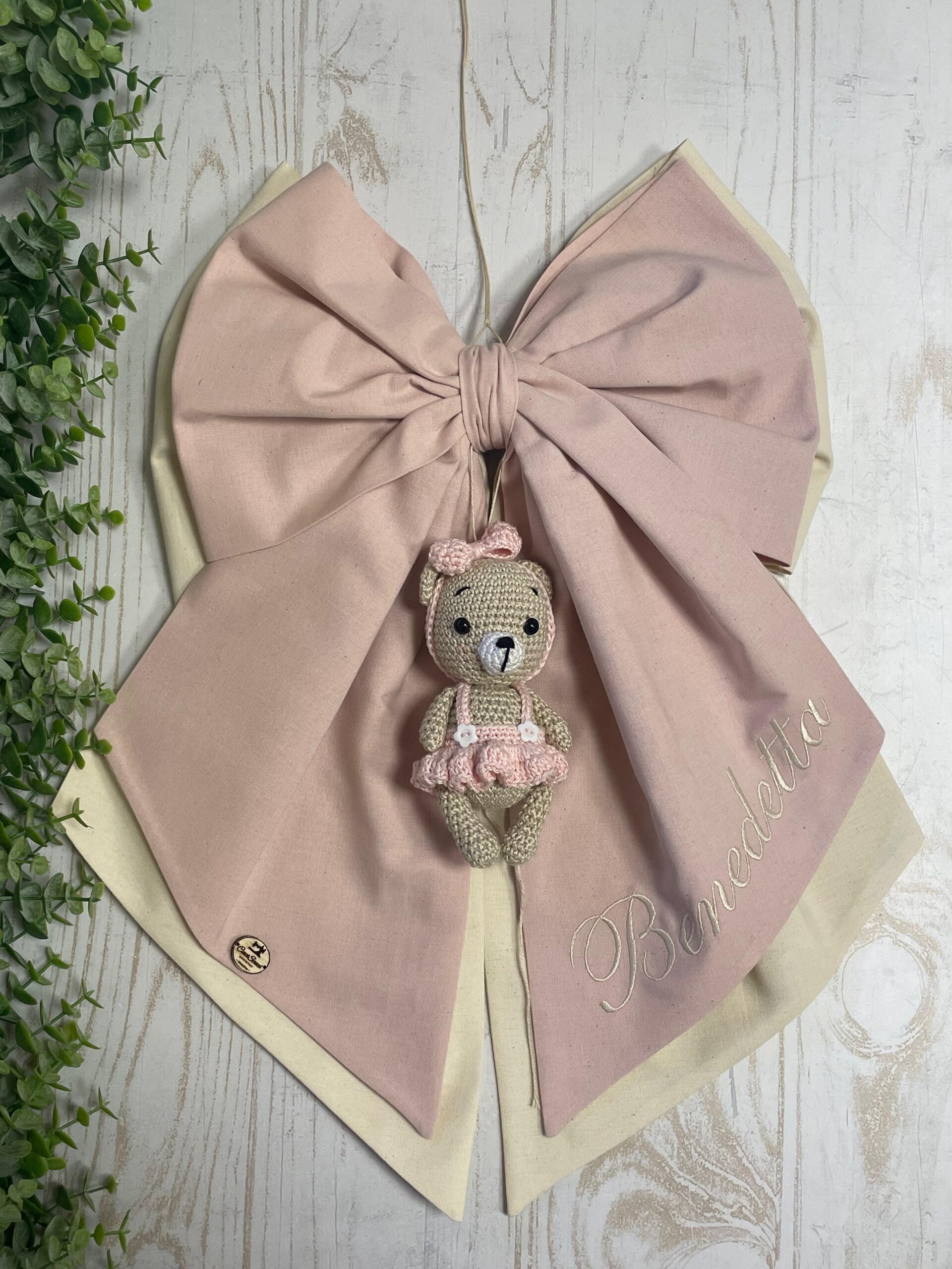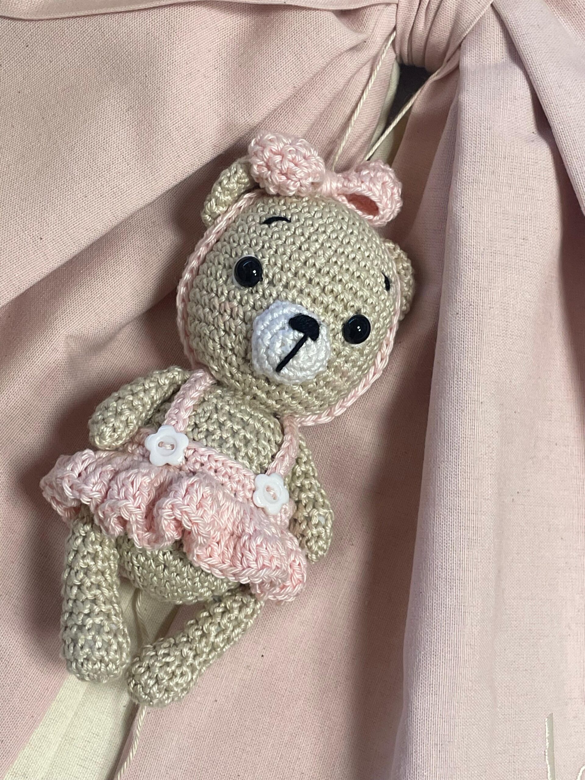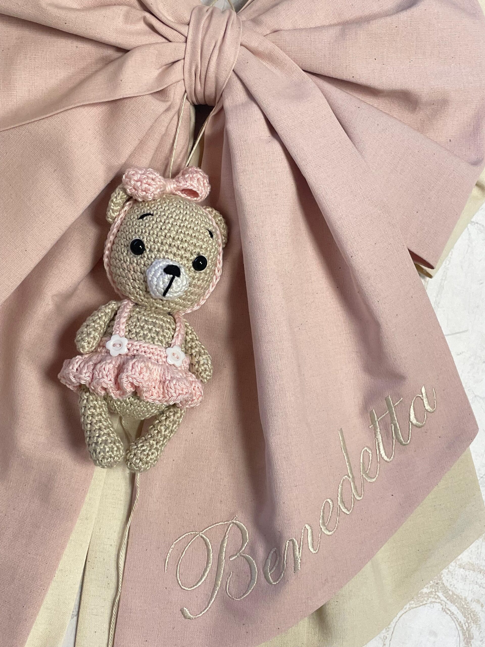 Dal fiocco pende una tenera orsetta realizzata con la tecnica amigurumi.