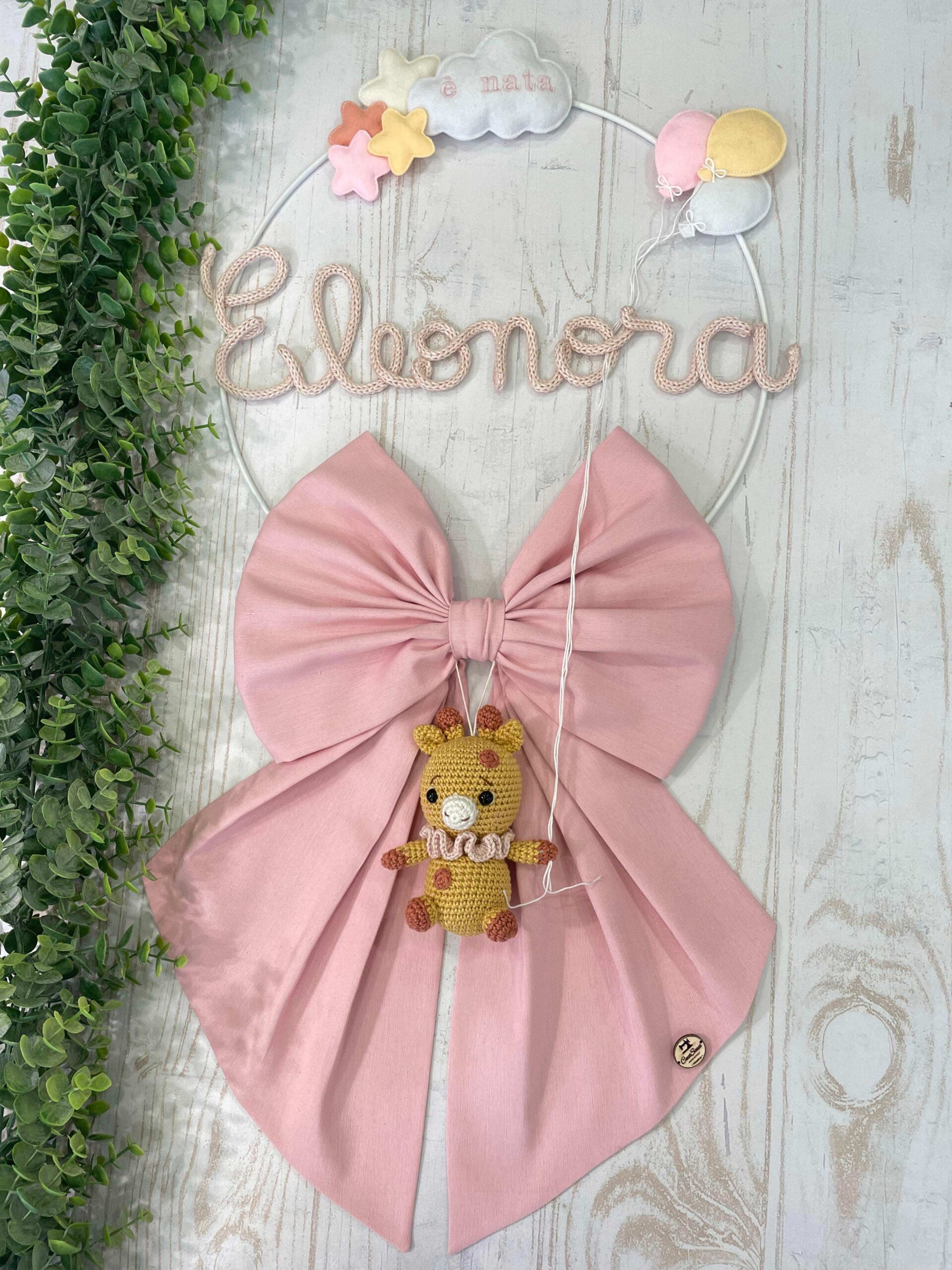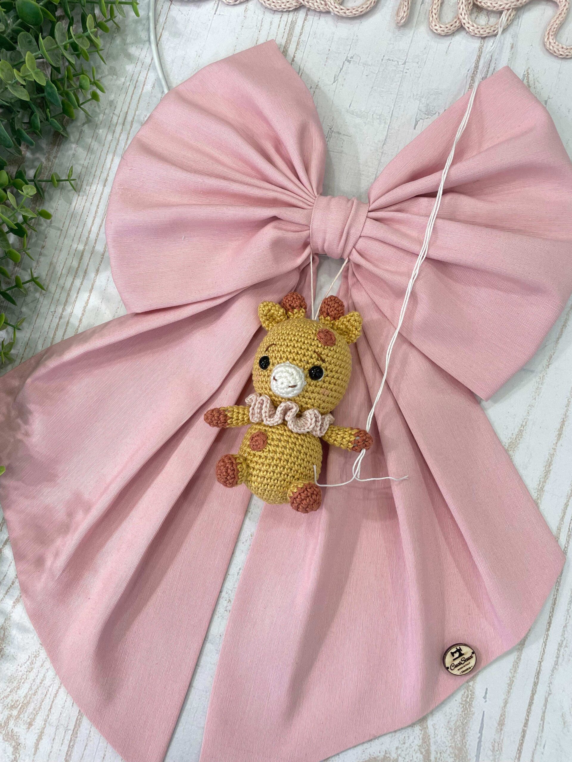 Dal fiocco pende una tenera giraffa tridimensionale realizzata con la tecnica amigurumi.