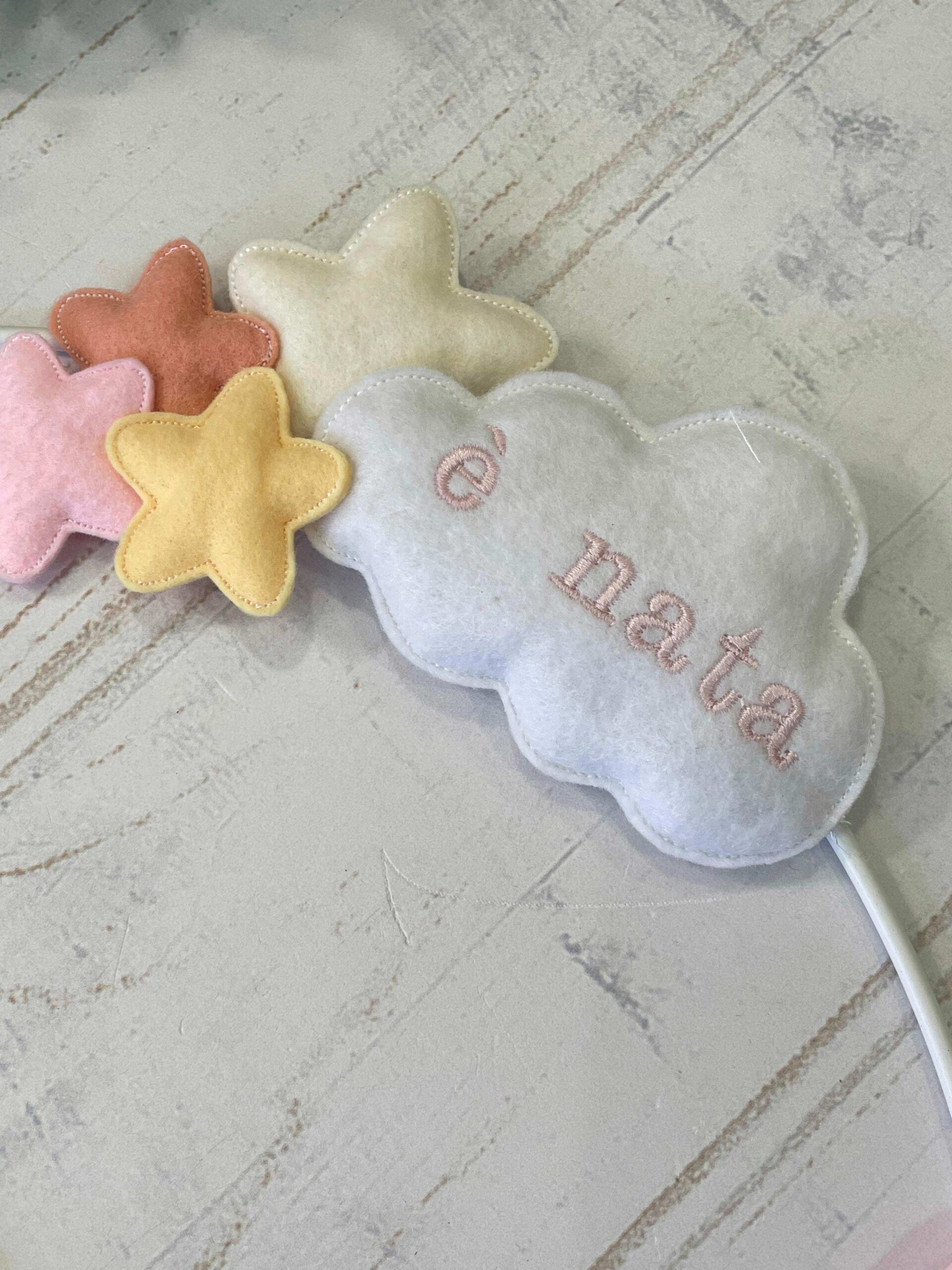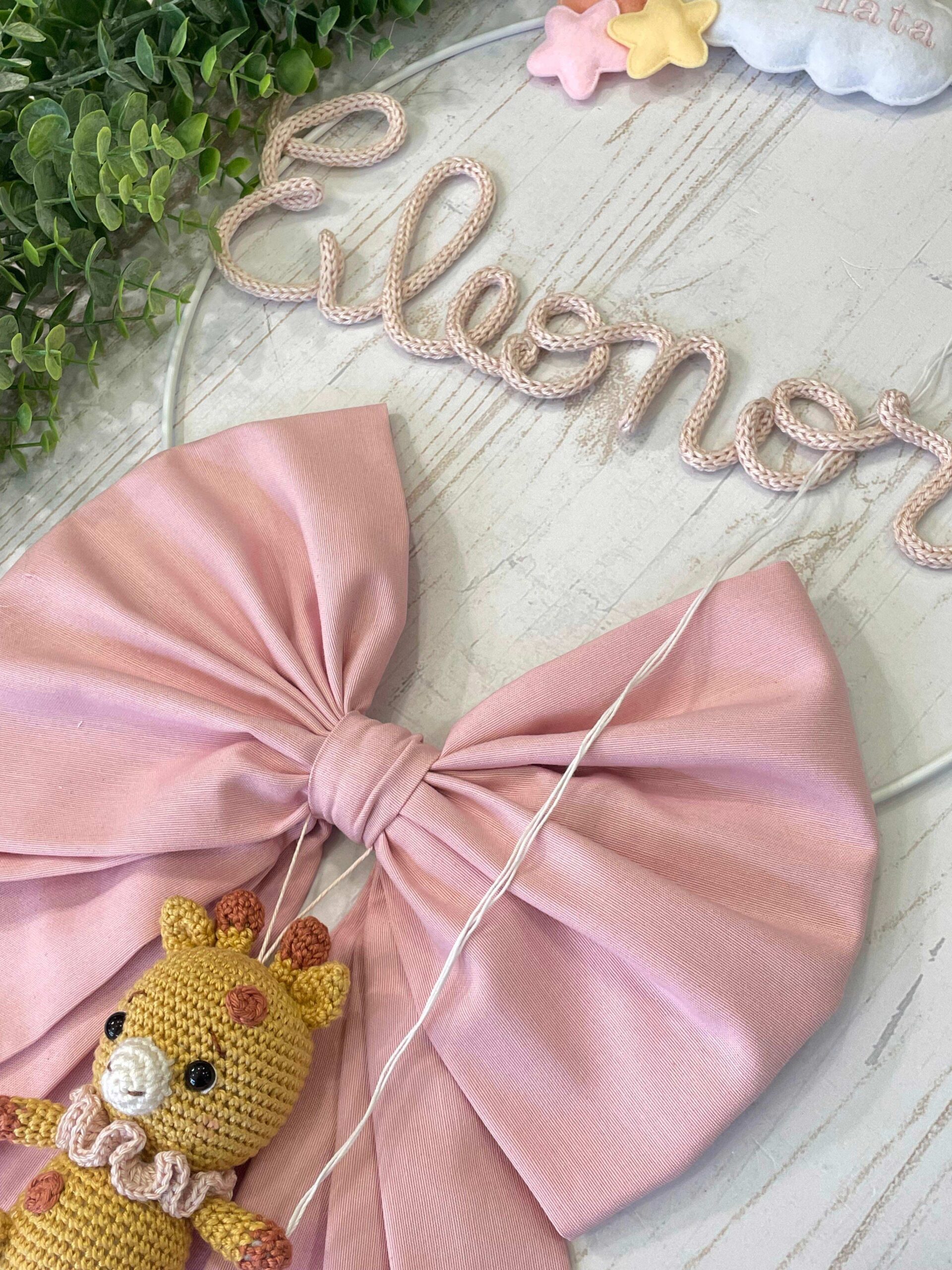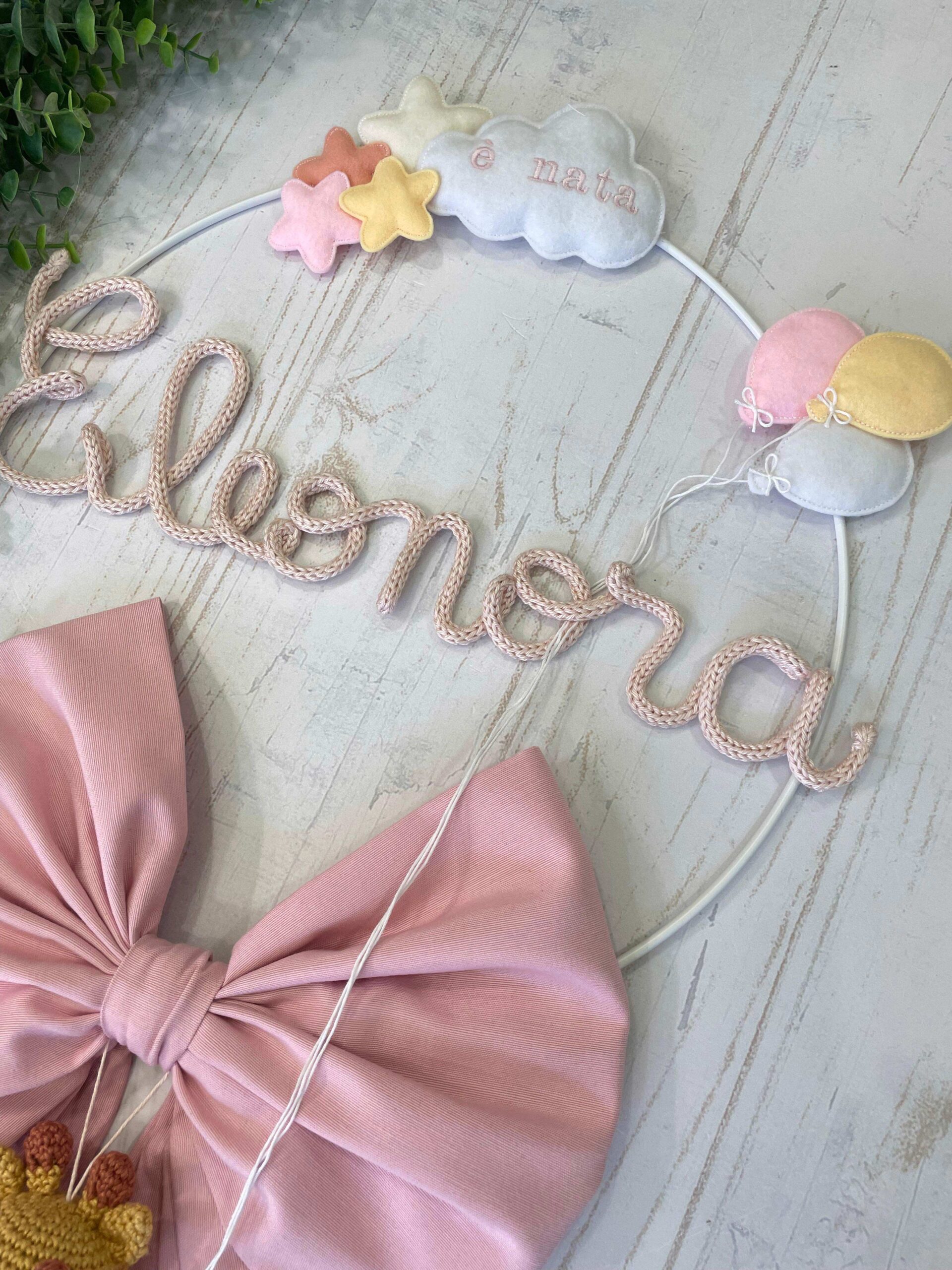 Al centro il nome della bimba in tricotin rosa chiaro.