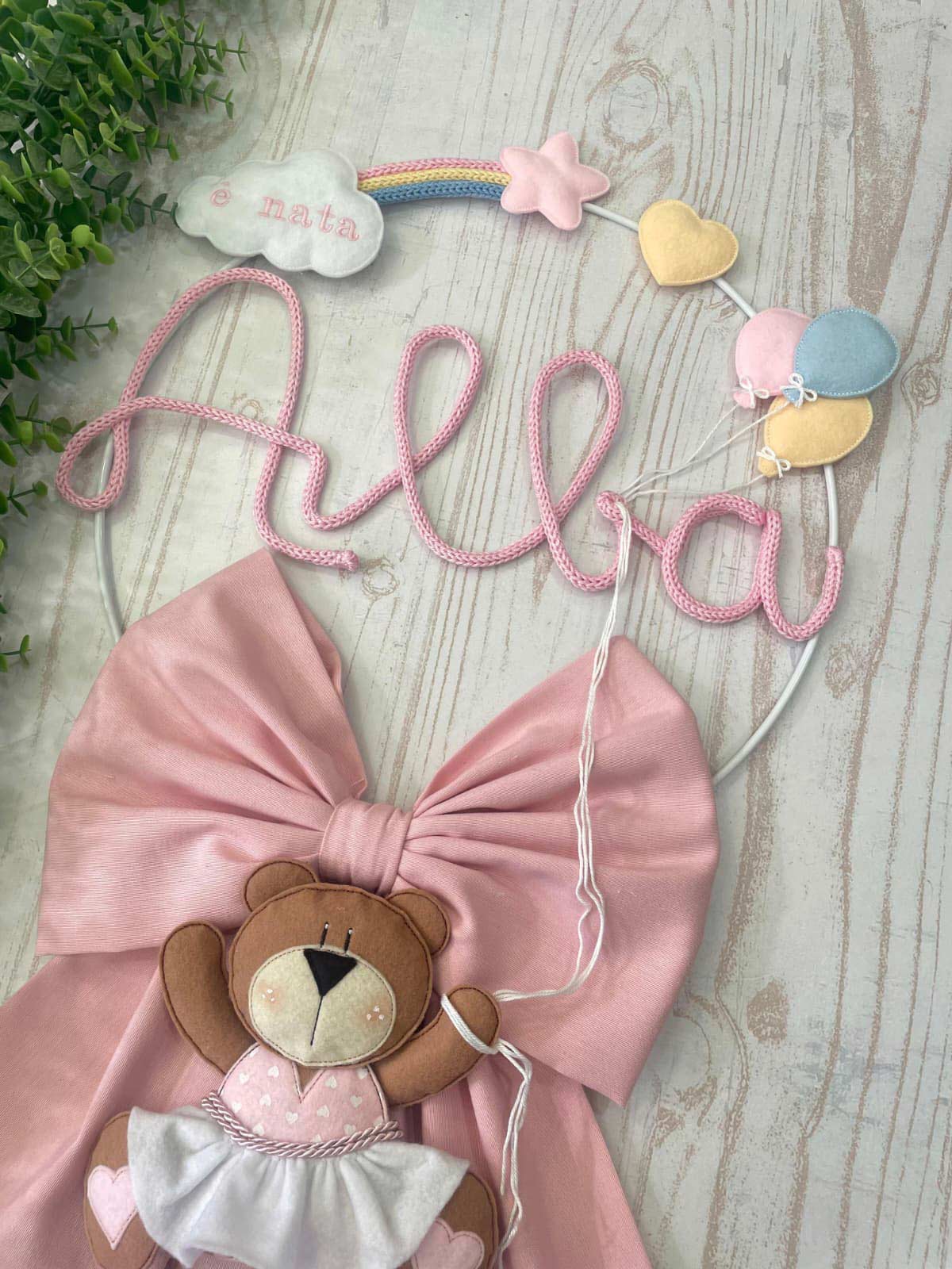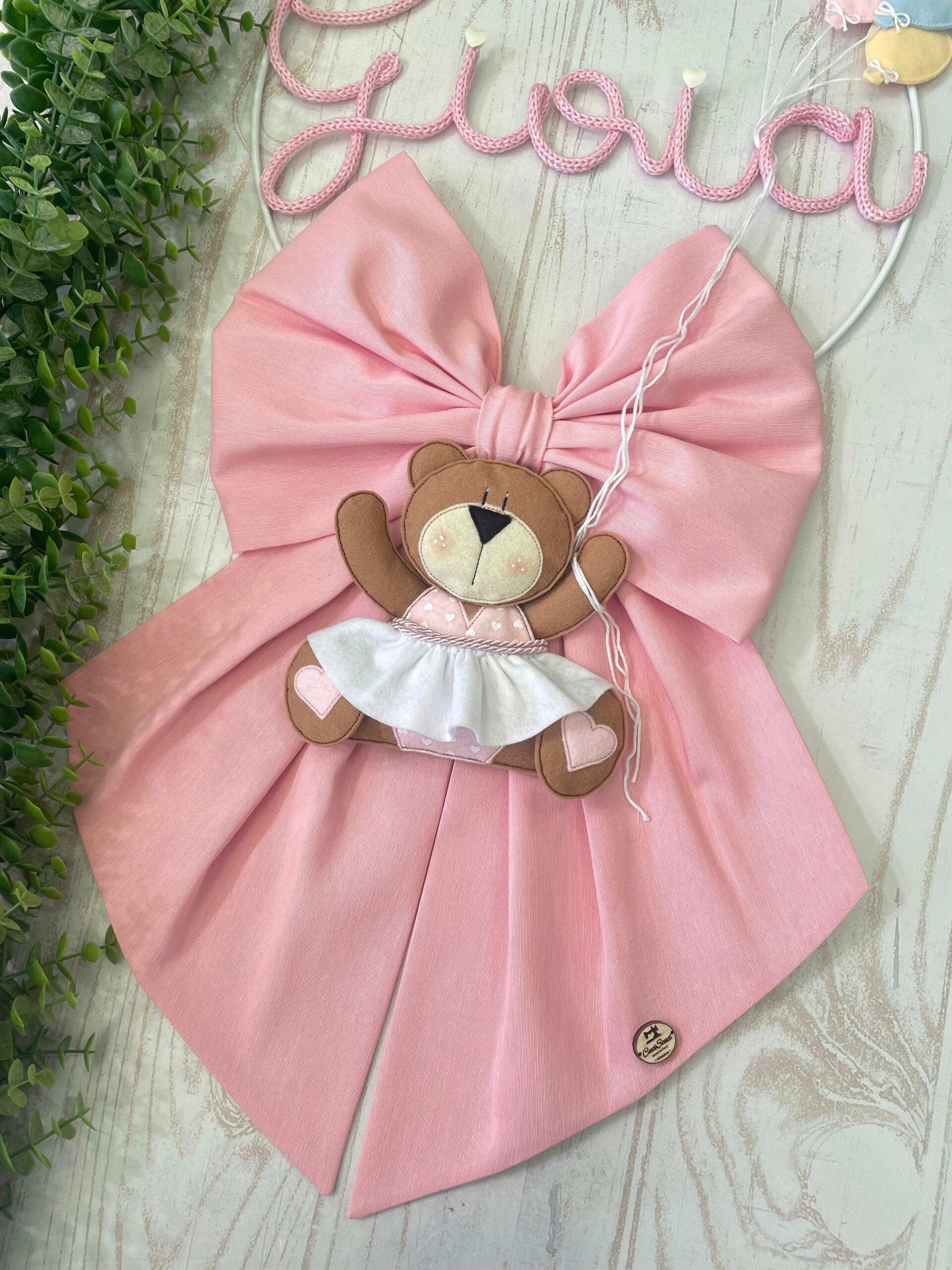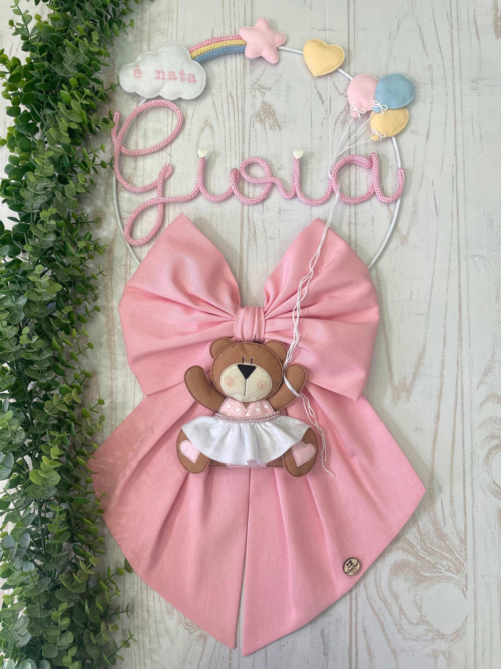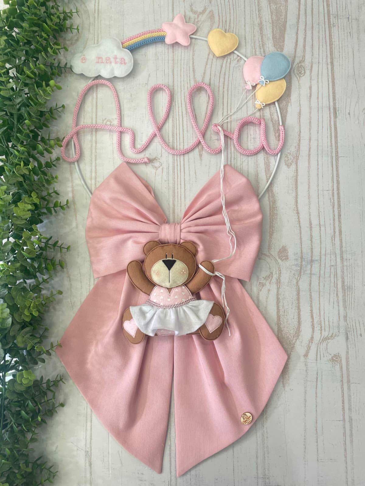 Dal fiocco pende una tenera orsetta, con un grazioso vestitino, in pannolenci tridimensionale, che tiene dei fili che riconducono ai palloncini della parte superiore.