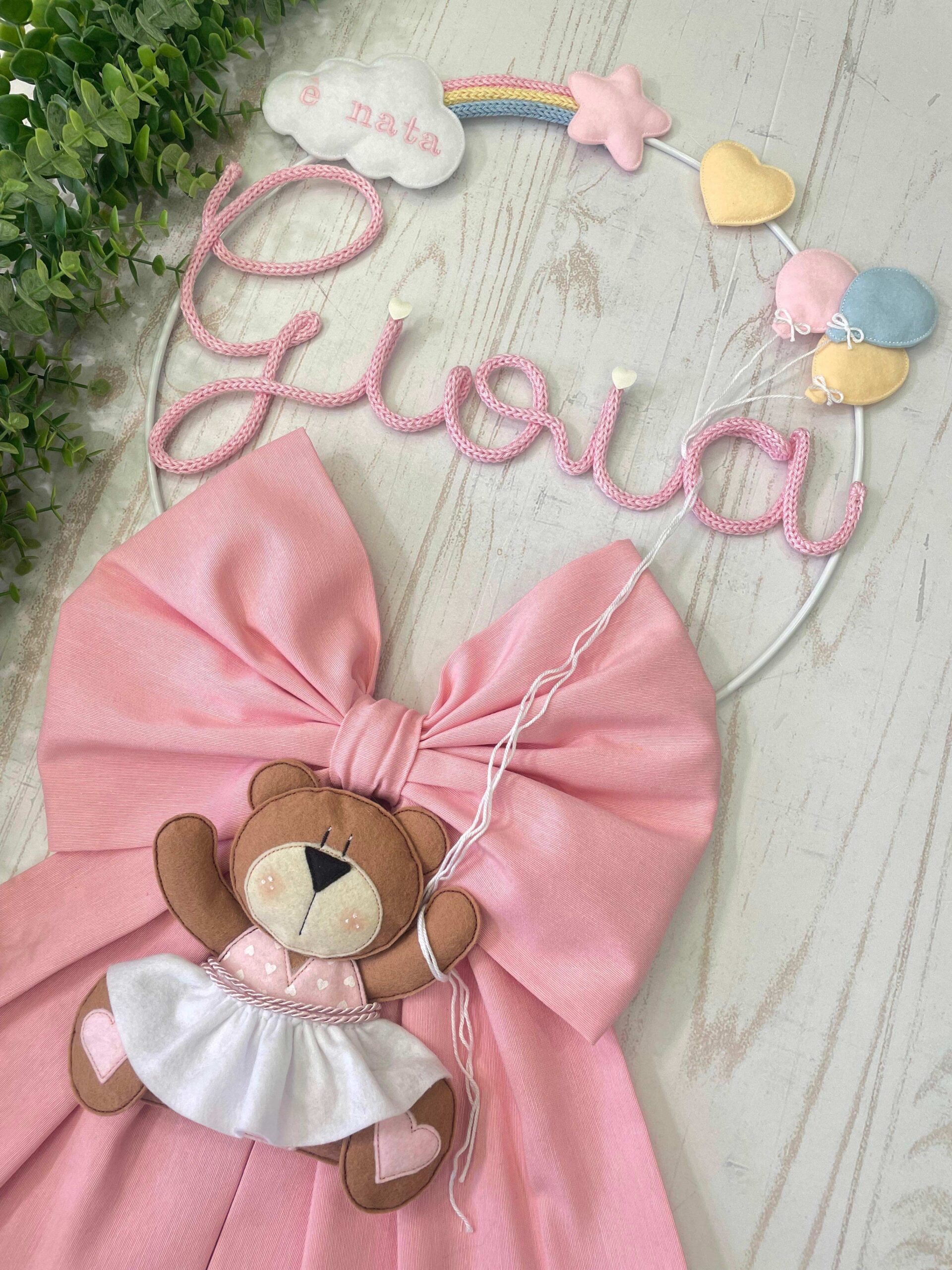 Al centro il nome della bimba (personalizzabile) in tricotin rosa.