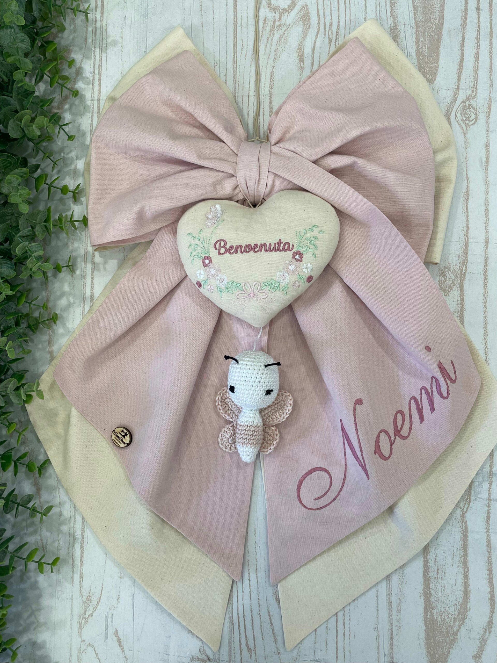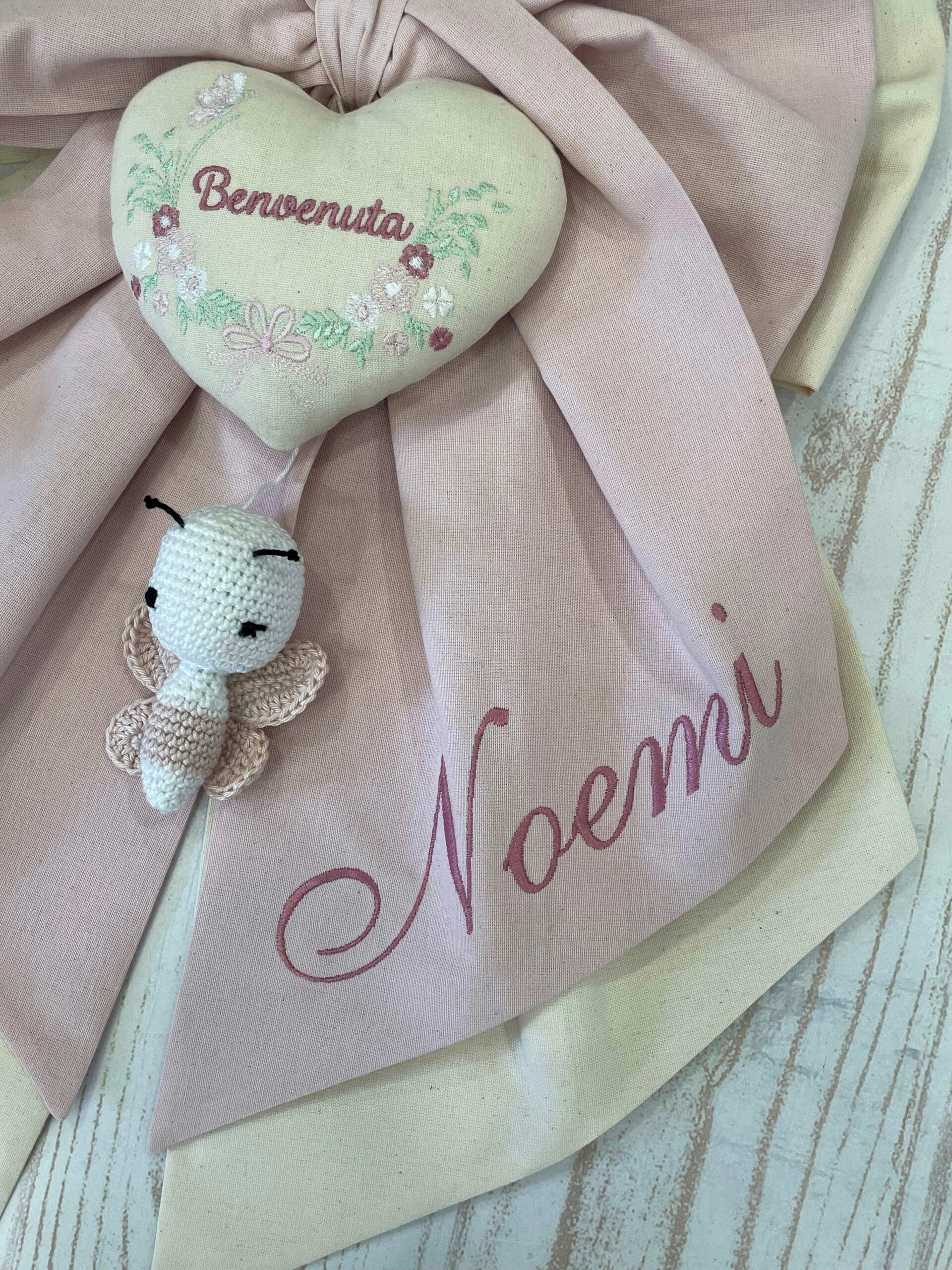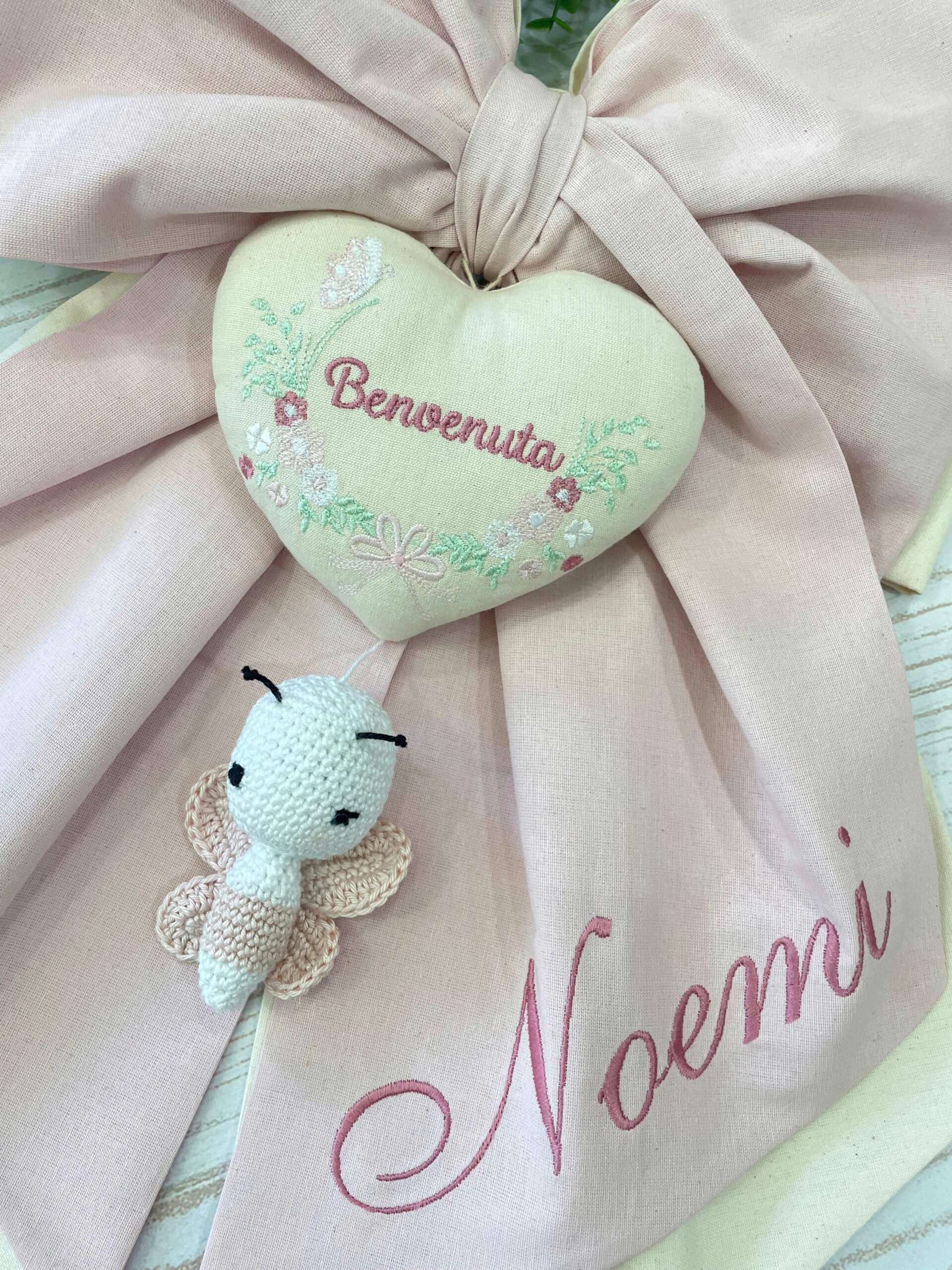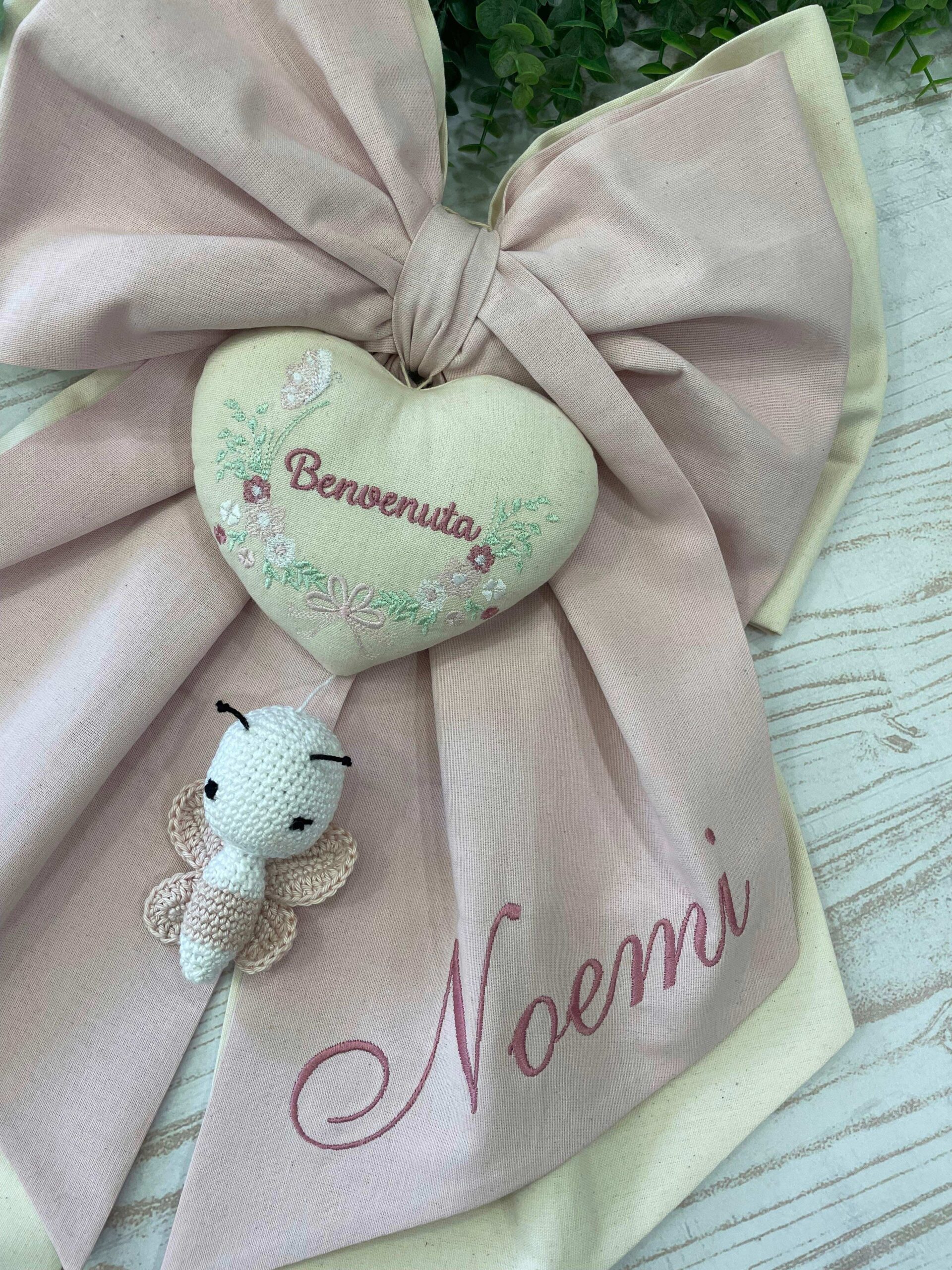 Sul fiocco più piccolo è ricamato il nome della bambina (personalizzabile), ed è applicato un cuore bianco in pannolenci con ricamata la parola “benvenuta”.