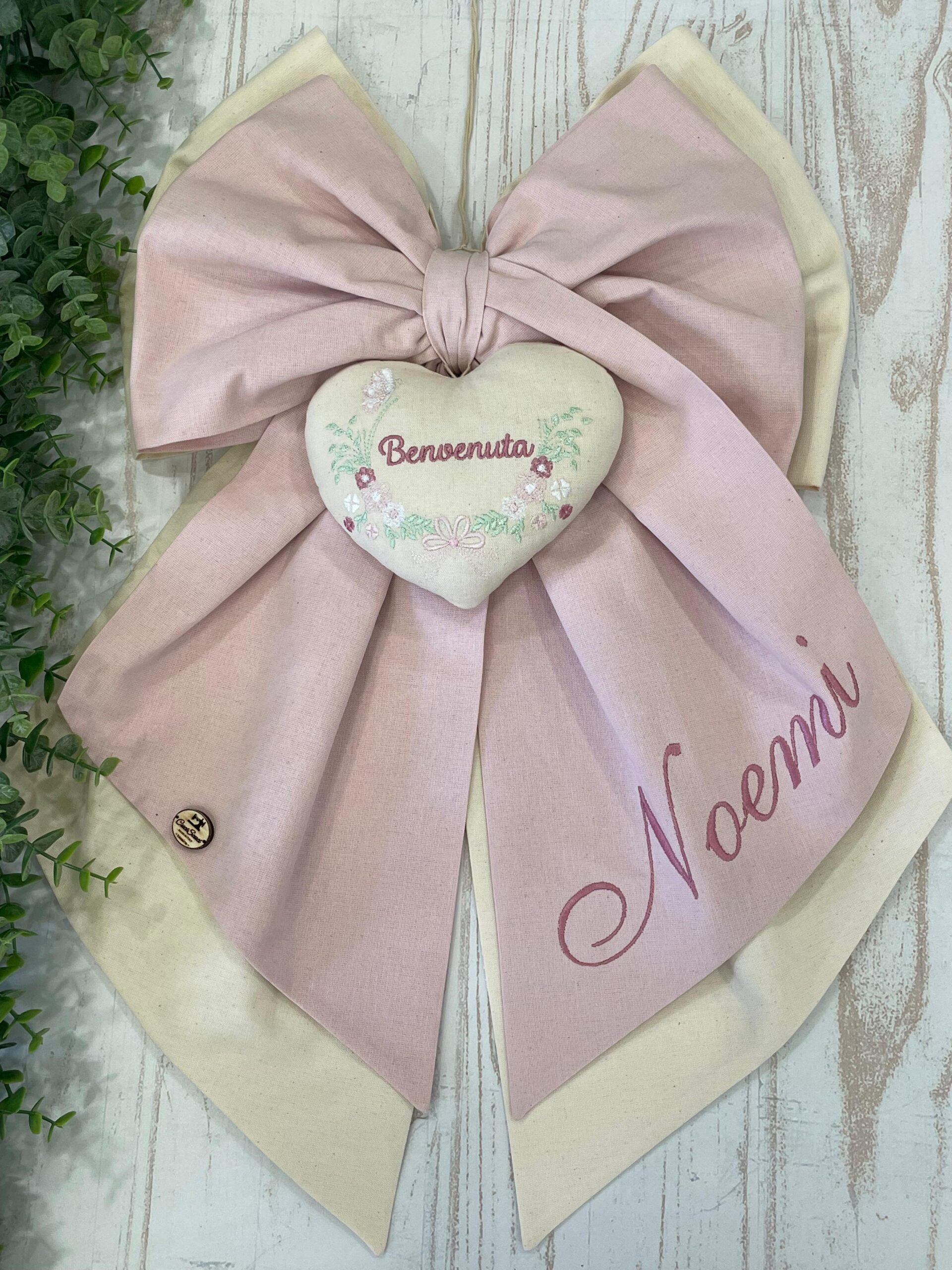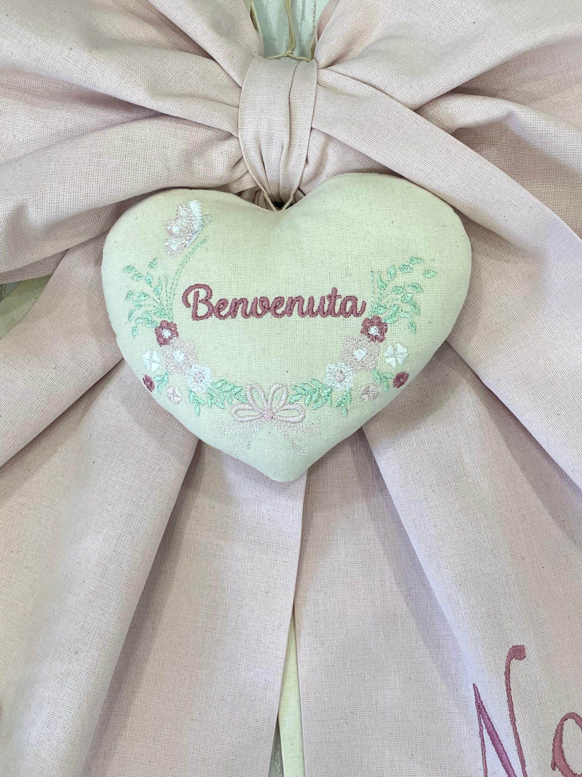 Dal fiocco pende un cuore bianco in pannolenci con ricamata la parola “benvenuta”.