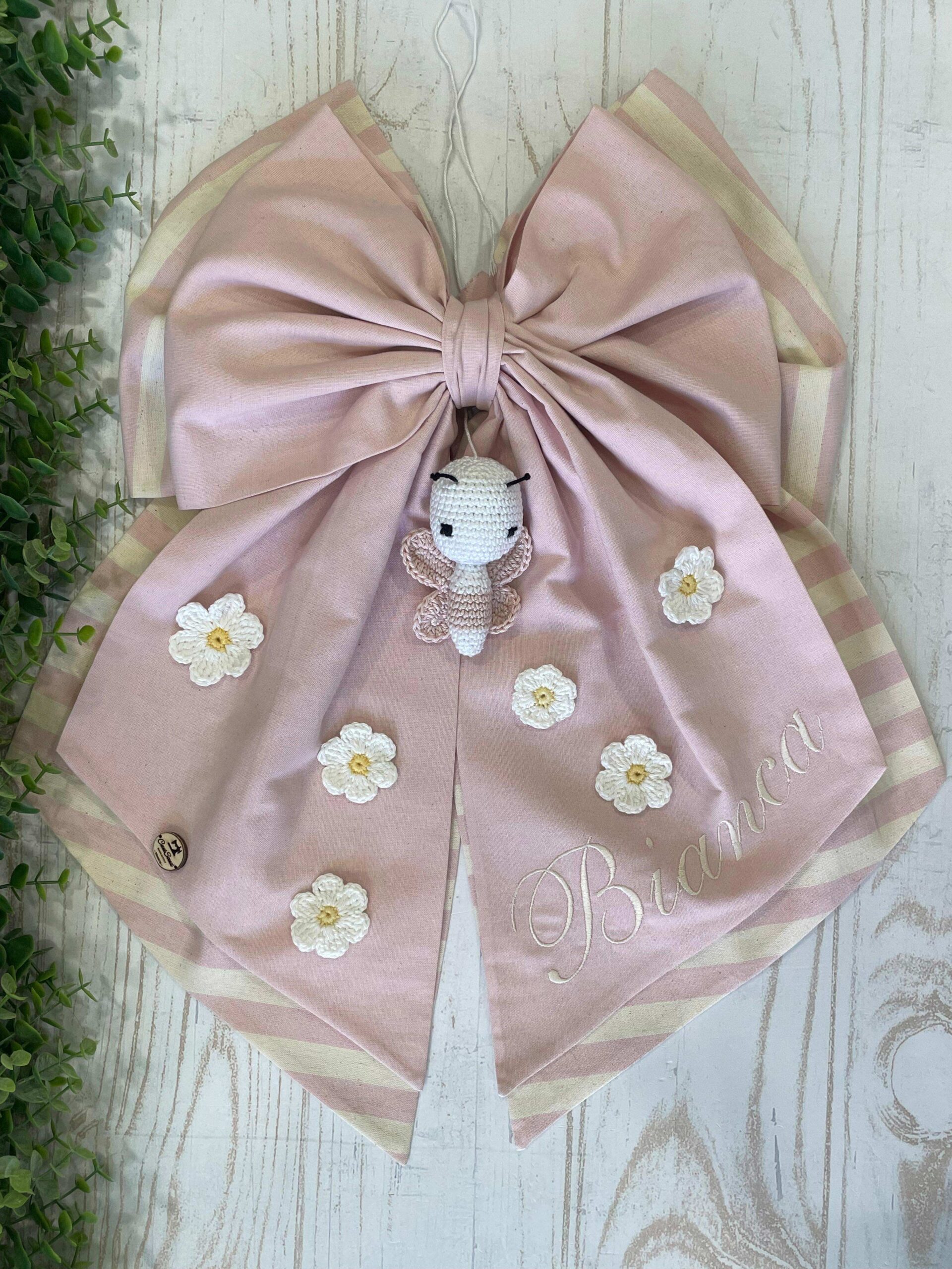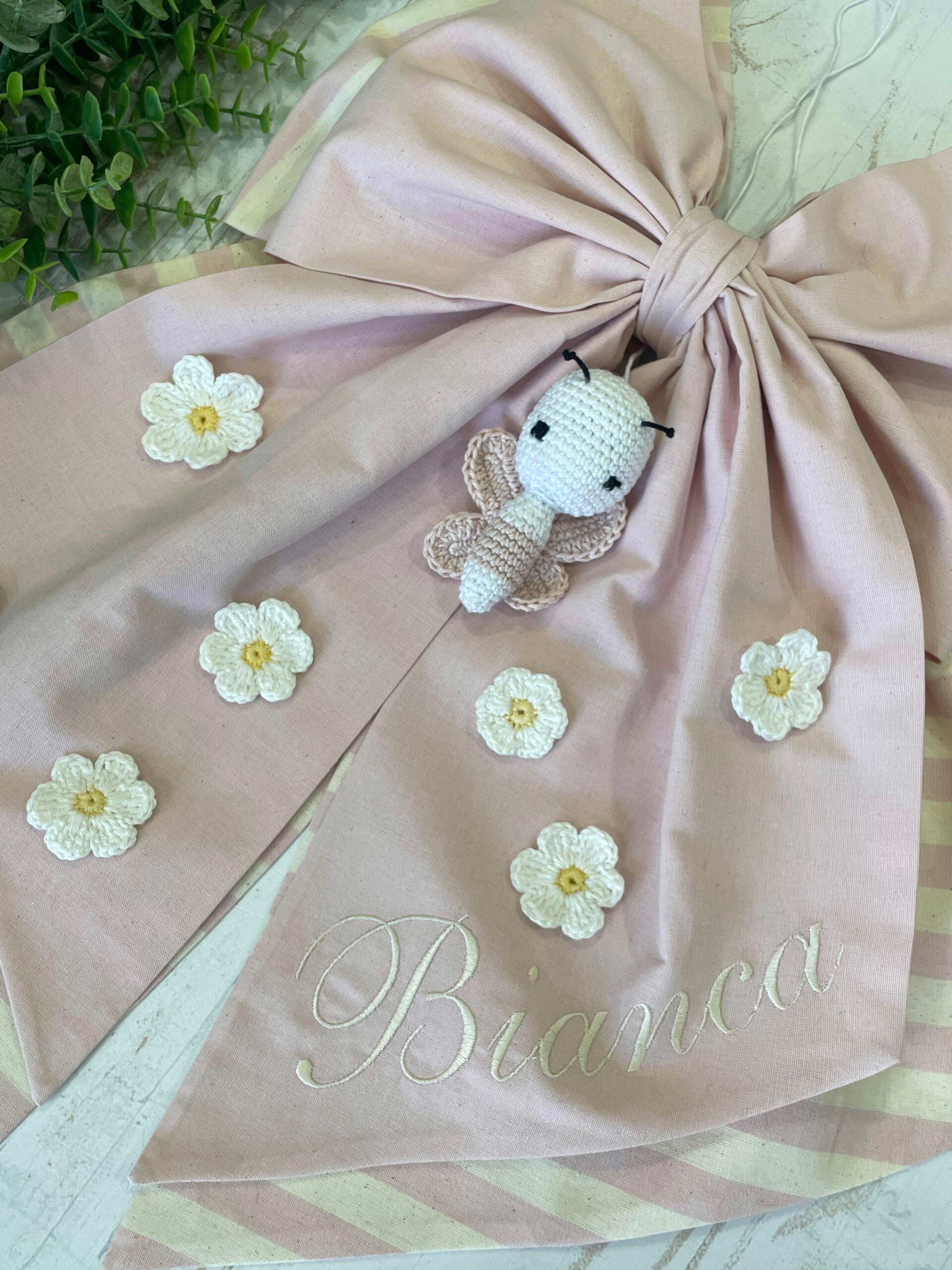 Sul fiocco più piccolo è ricamato il nome della bambina (personalizzabile), e sono applicate delle margherite in crochet.