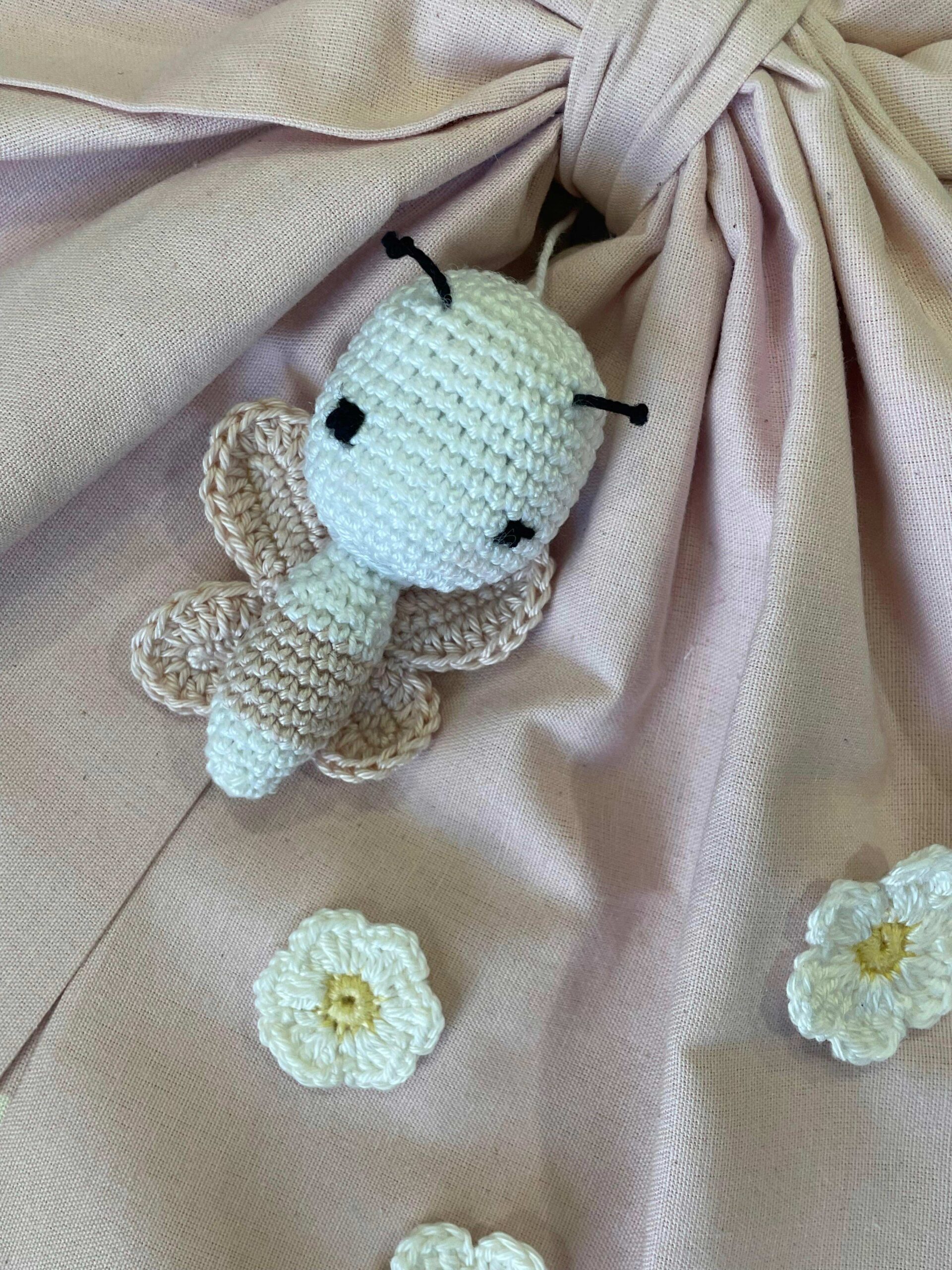 Dal fiocco pende una tenera farfalla realizzata con la tecnica amigurumi.