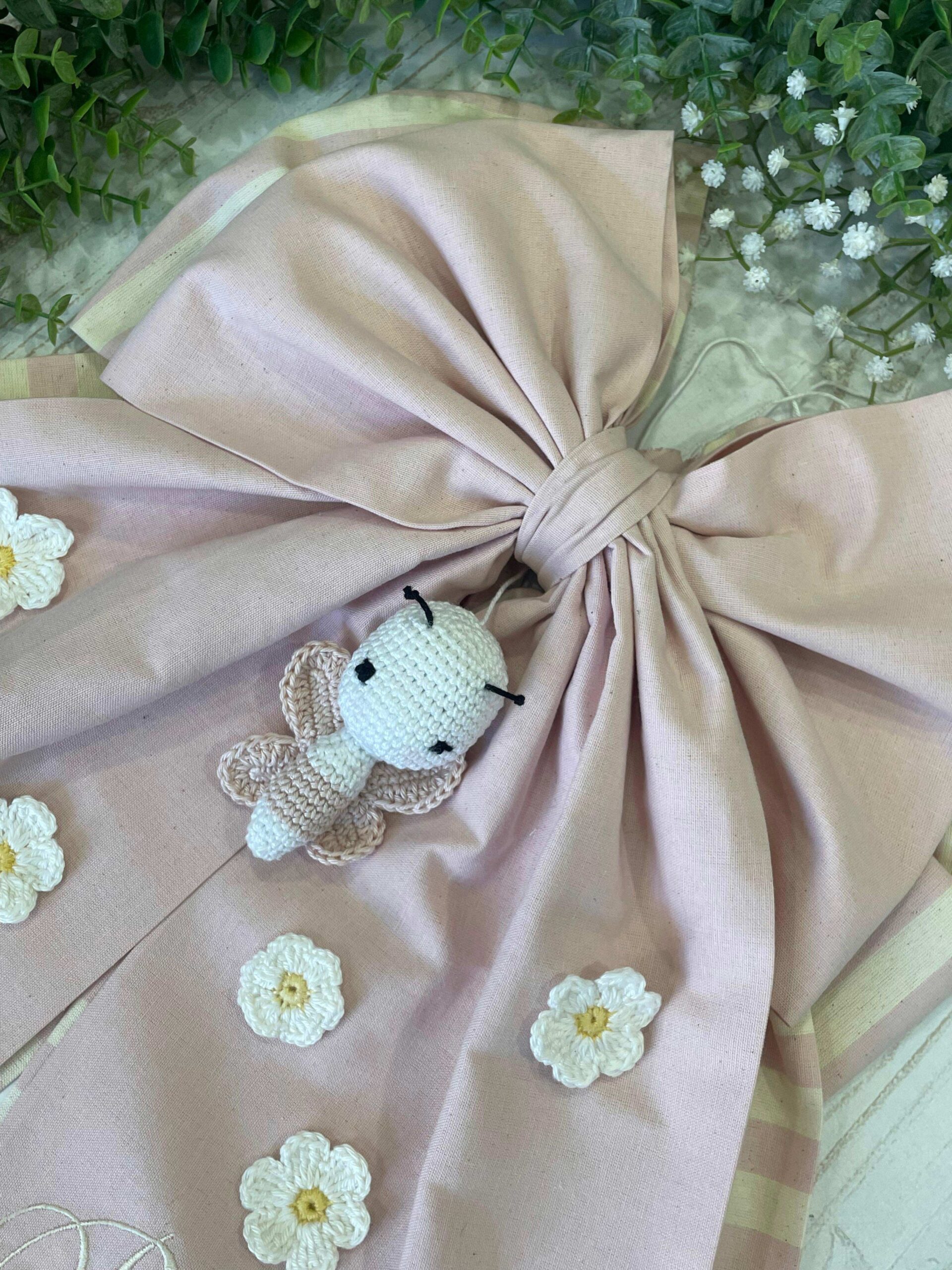 Il fiocco, in cotone tinto filo panna, è stato realizzato interamente a mano dalla nostra sartoria; un fiocco rosa più piccolo è applicato su quello più grande.
