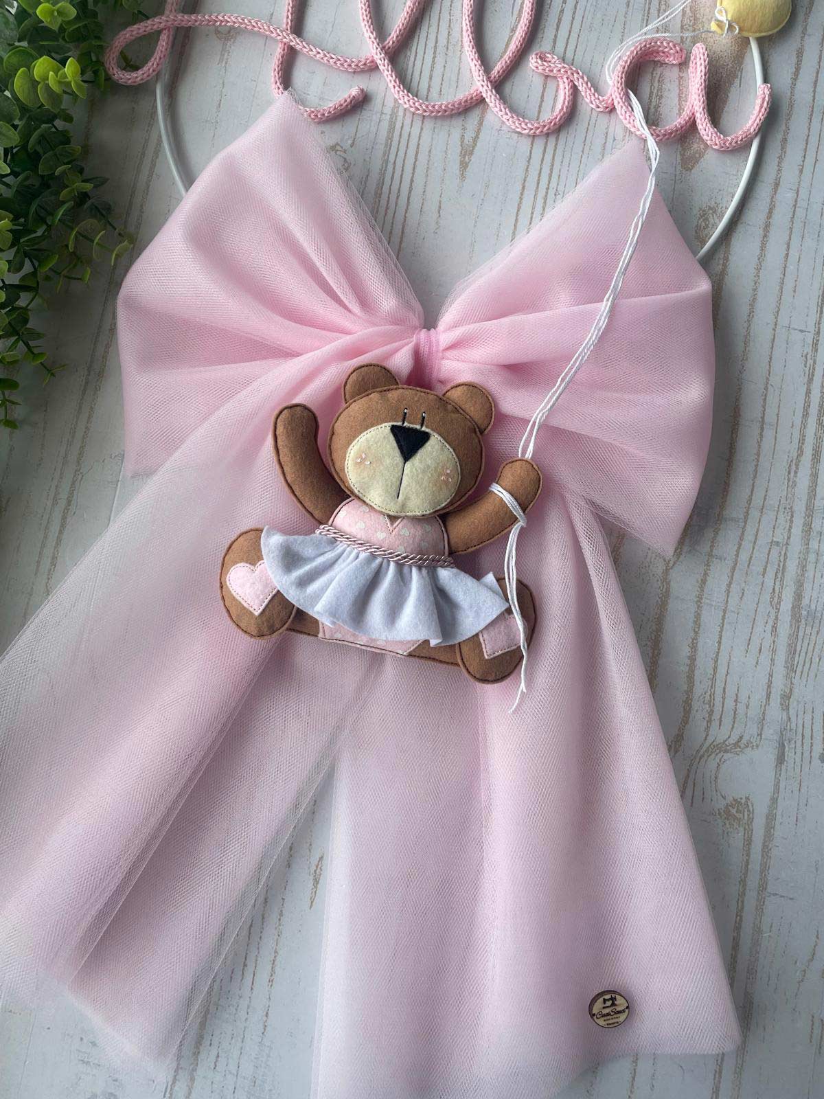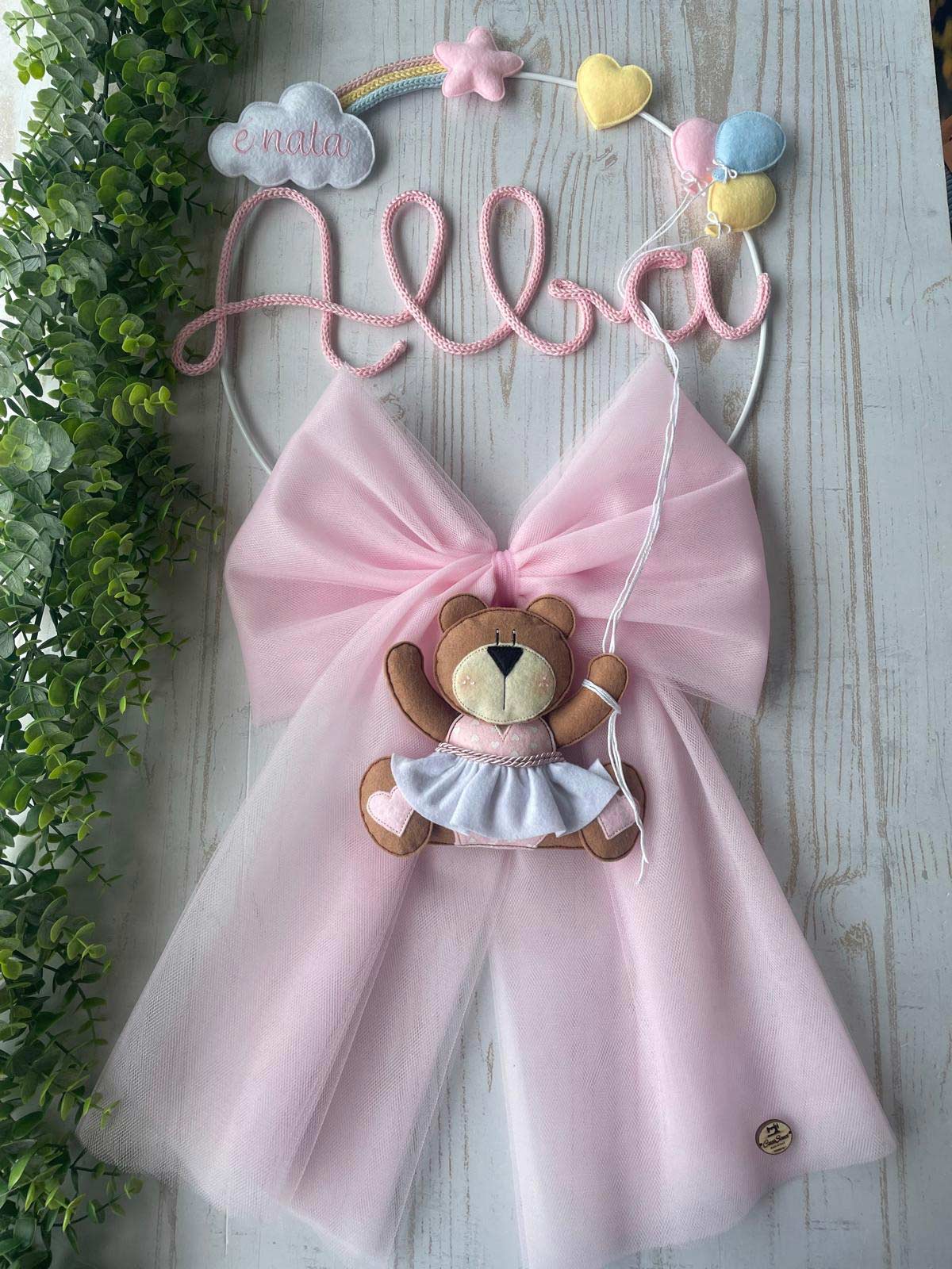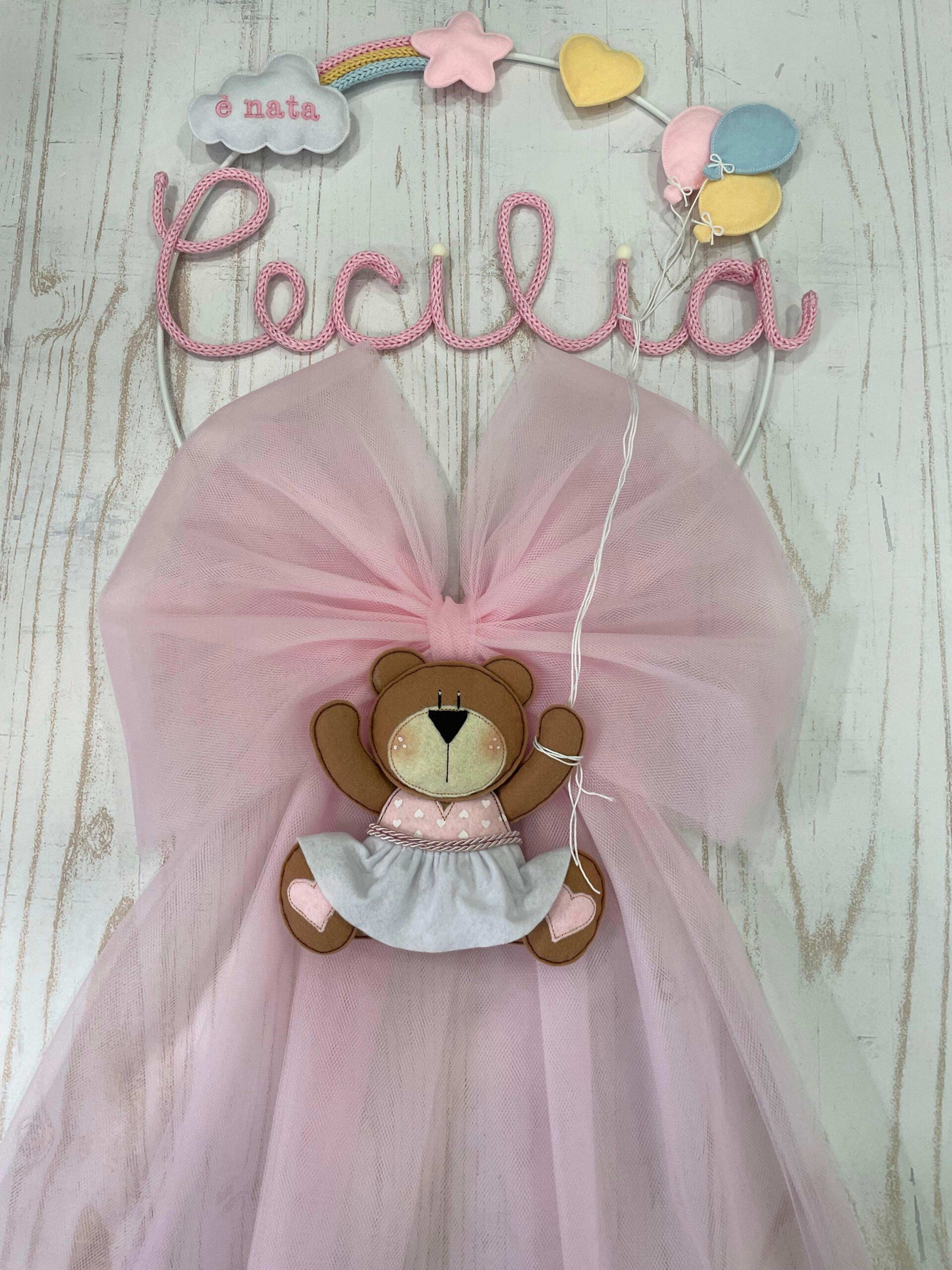 Dal fiocco pende una tenera orsetta, con un grazioso vestitino, in pannolenci tridimensionale, che tiene dei fili che riconducono ai palloncini della parte superiore.
