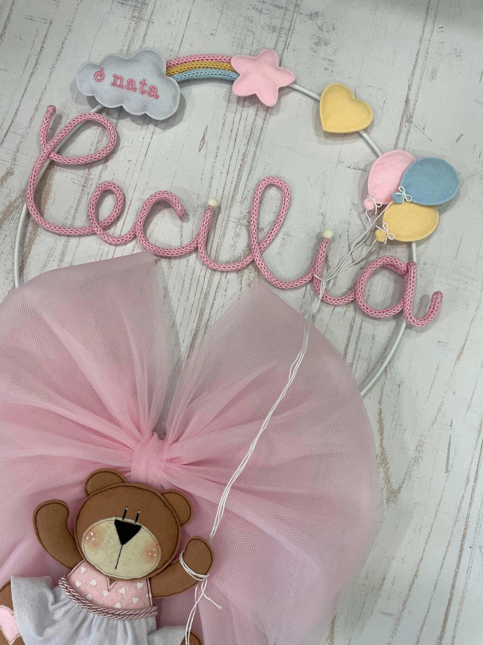Al centro il nome della bimba (personalizzabile) in tricotin rosa.