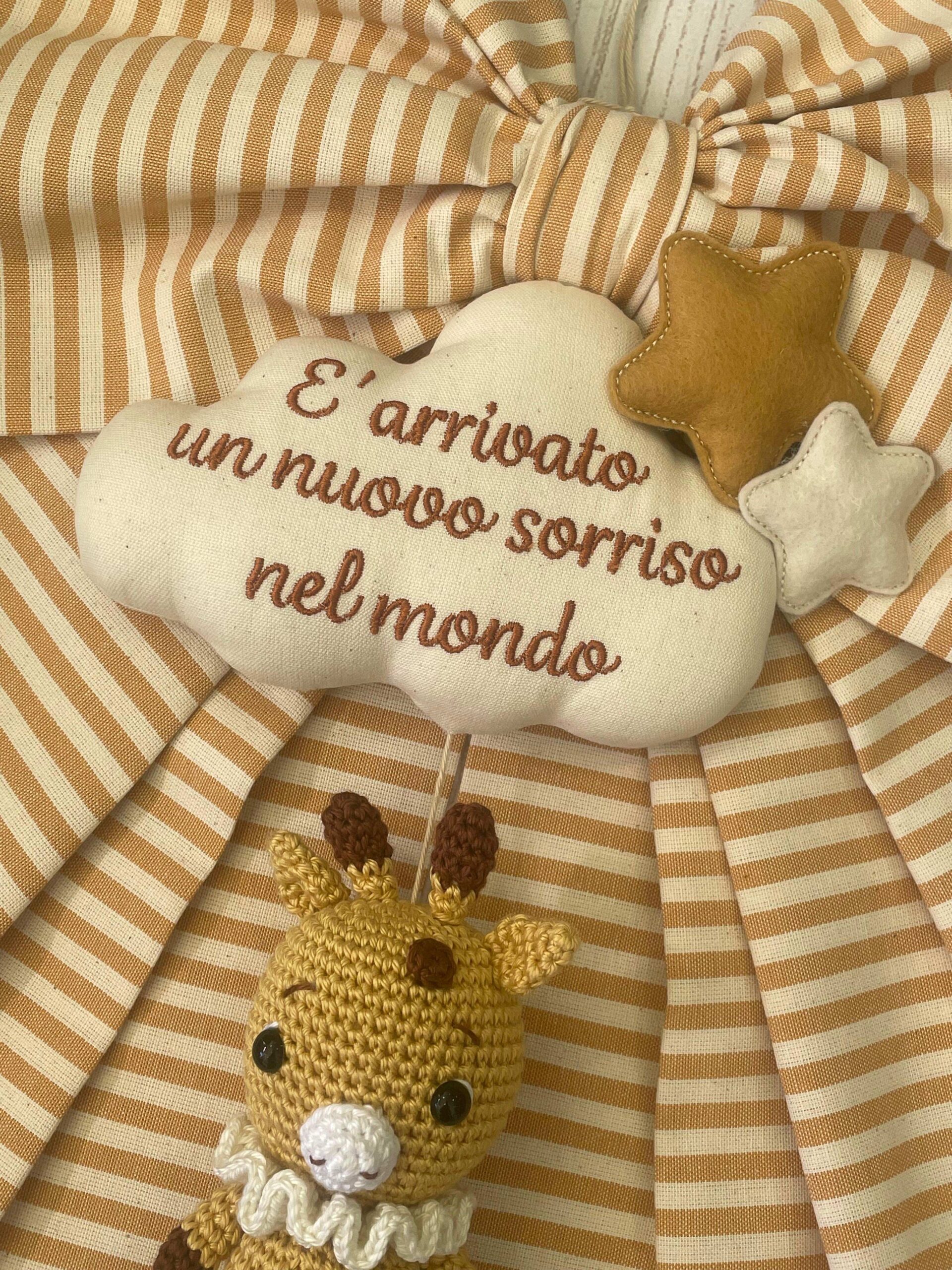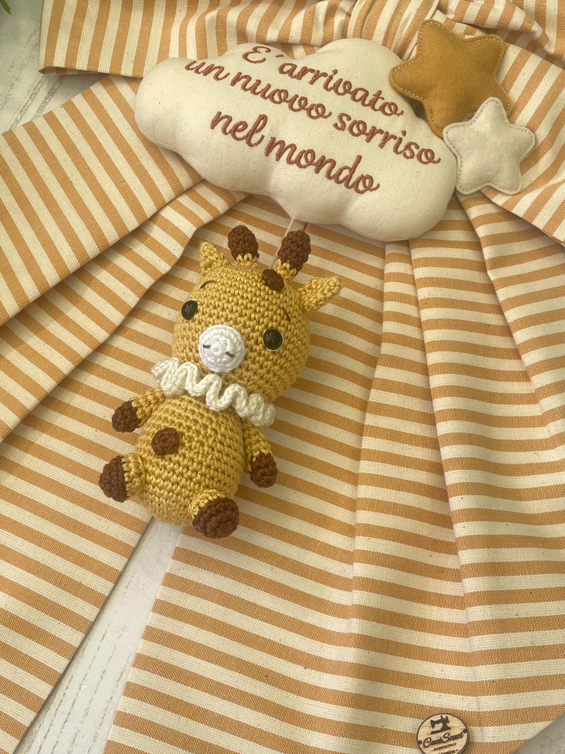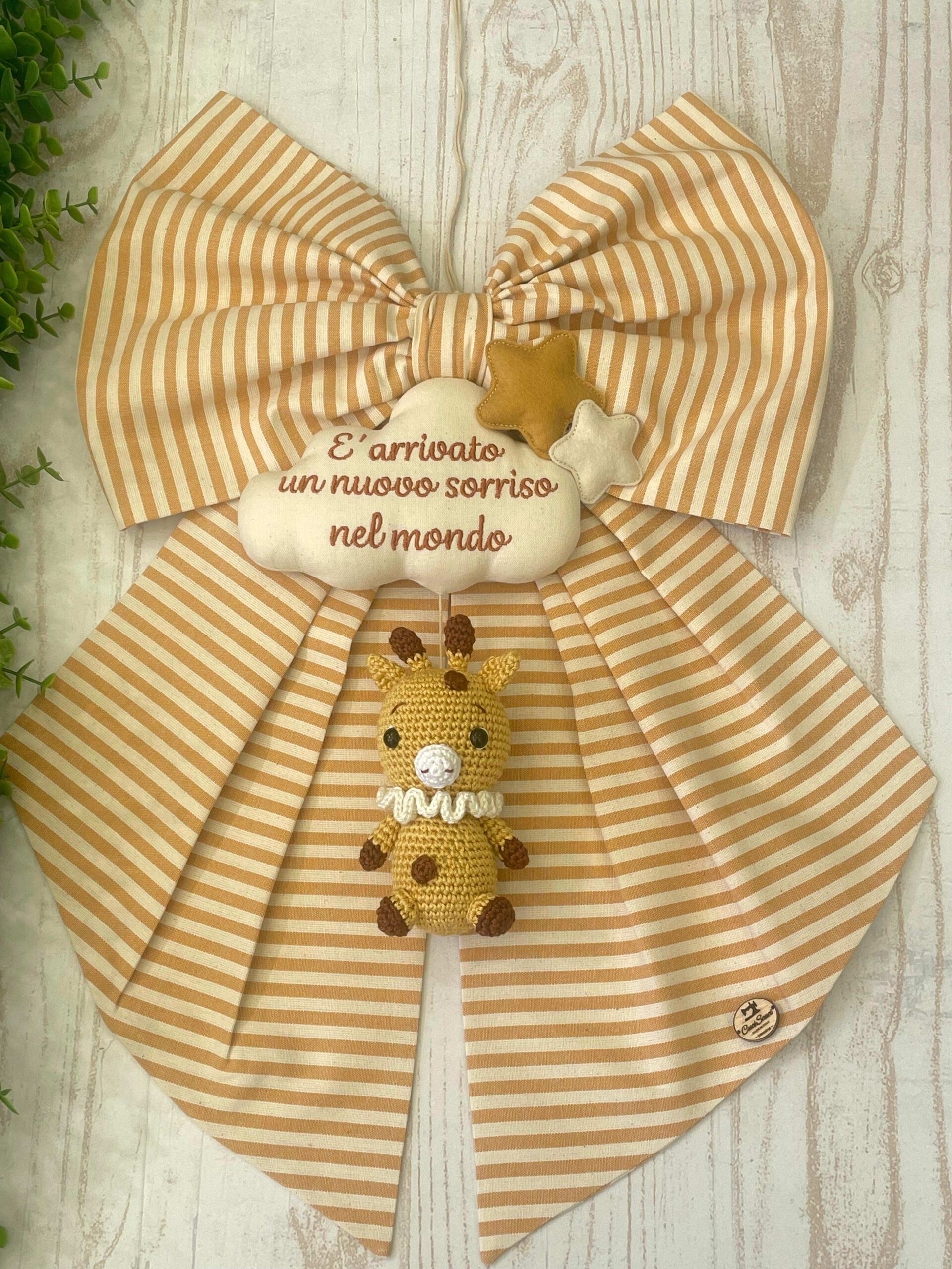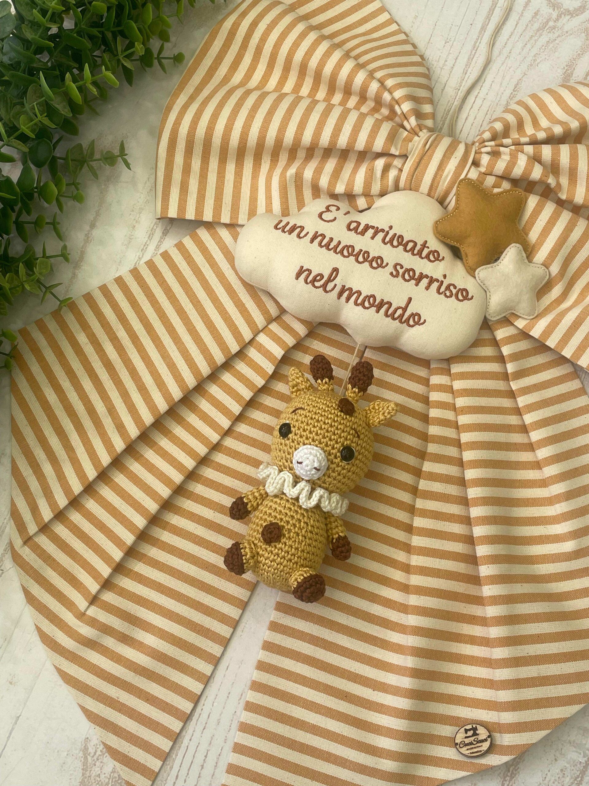 Recensisci per primo “Fiocco Nascita Senape e Panna con Giraffa in Amigurumi e Frase Personalizzata”
