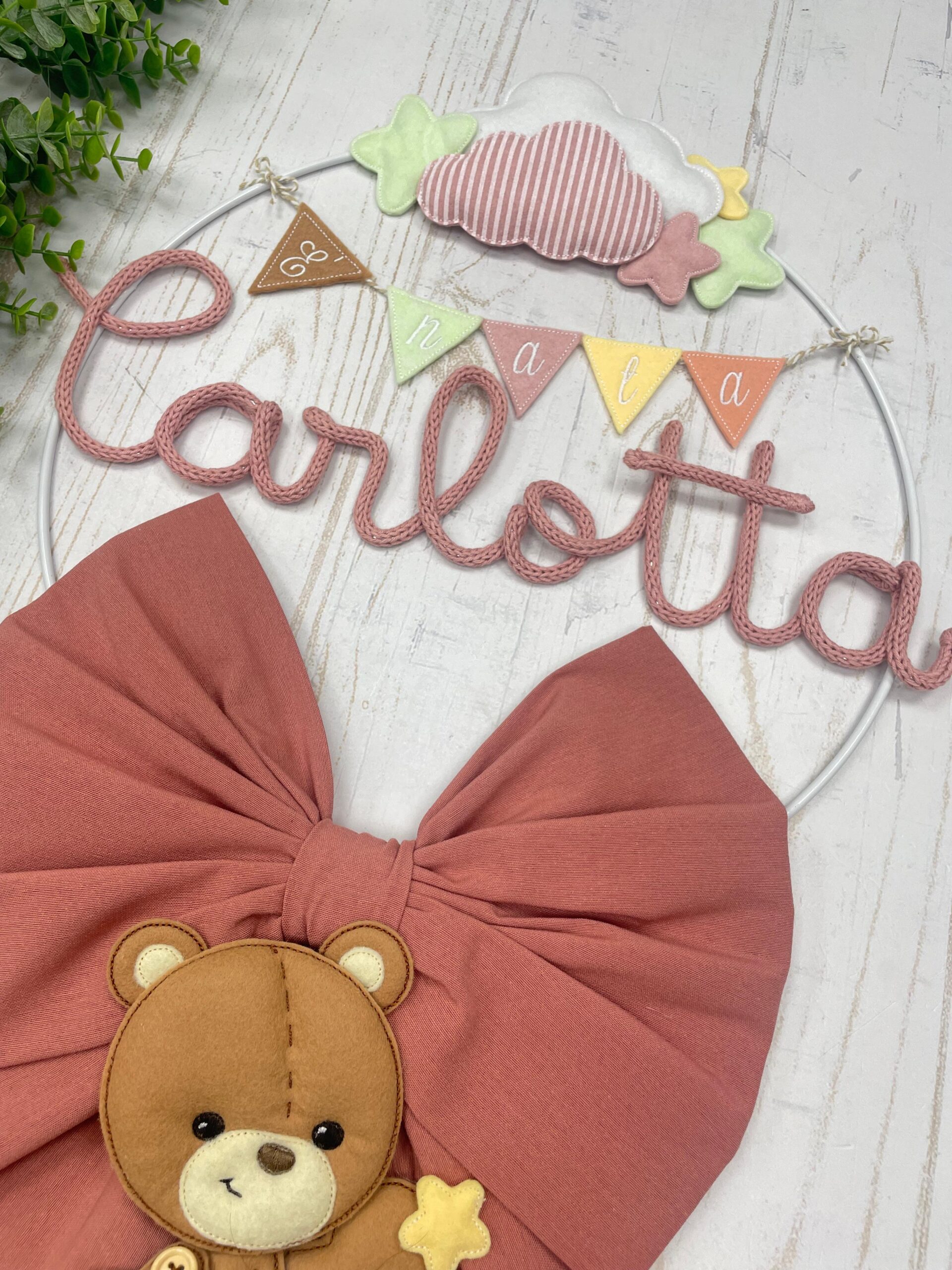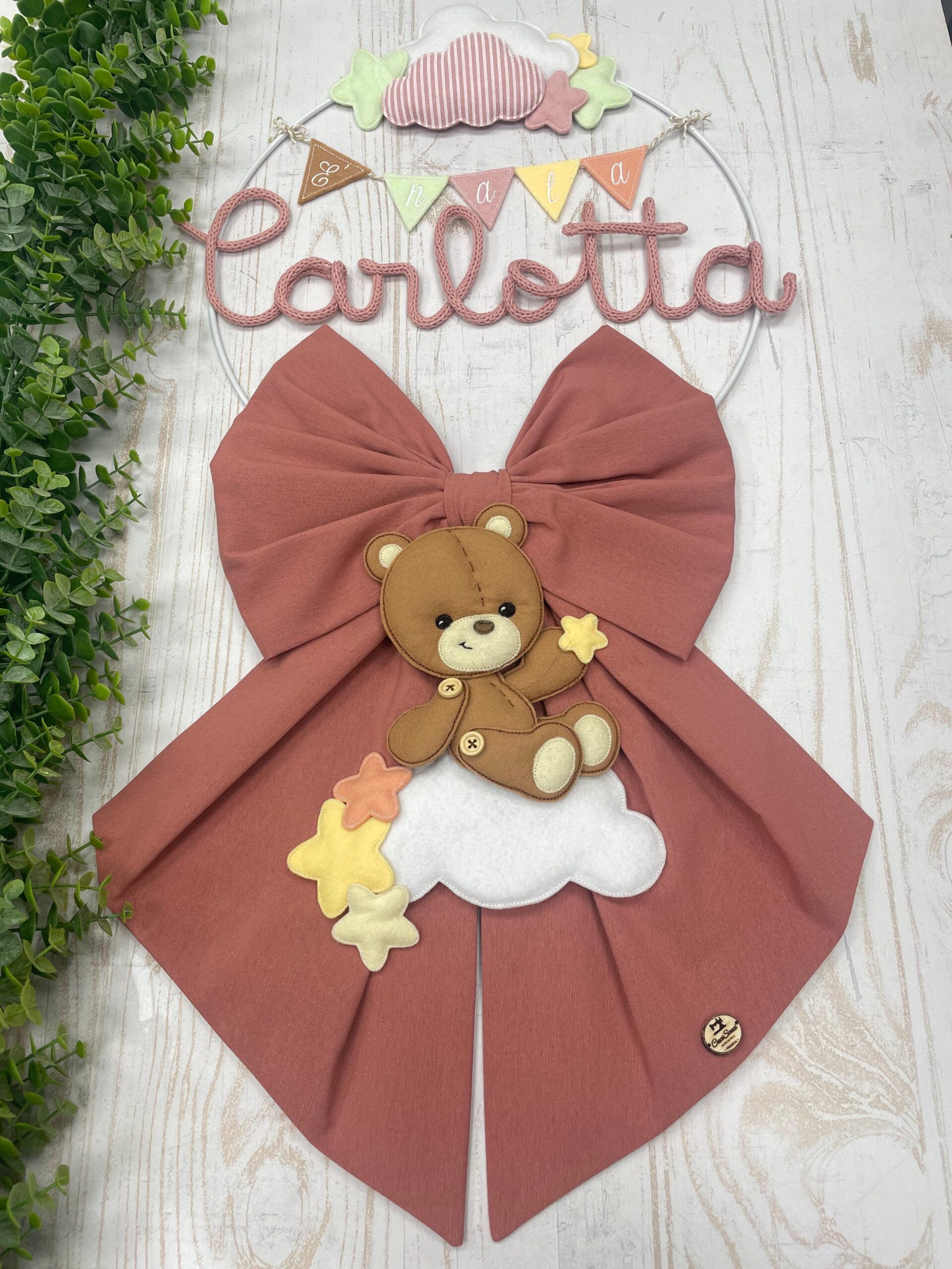 Fiocco Nascita Terracotta con Nome in Tricotin e Orsetto su Nuvola