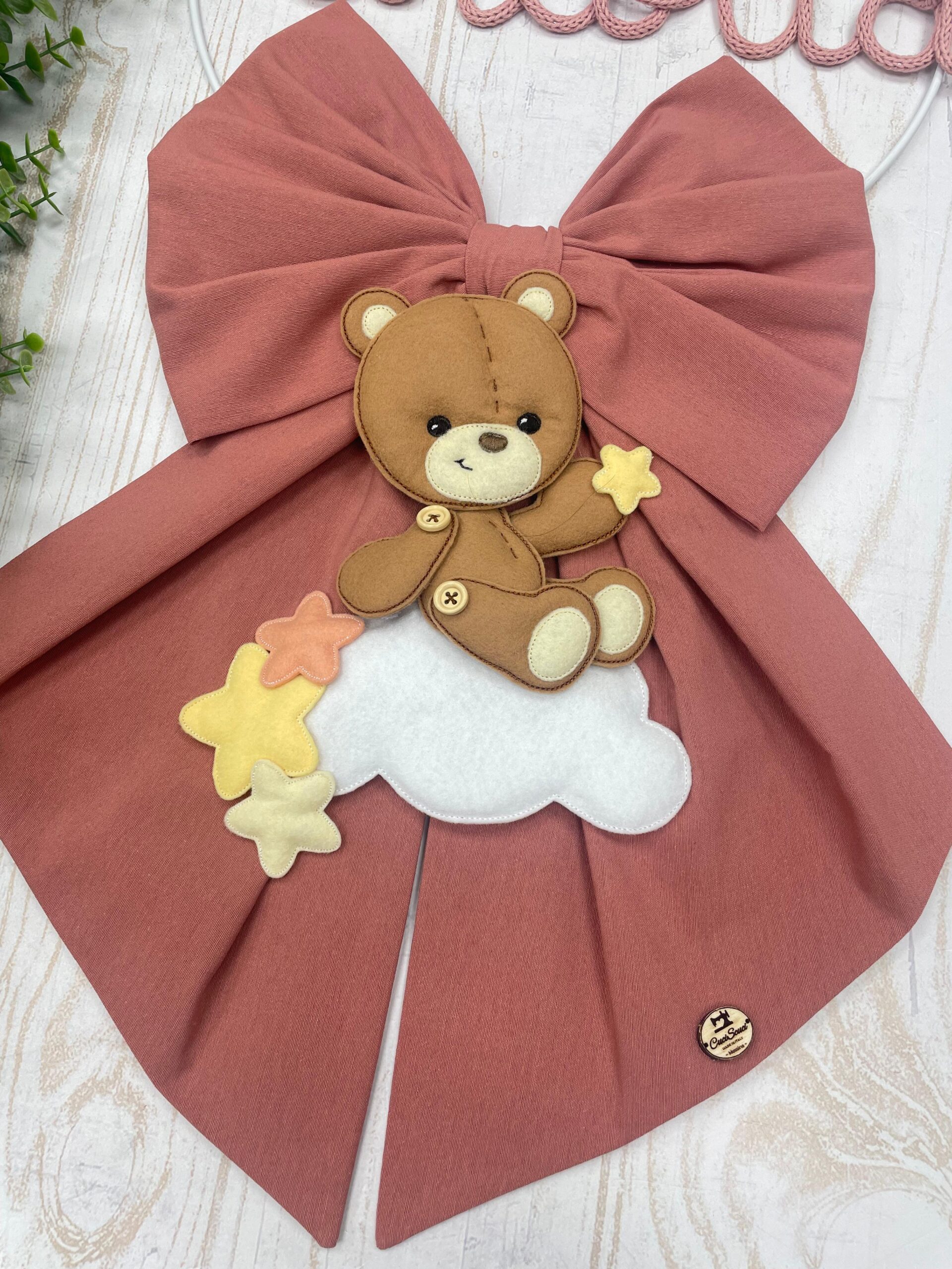 Dal fiocco pende un tenero orsetto in pannolenci tridimensionale seduto su una nuvoletta bianca.