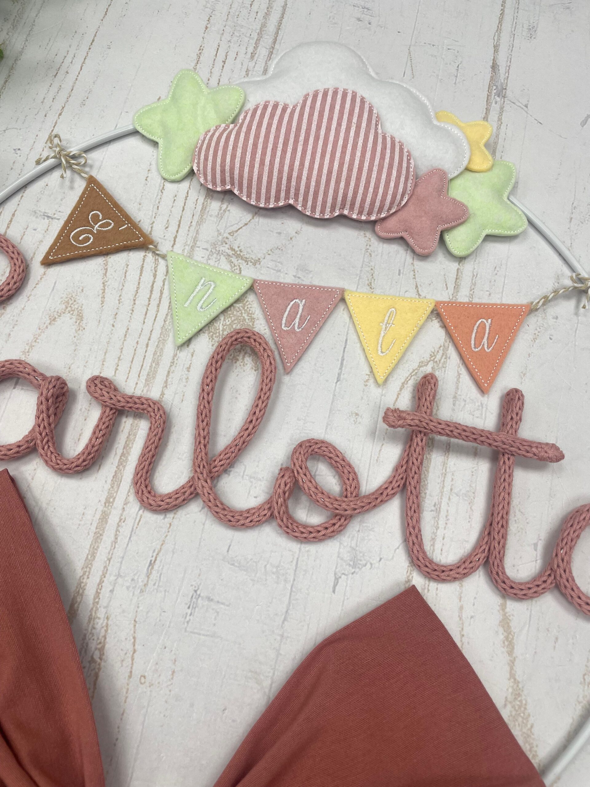 Al centro il nome della bimba in tricotin rosa.