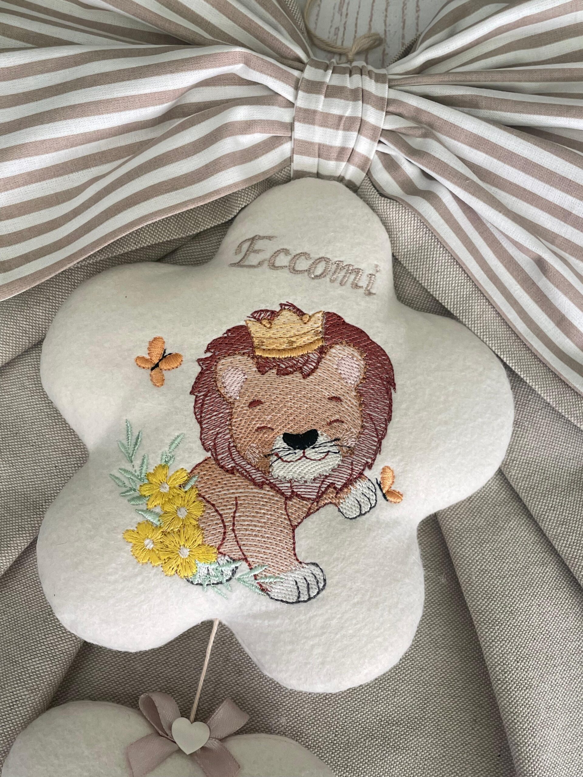 Dal fiocco pende un fiore su cui è ricamata la scritta “Eccomi” e un leoncino.
