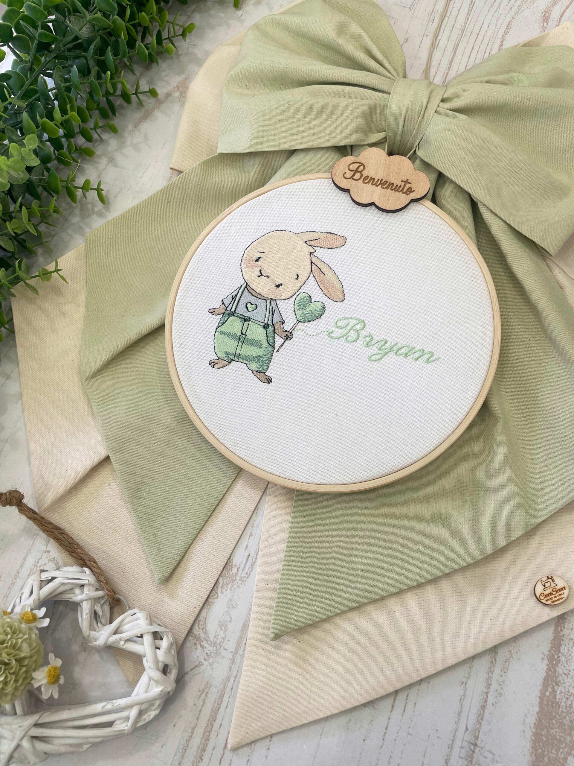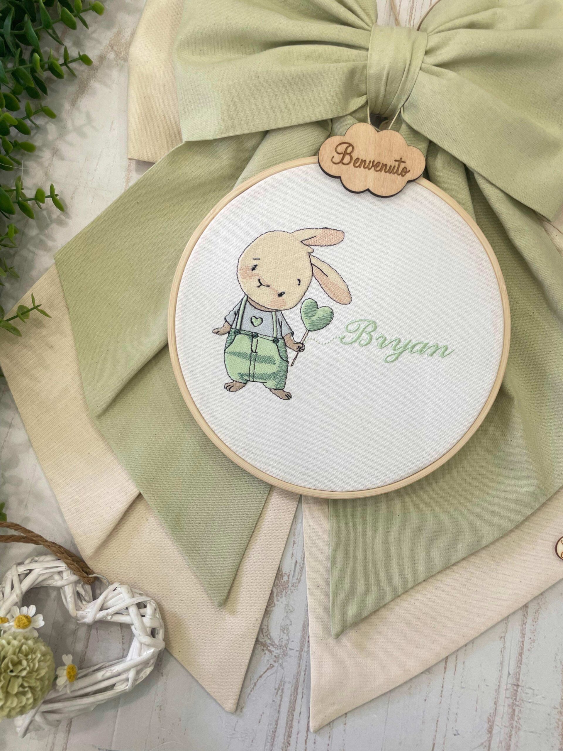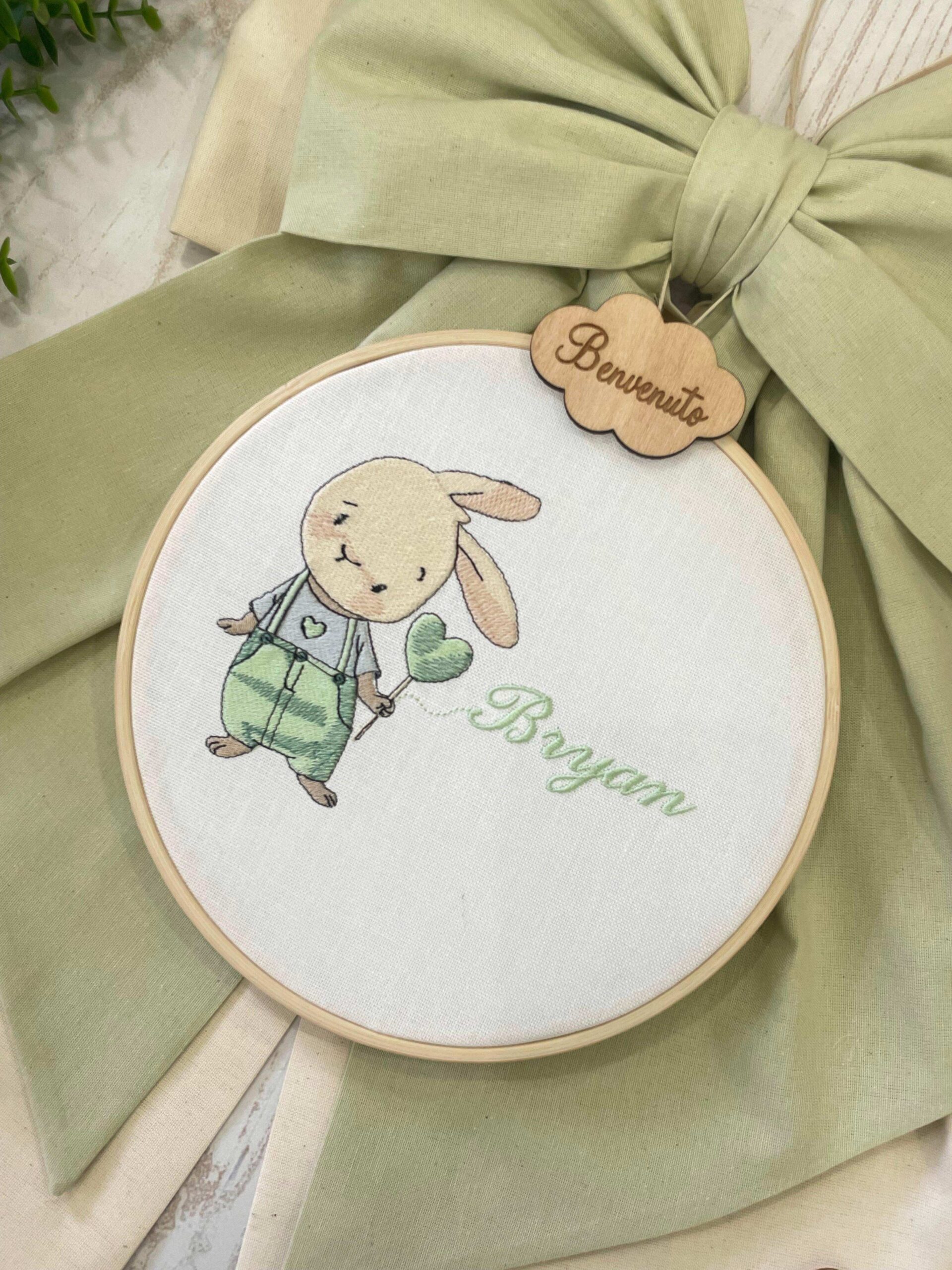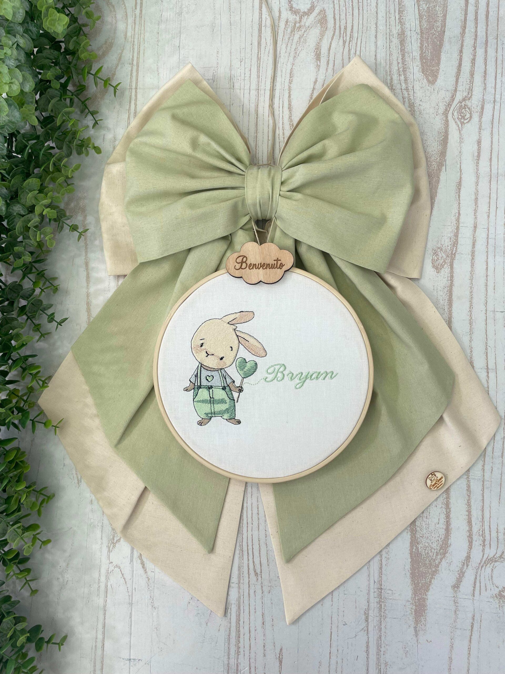 Sul fiocco è applicato una nuvoletta in legno con la scritta “benvenuto” da cui pende un telaio in legno realizzato all’interno in panama di cotone, con il ricamo di un coniglietto e il nome del bambino.