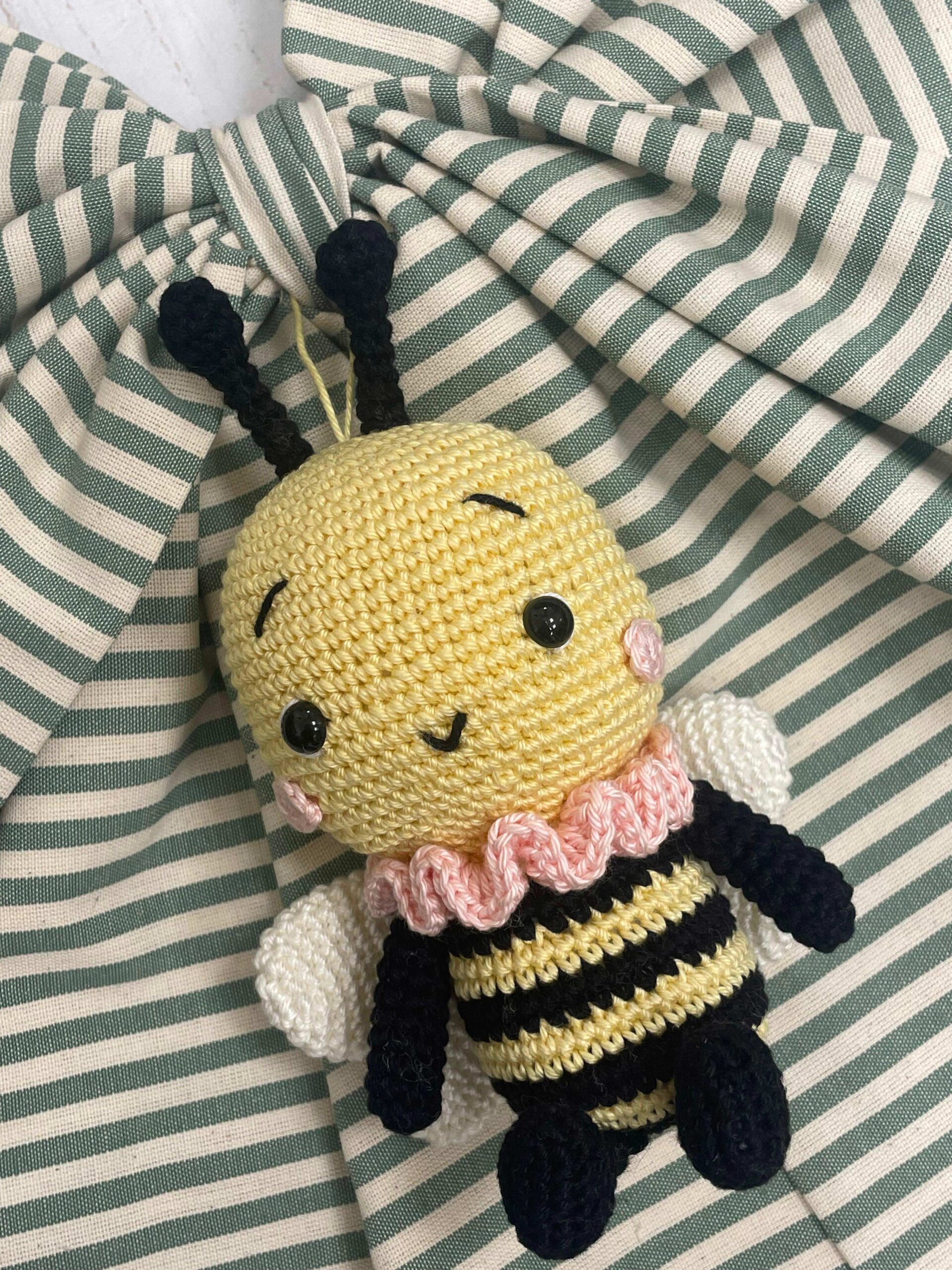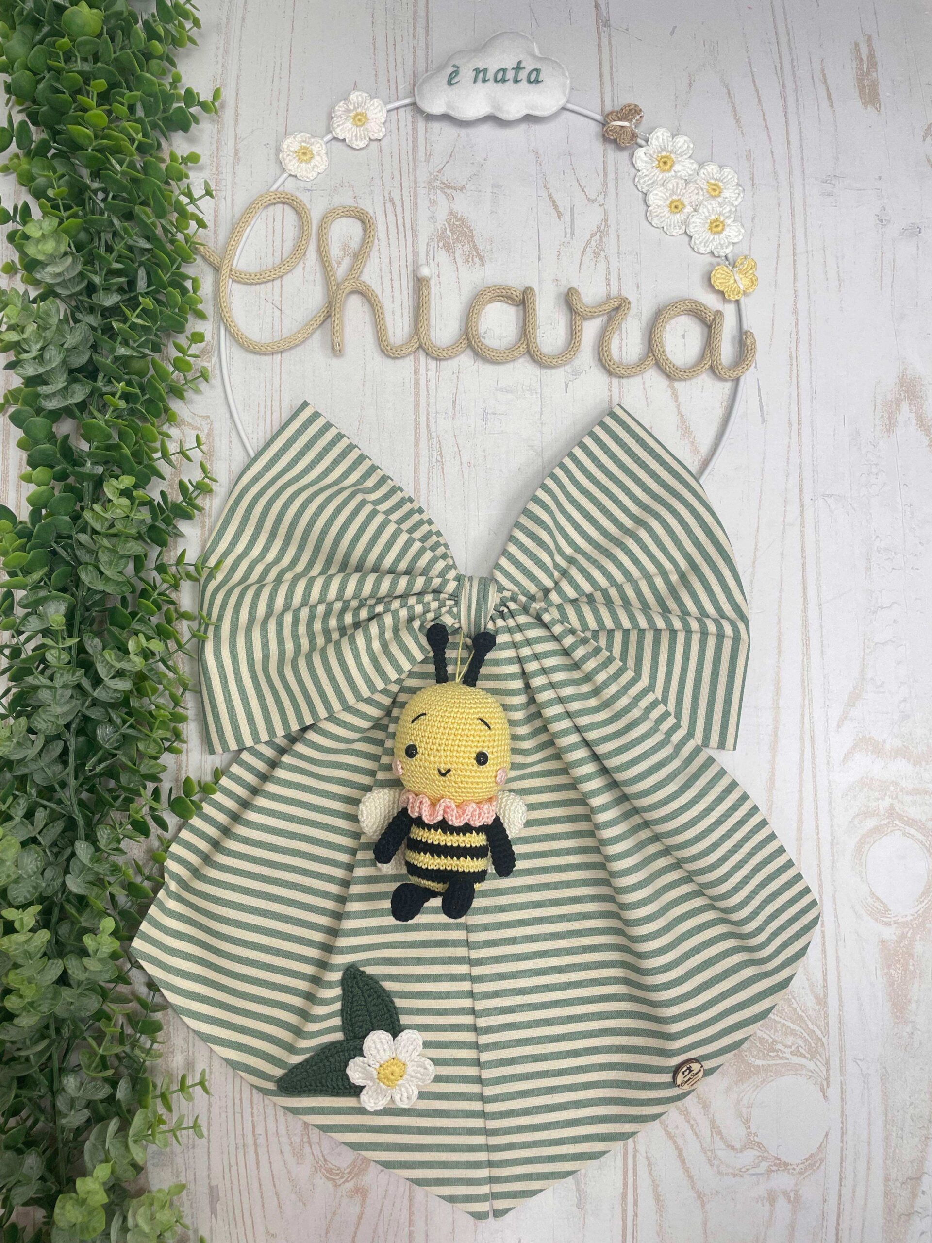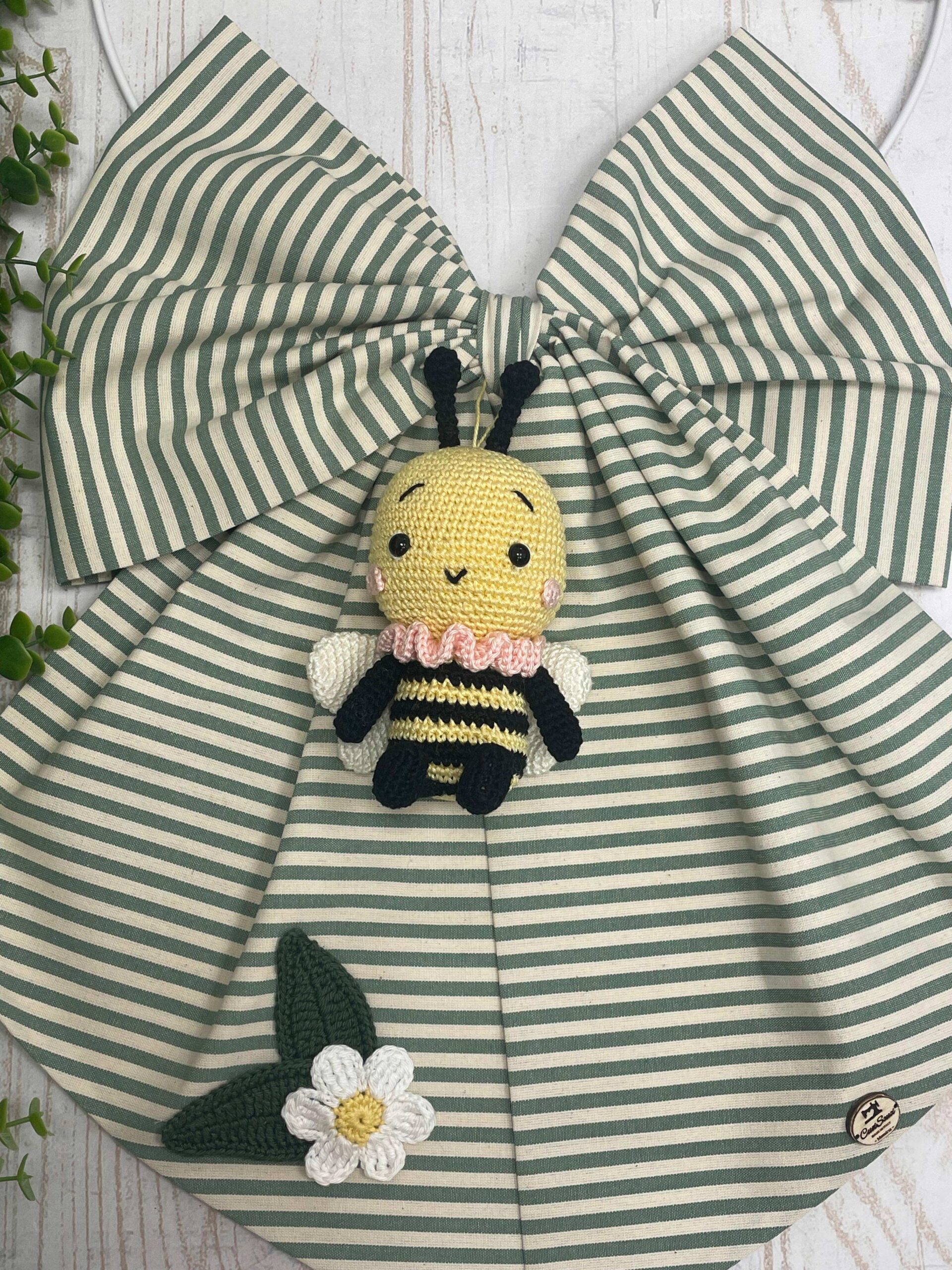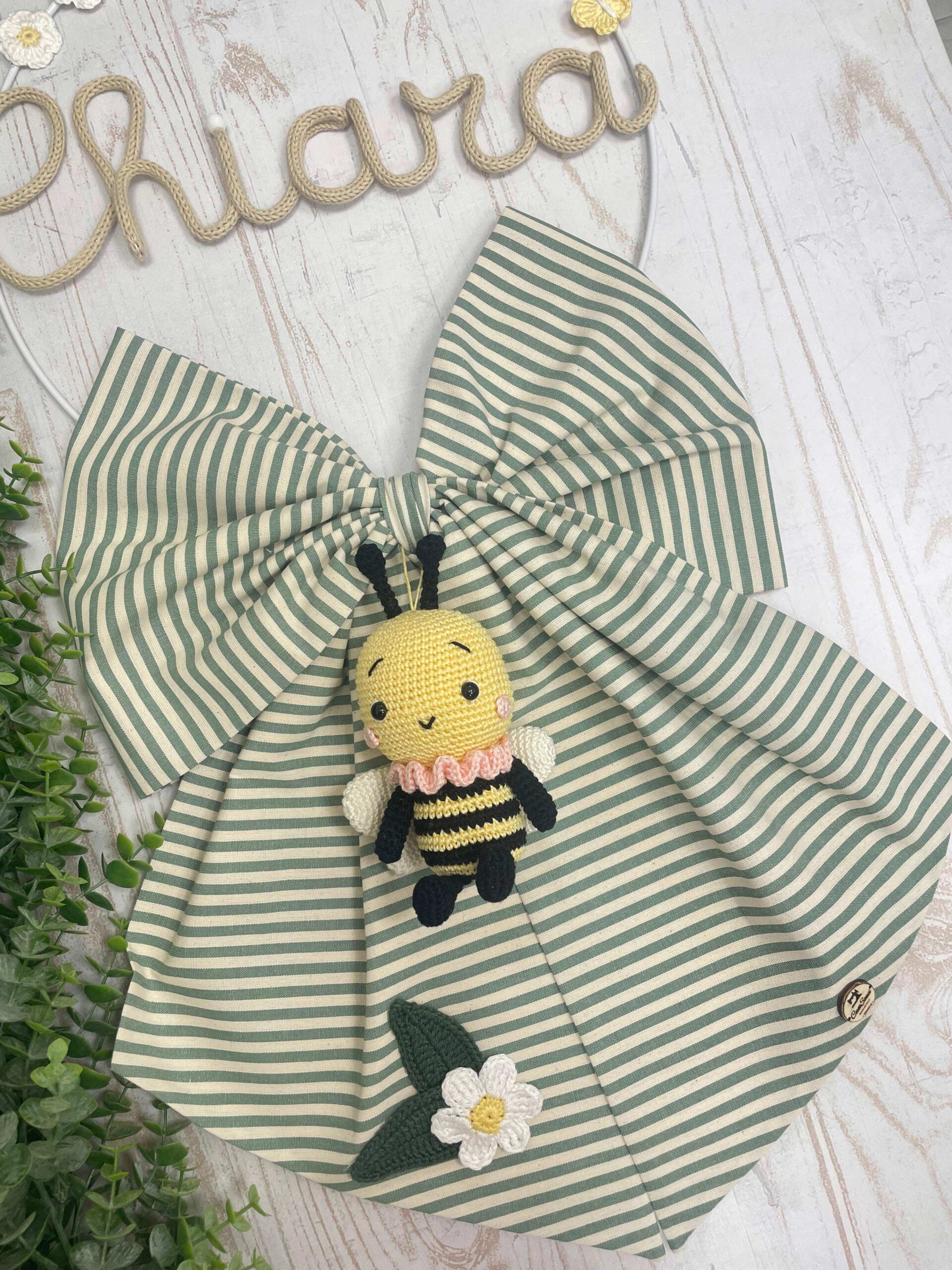 Dal fiocco pende una tenera ape tridimensionale realizzata con la tecnica amigurumi.