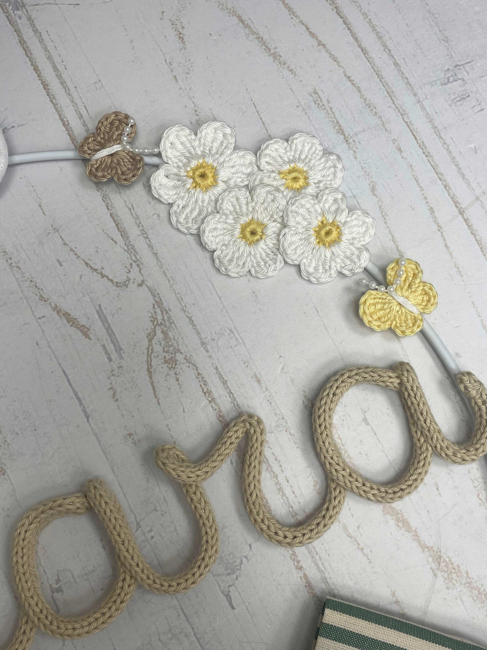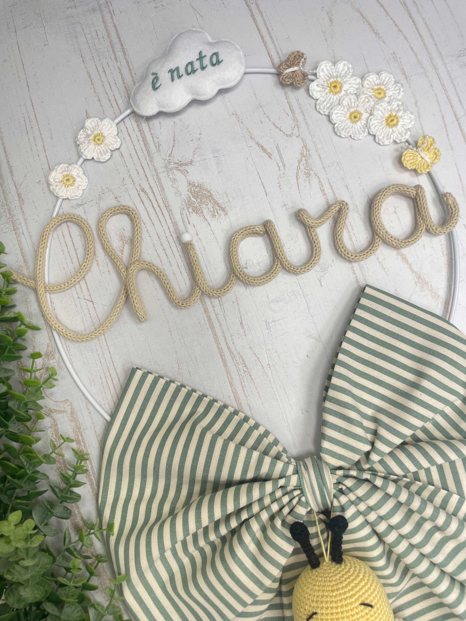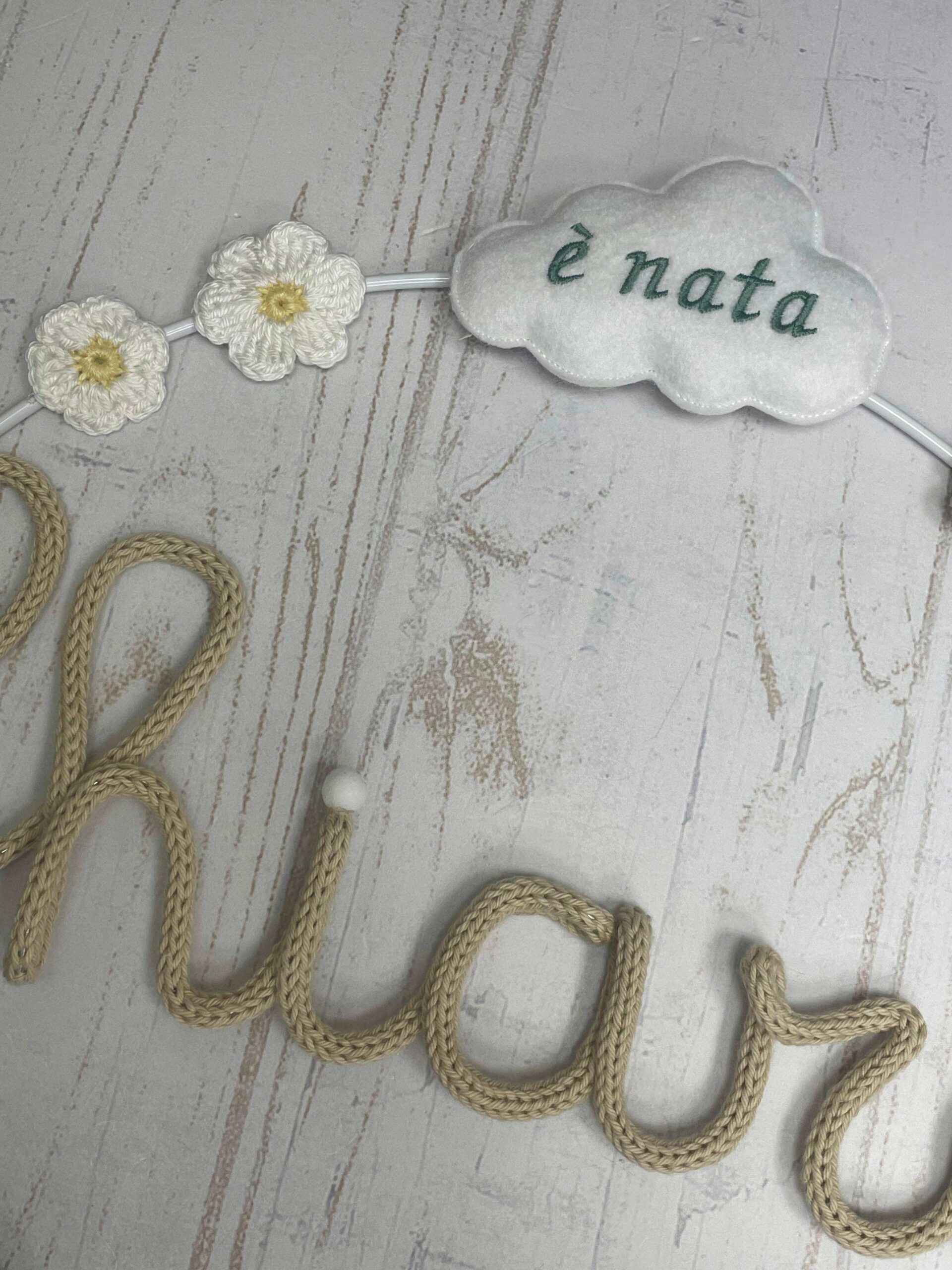 Al centro il nome della bimba in tricotin beige (nome personalizzabile).