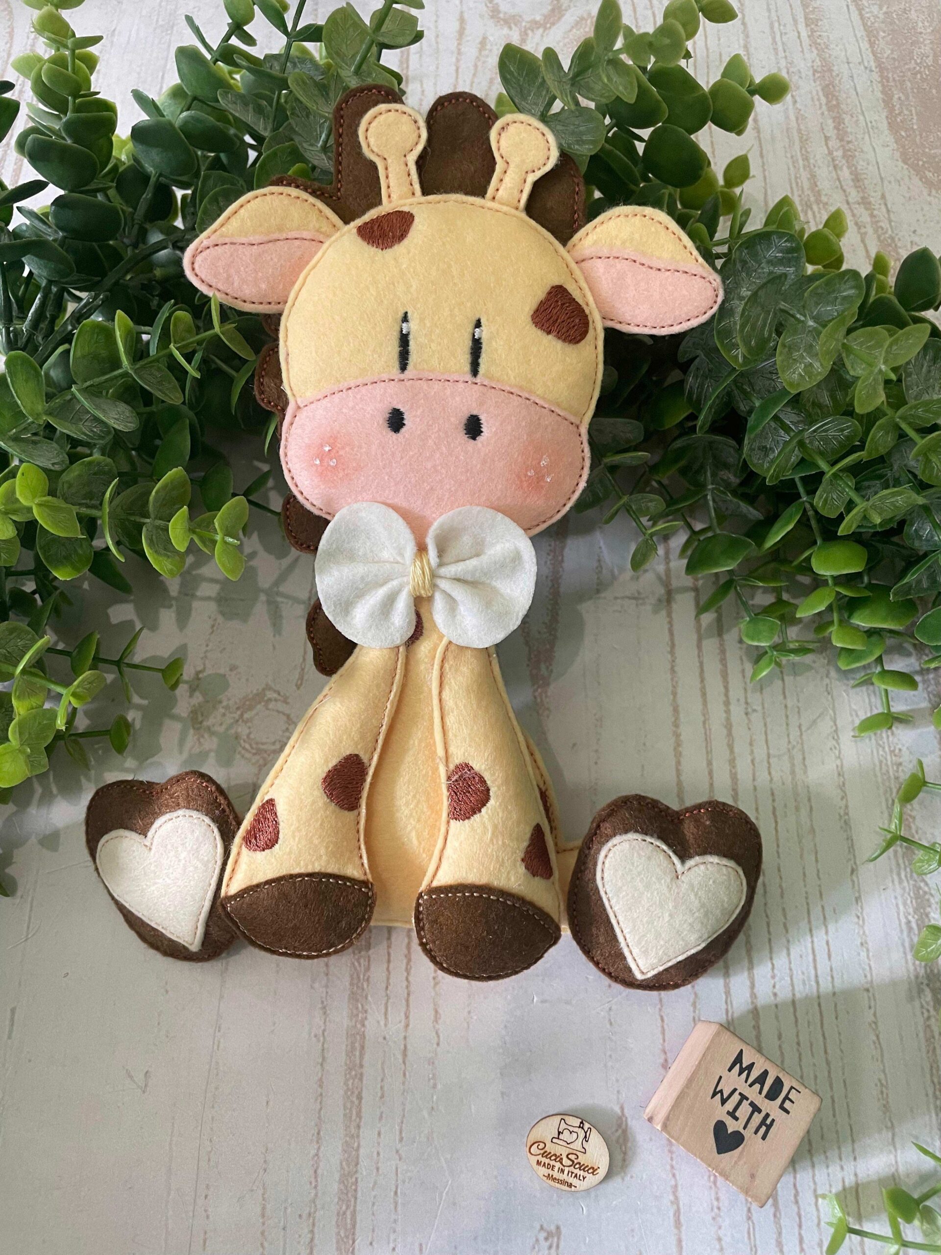 Una tenera giraffa, a scelta se con o senza papillon, realizzata in pannolenci.