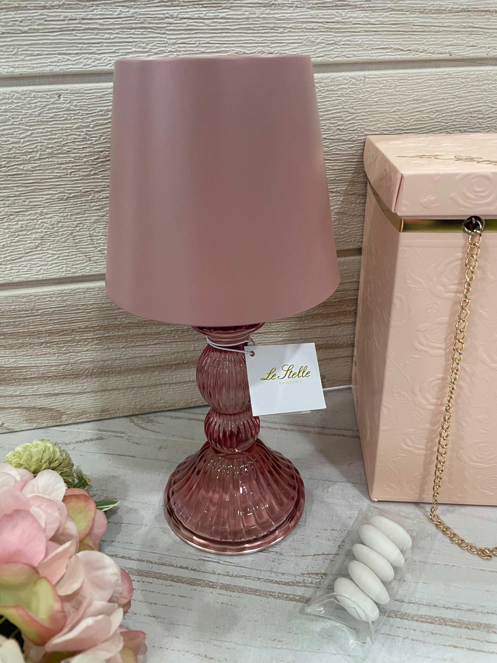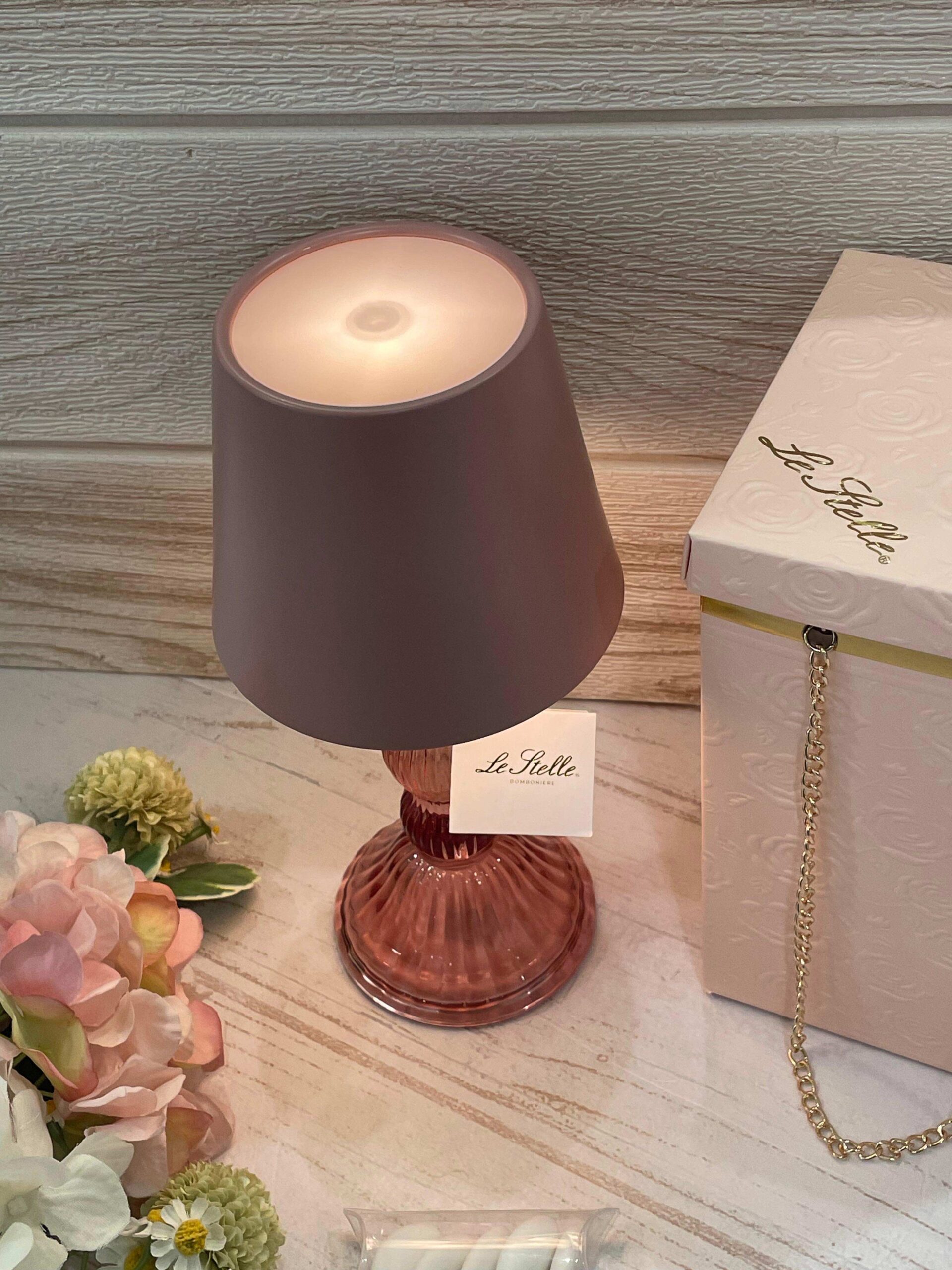 La qualità del vetro e l’attenzione alle finiture conferiscono all’insieme un aspetto moderno e ricercato, trasformando questa lampada in una bomboniera significativa e distintiva. Un oggetto pensato per accompagnare con eleganza la quotidianità, capace di unire funzione decorativa e praticità, mantenendo nel tempo il ricordo di una giornata speciale.