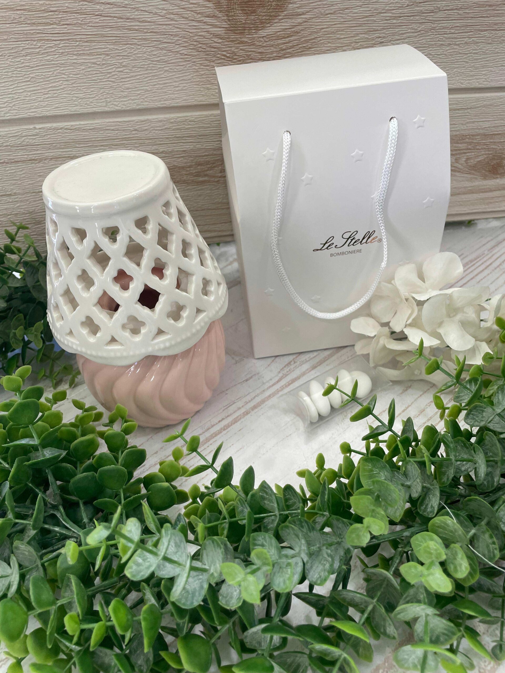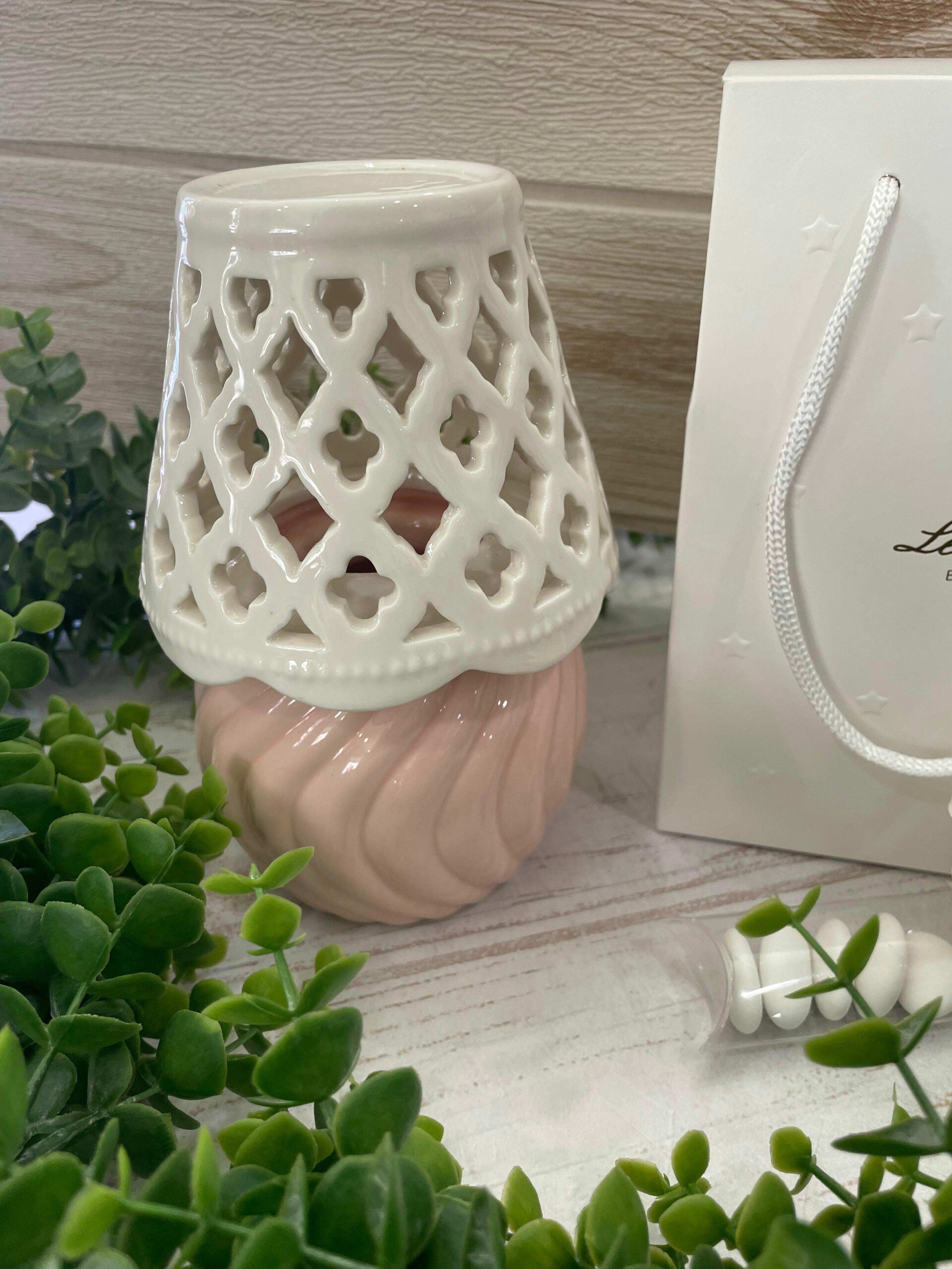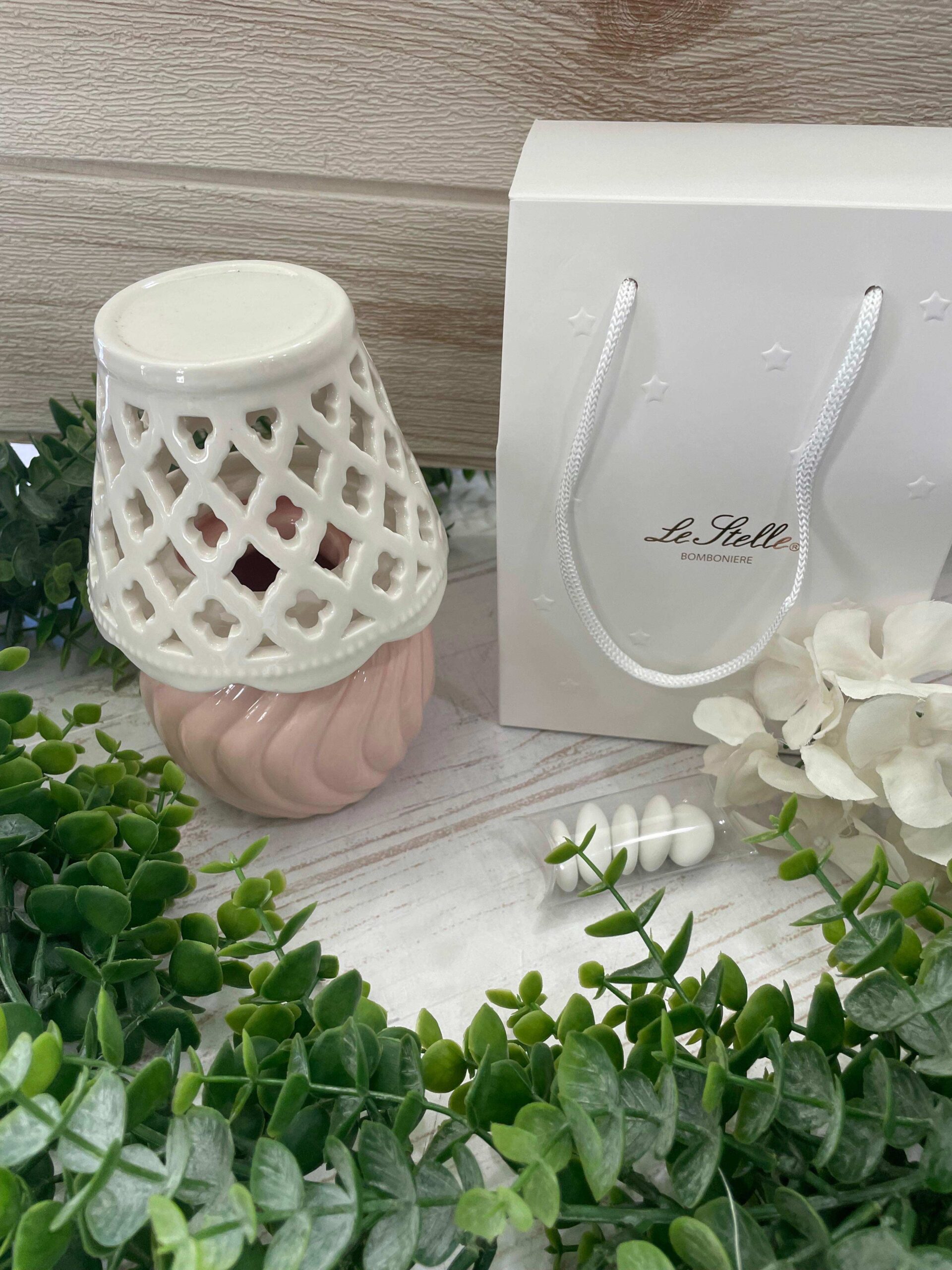 Le linee moderne e la cura delle lavorazioni trasformano questa lampada in un complemento decorativo sofisticato, capace di adattarsi sia a contesti romantici sia a eventi dallo stile più contemporaneo. La porcellana, liscia e luminosa, esalta la finezza dell’intreccio e garantisce solidità nel tempo, rendendo questa proposta una bomboniera elegante e significativa.