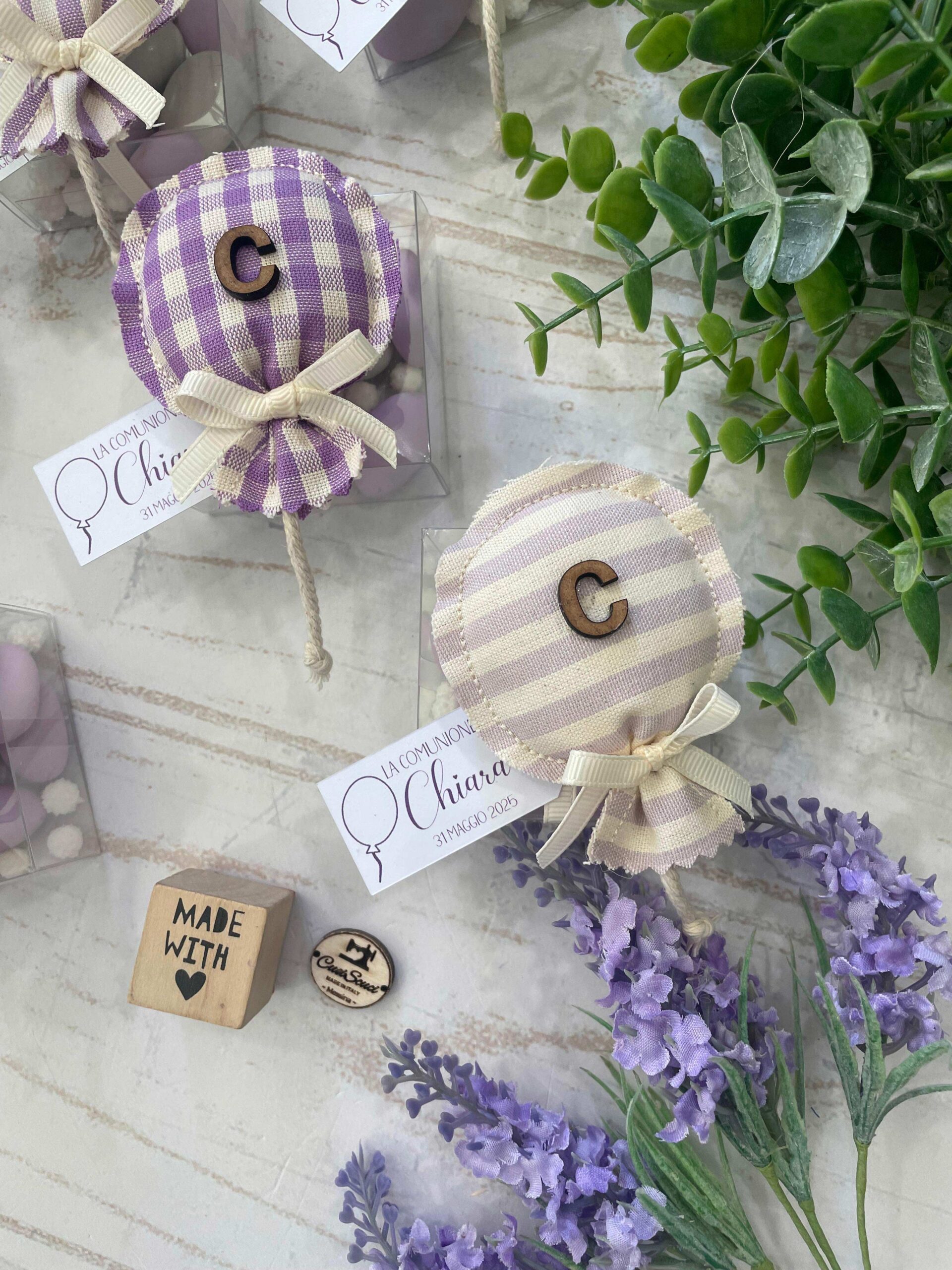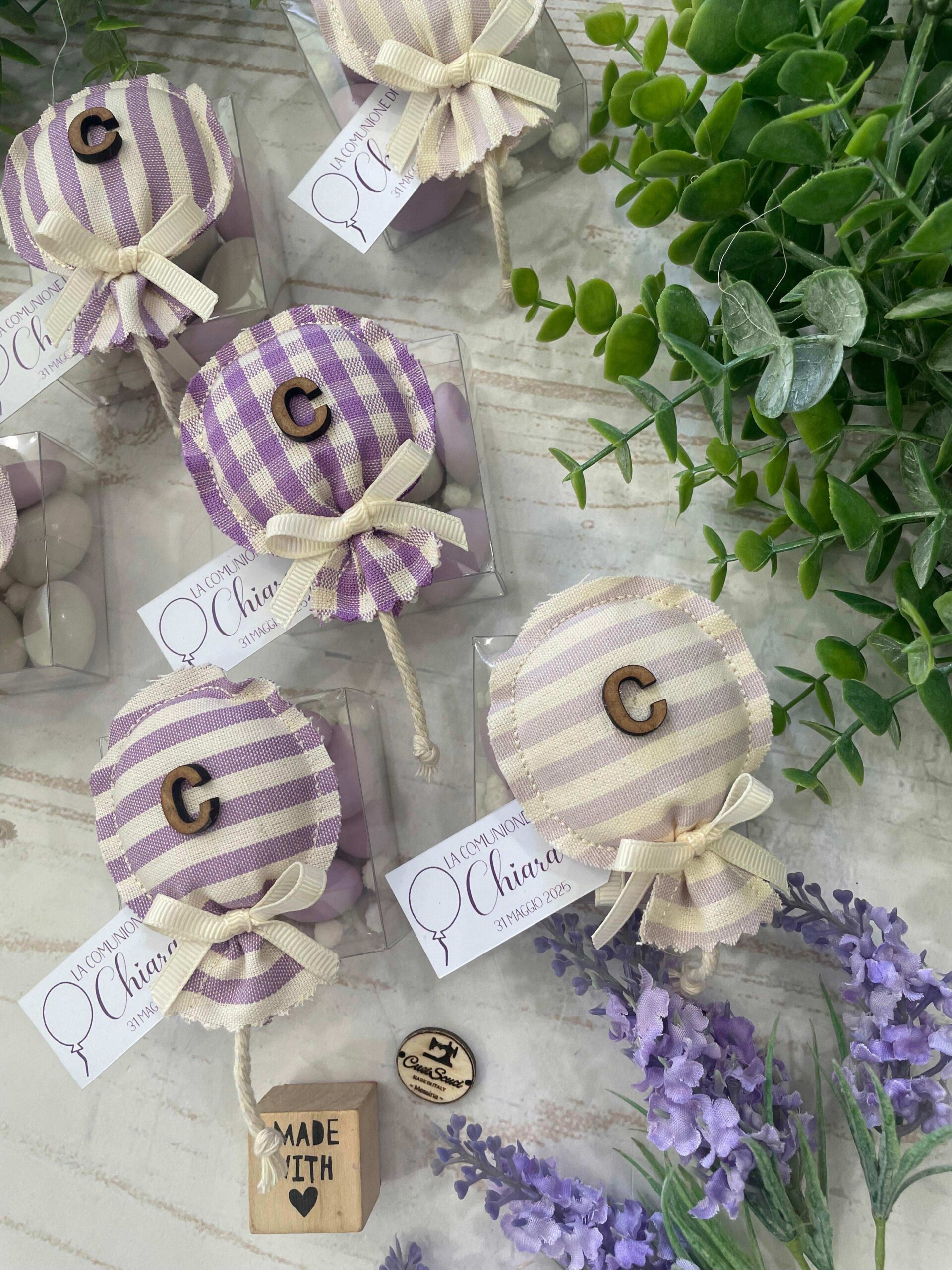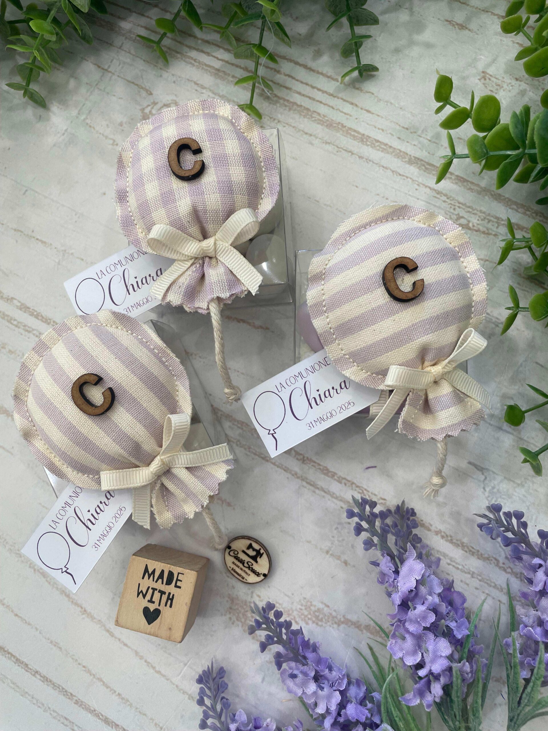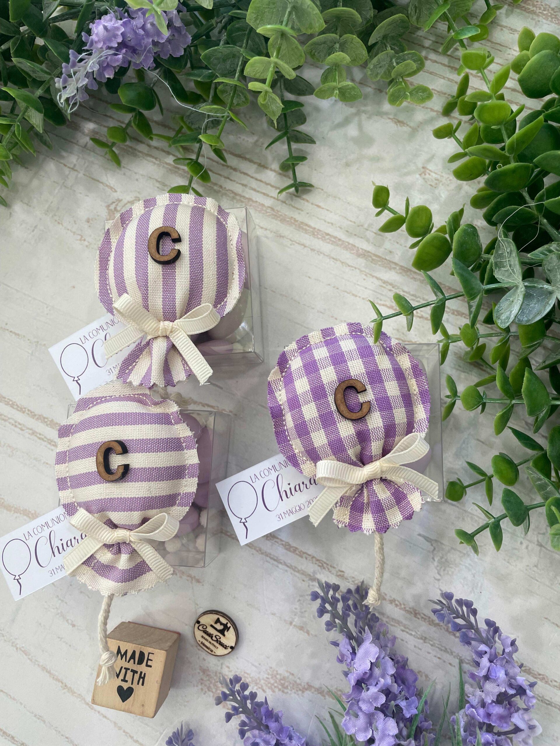 Realizzato con cotone tinto filo, in fantasie assortite o a scelta, nei toni del lilla e del provenza, con l’applicazione di un’iniziale in legno e di un tag personalizzato.