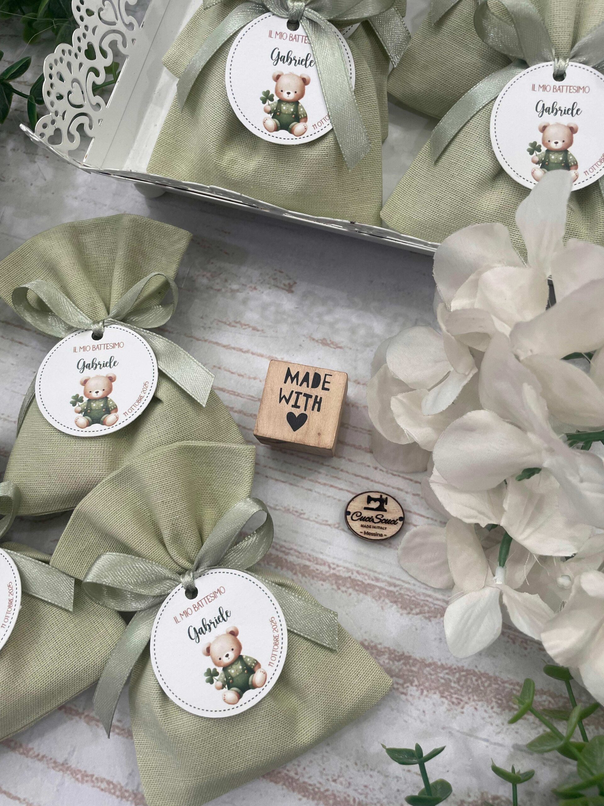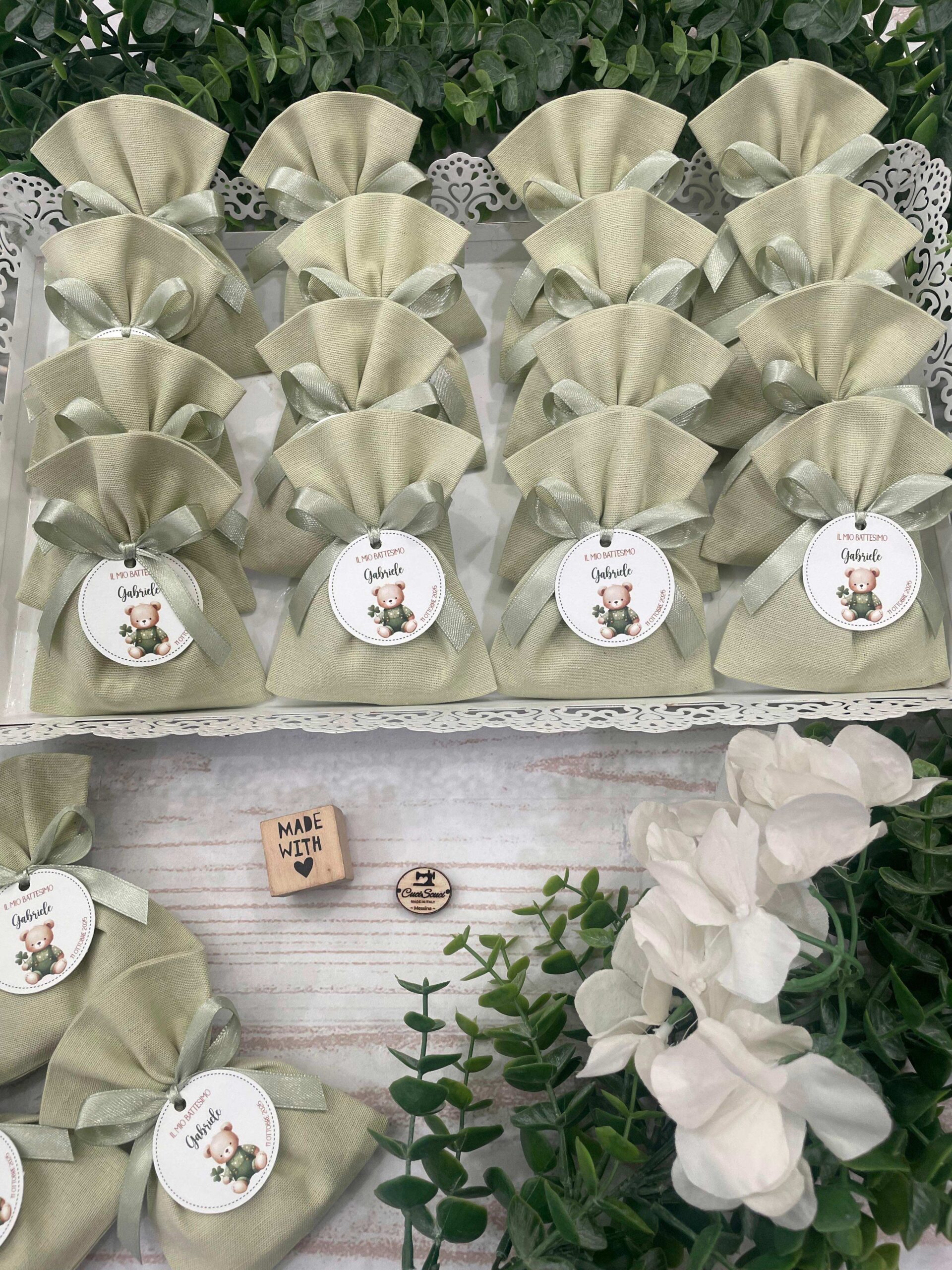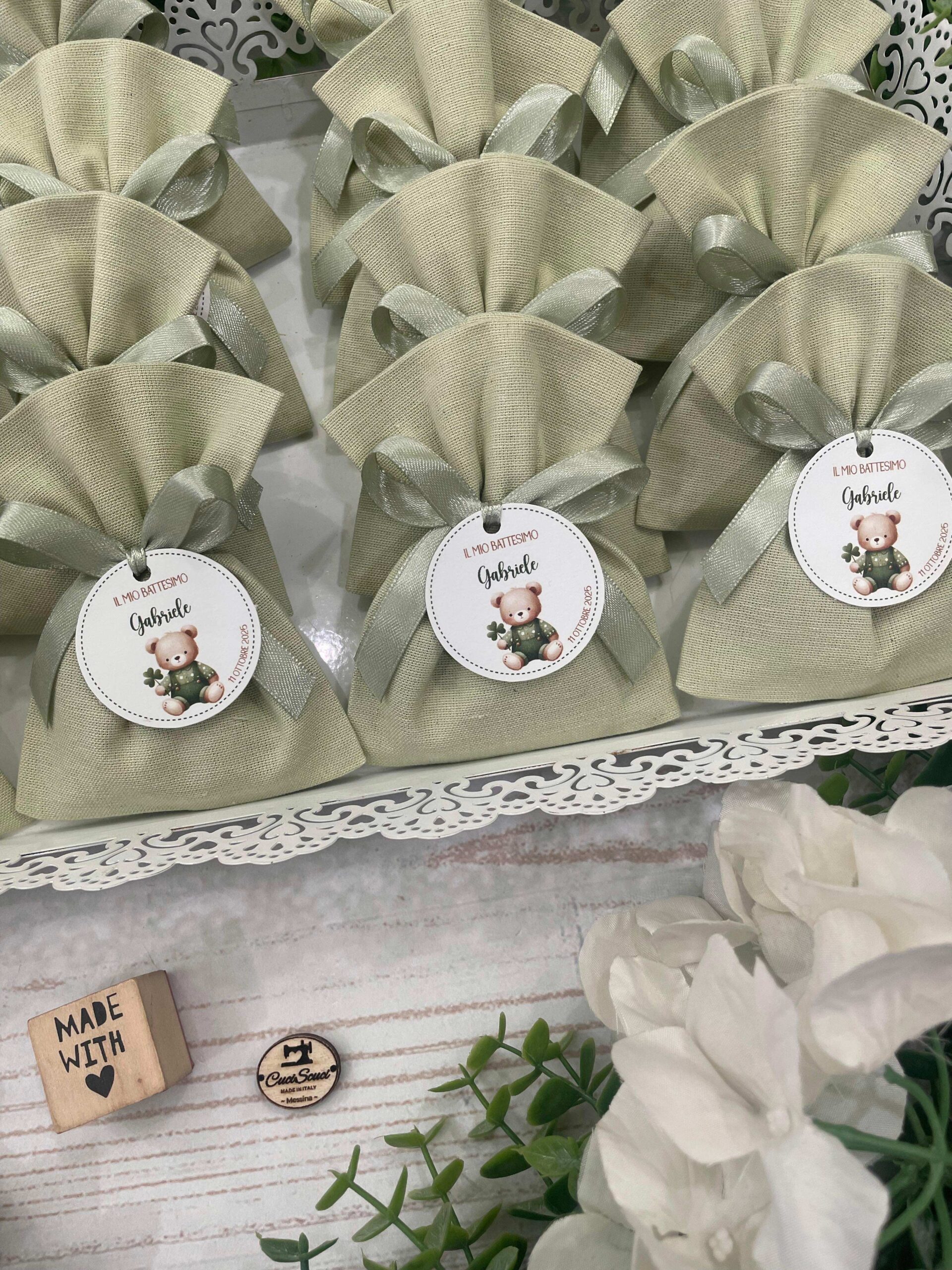 La bomboniera, pronta da donare ai tuoi ospiti, comprende il sacchetto, confezionato con fiocco abbinato, 5 confetti in busta sigillata e tag personalizzato.