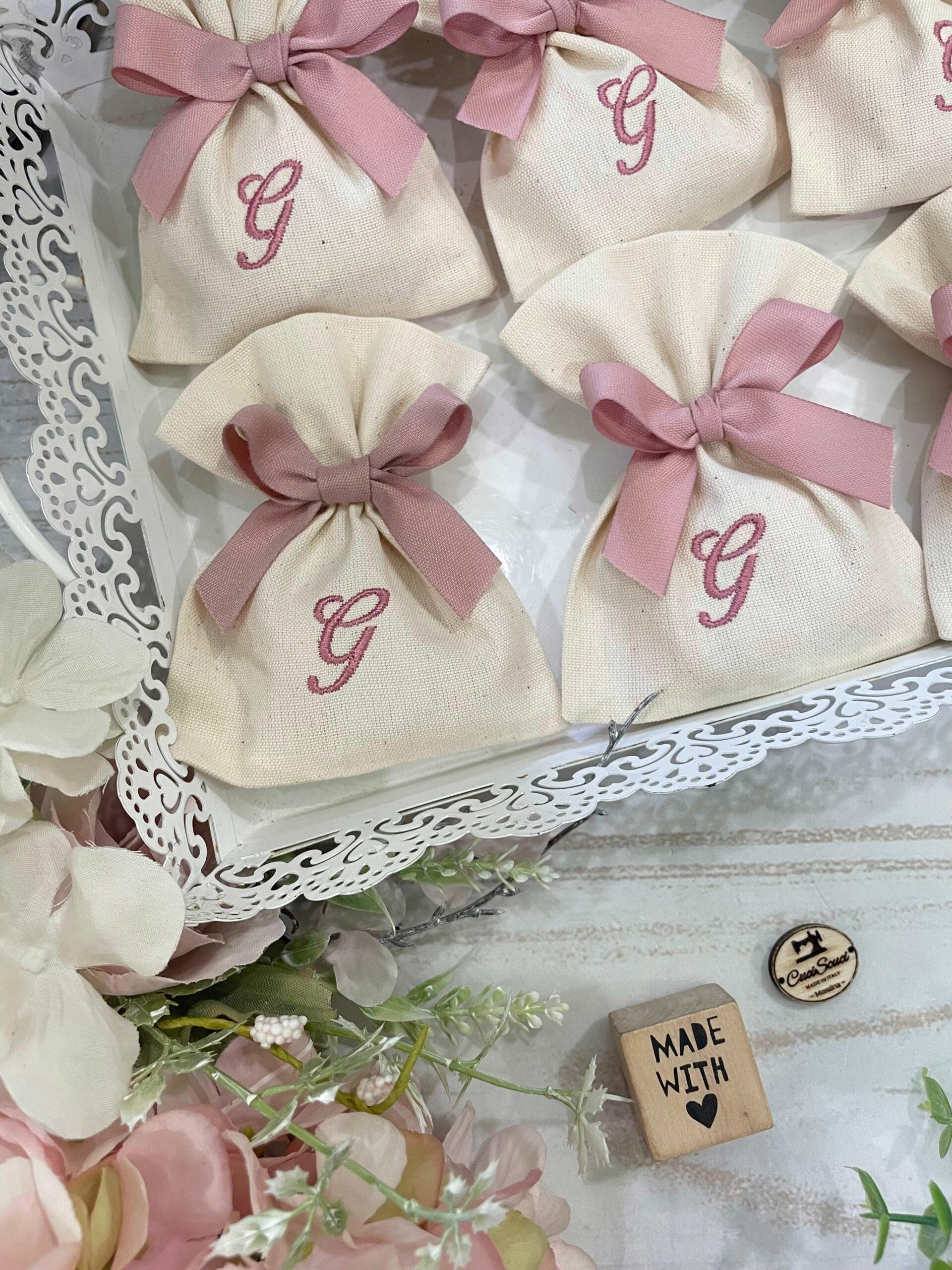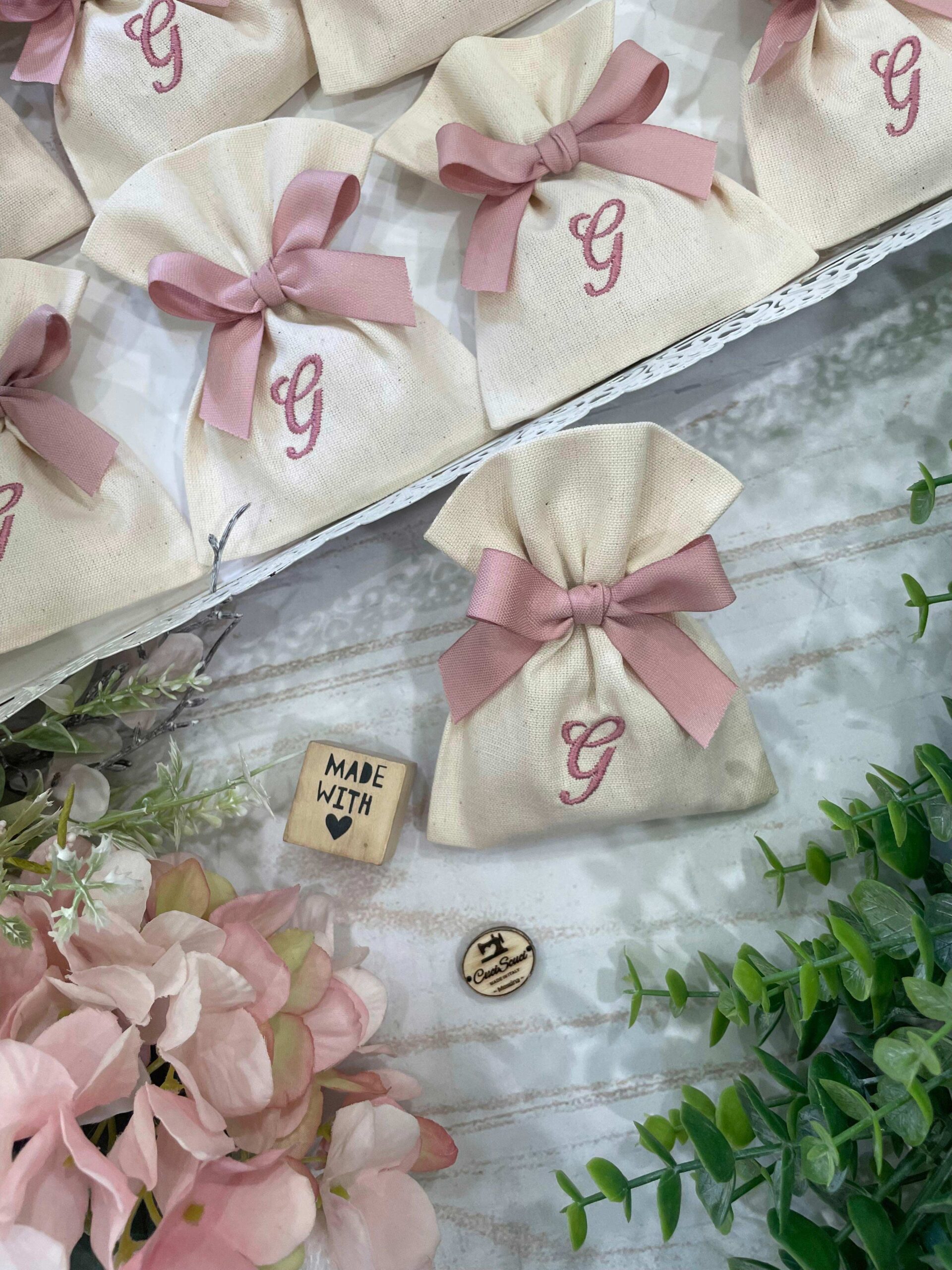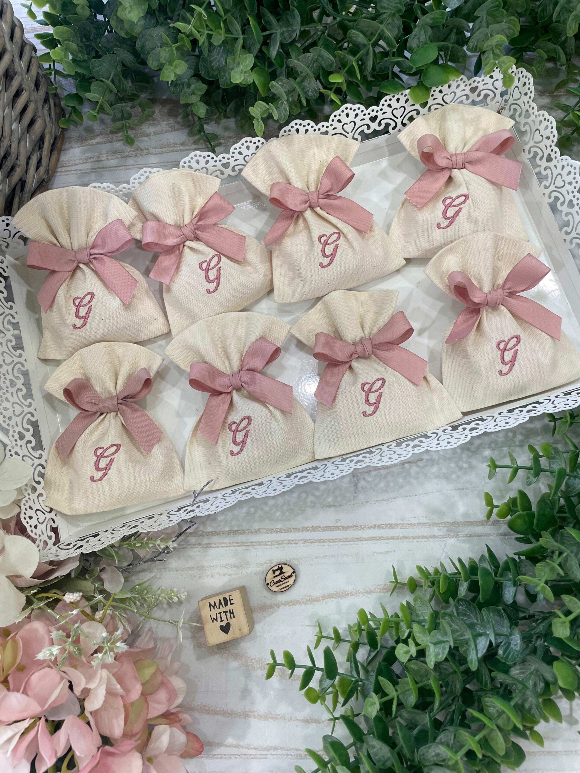 La bomboniera, pronta da donare ai tuoi ospiti, comprende il sacchetto, confezionato con fiocco abbinato, 5 confetti in busta sigillata.