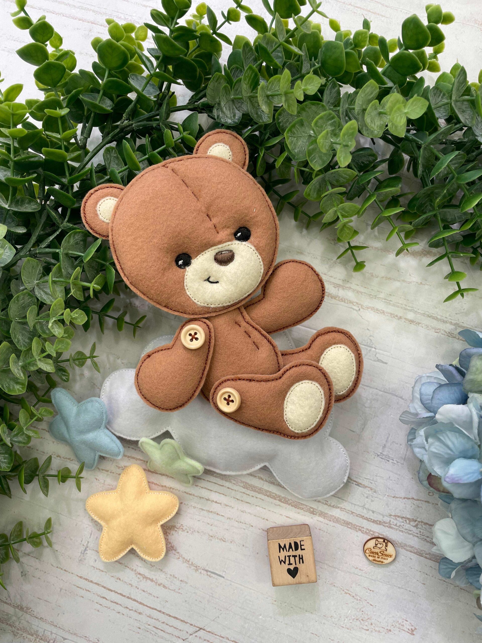Un tenerissimo orsetto marinaio in pannolenci a bordo di una dolce barchetta a vela realizzato in pannolenci.