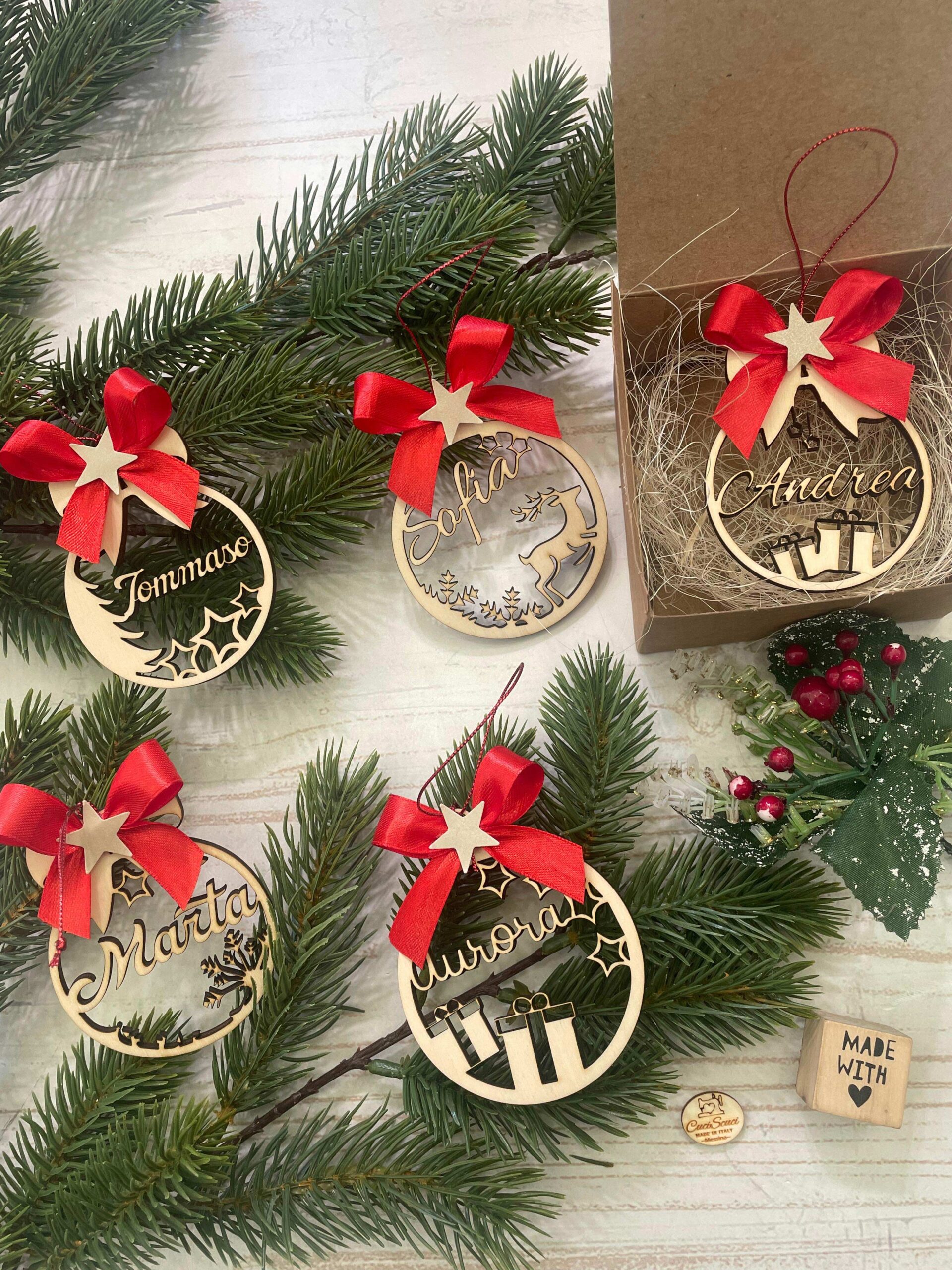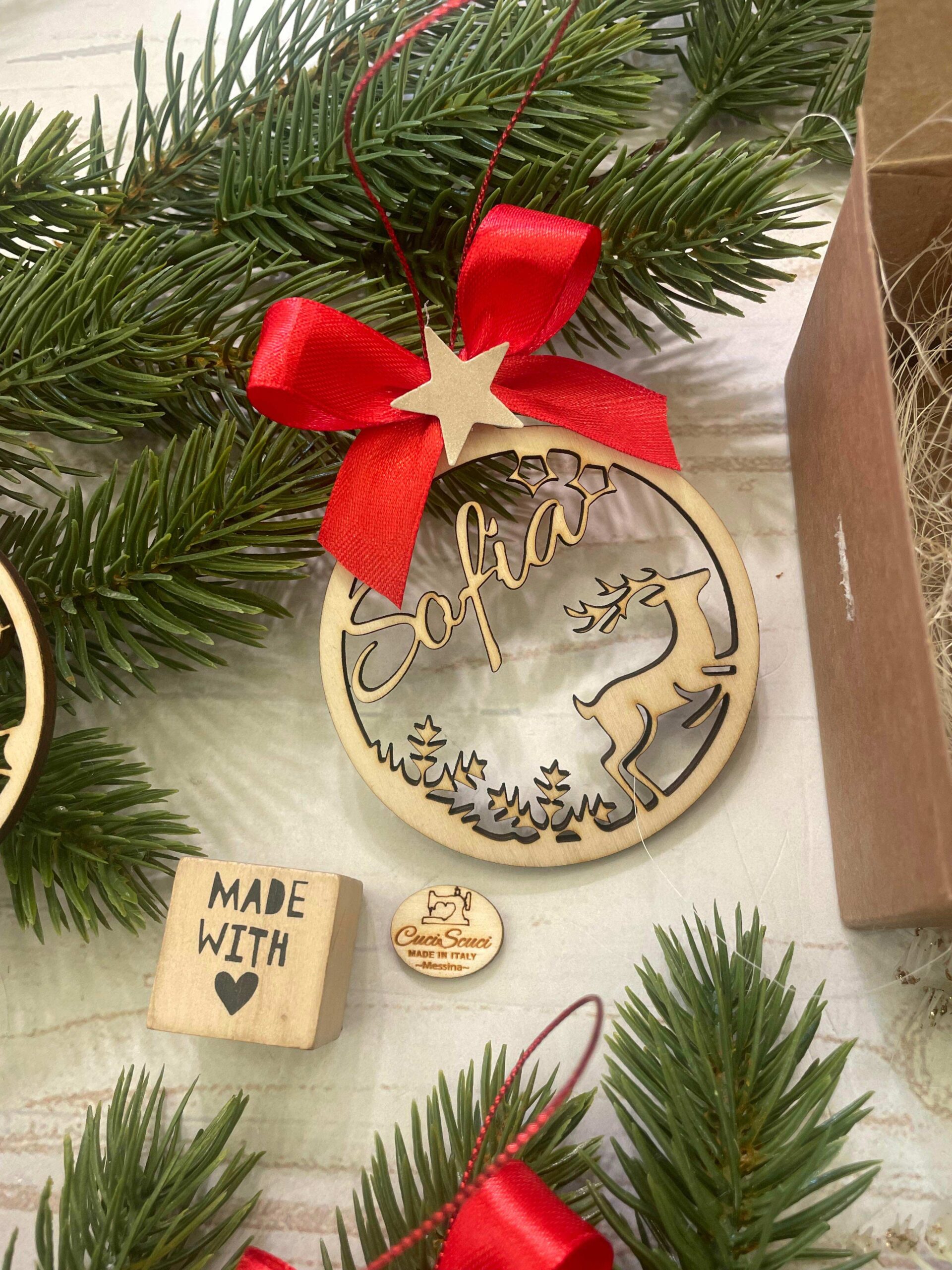 All’interno della sagoma trovano spazio piccoli soggetti incisi, come renne, alberi di Natale o pacchi regalo, accompagnati dal nome personalizzato, creando un insieme armonioso ed elegante. Il gioco di pieni e vuoti del legno inciso dona leggerezza alla composizione e rende la pallina luminosa e scenografica una volta appesa 🎄