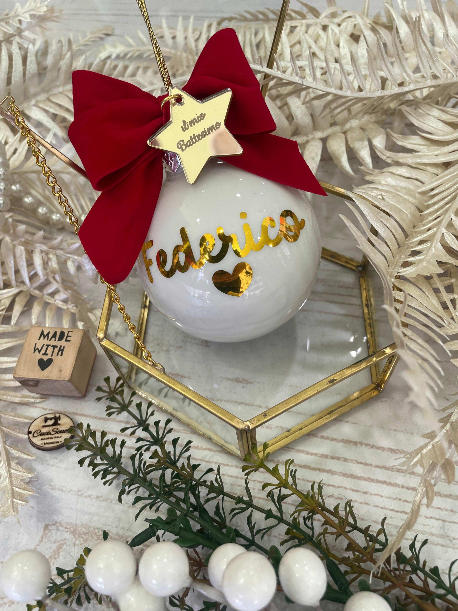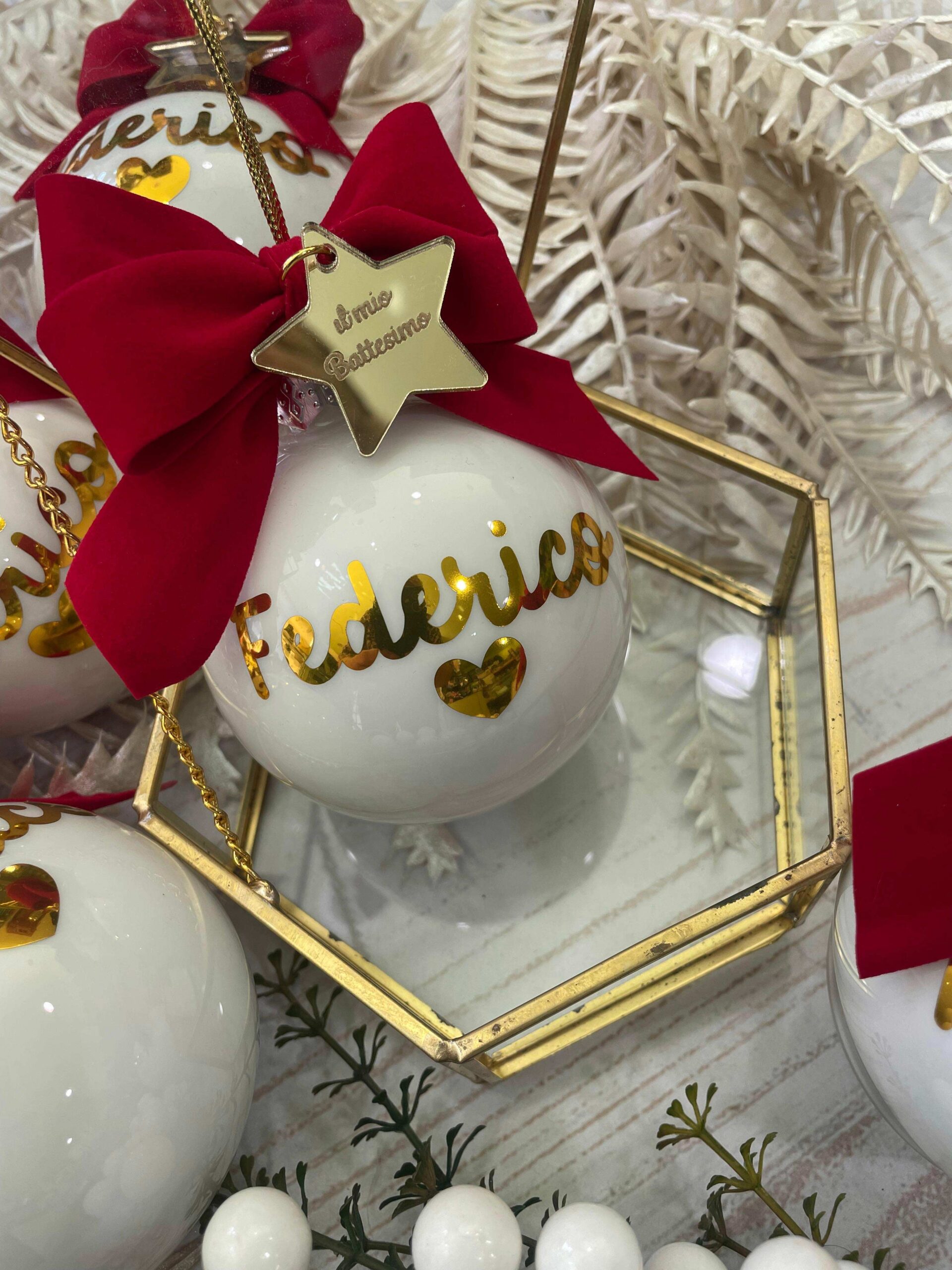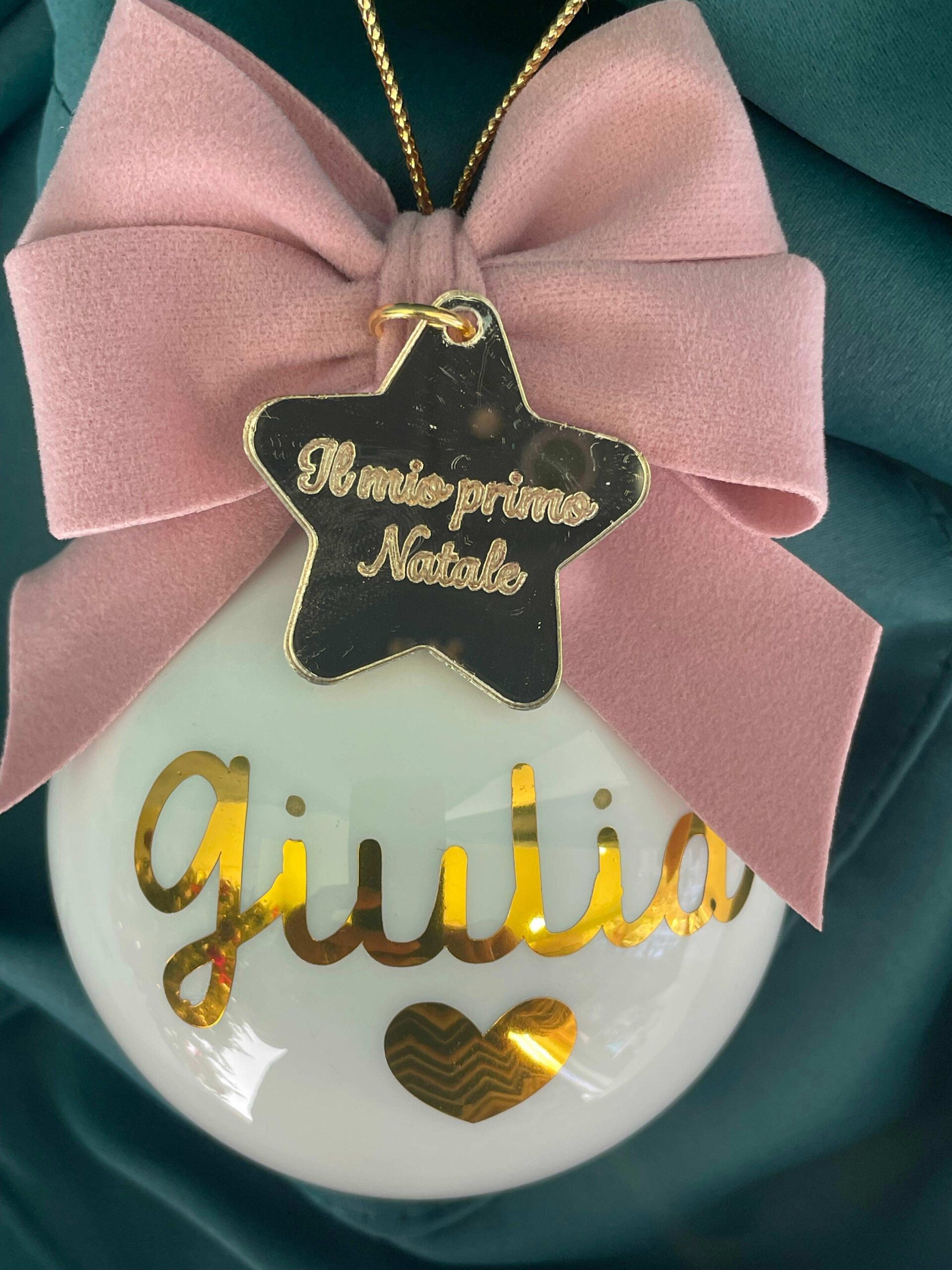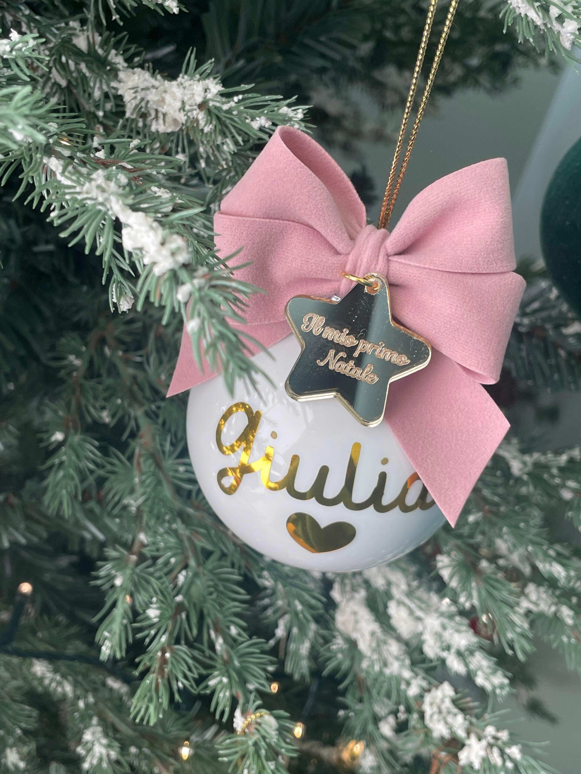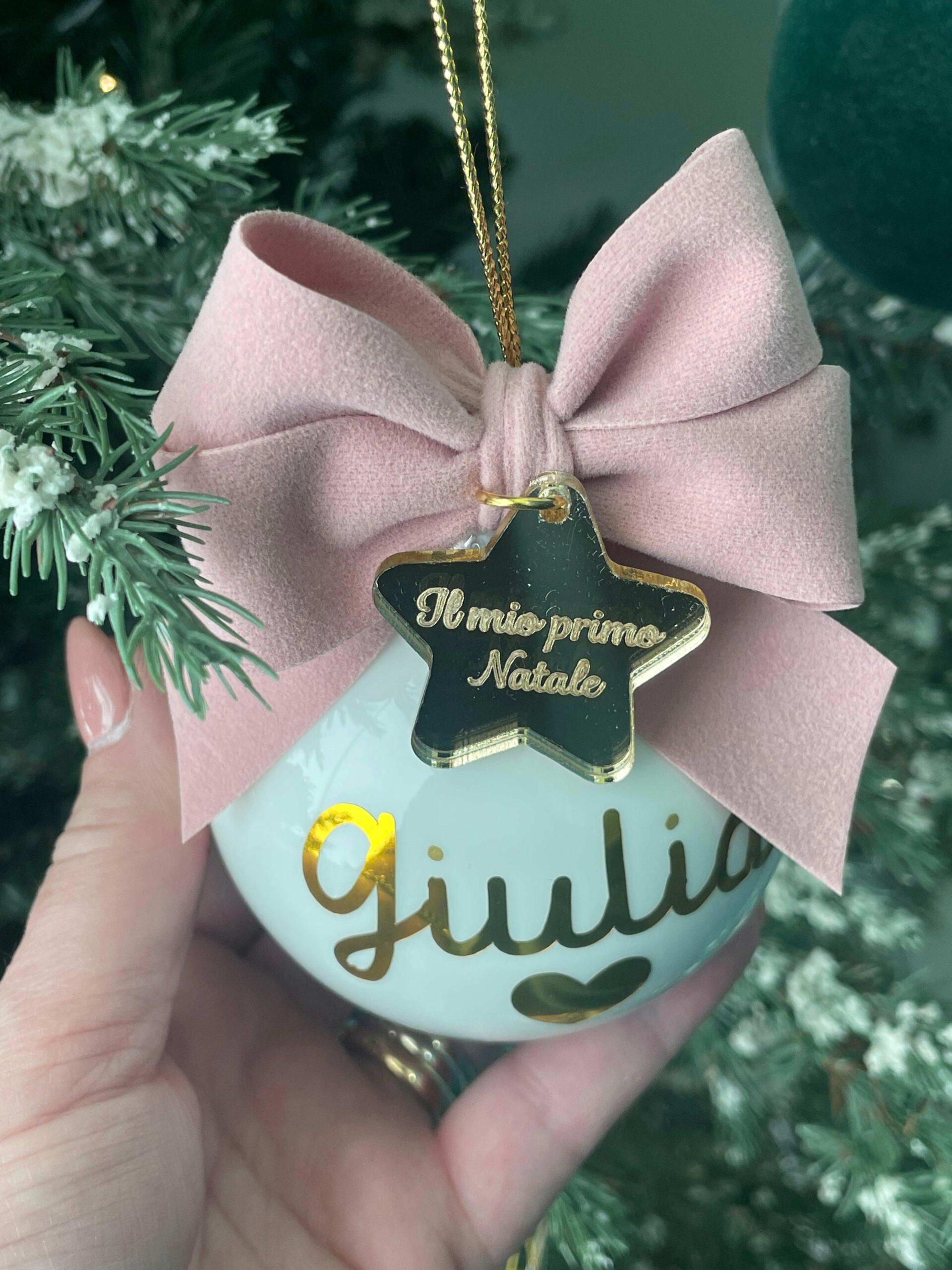 Pallina bianca in vetro personalizzata con nome o sagoma, in oro, con l’applicazione di una stellina con frase.