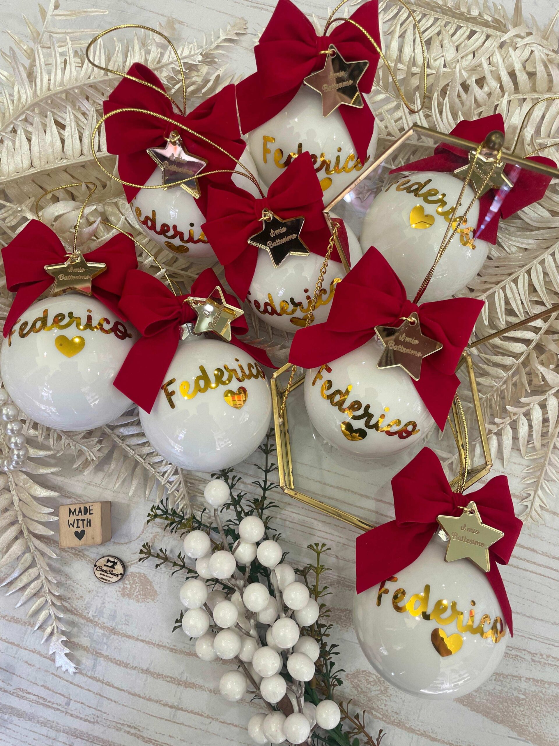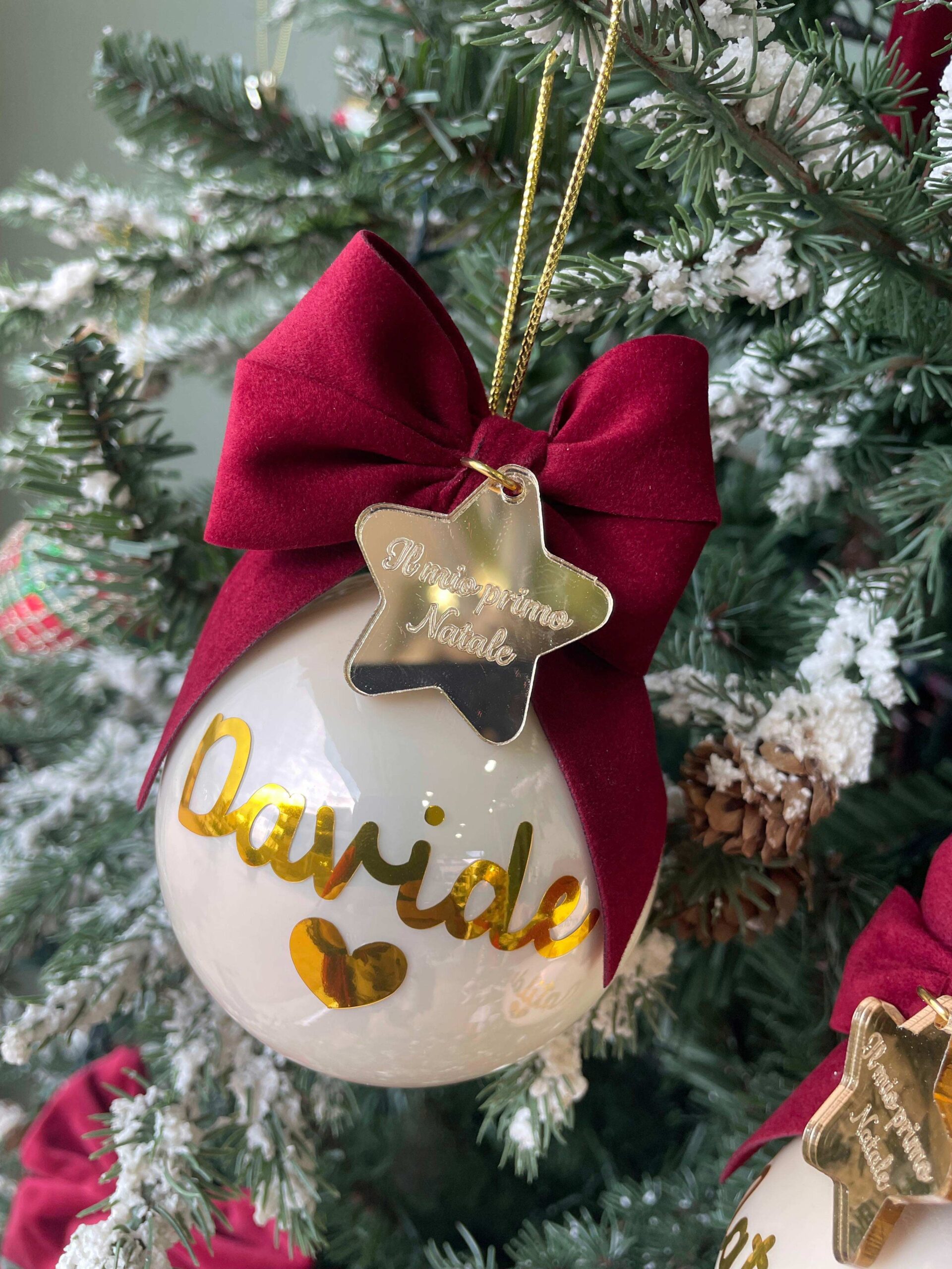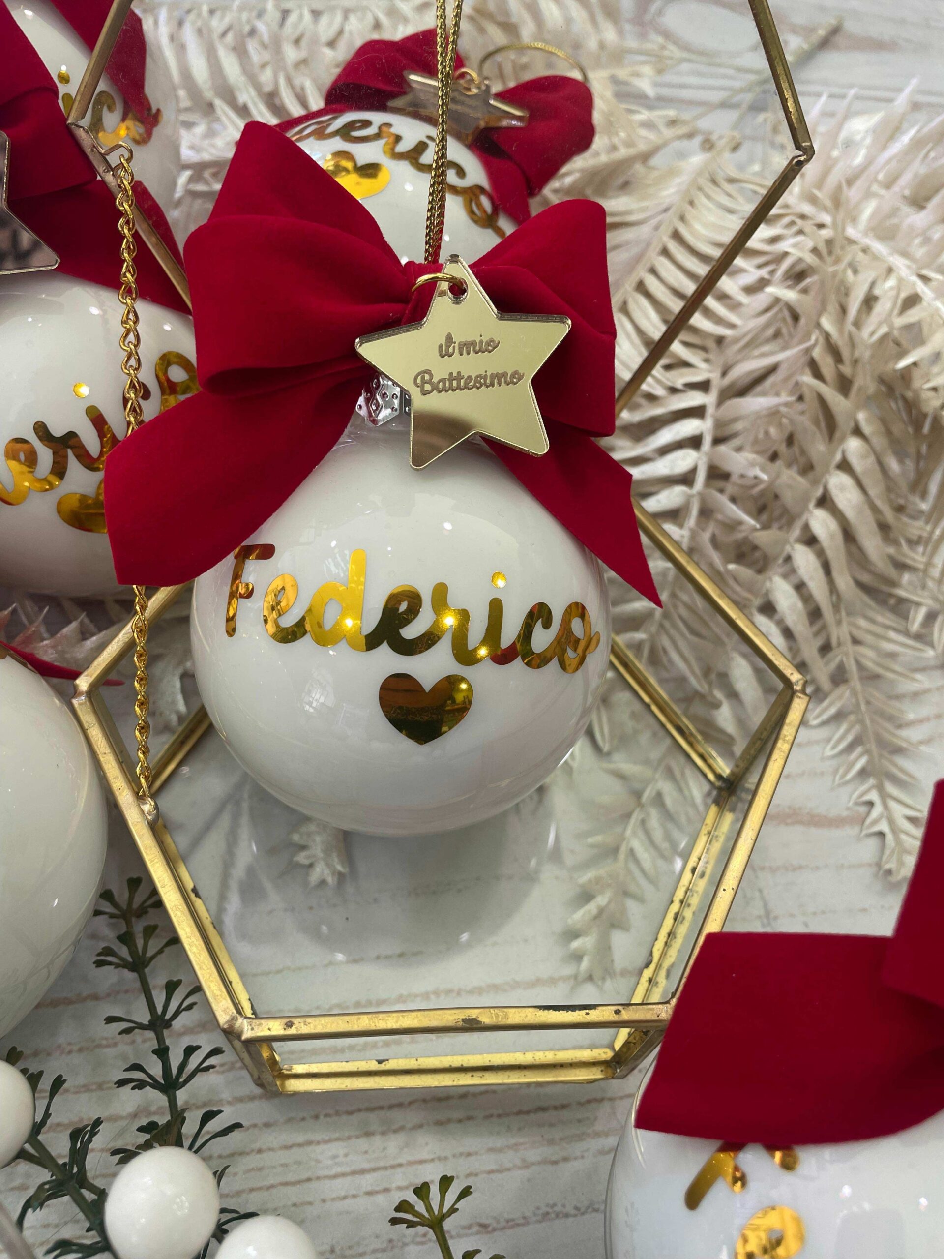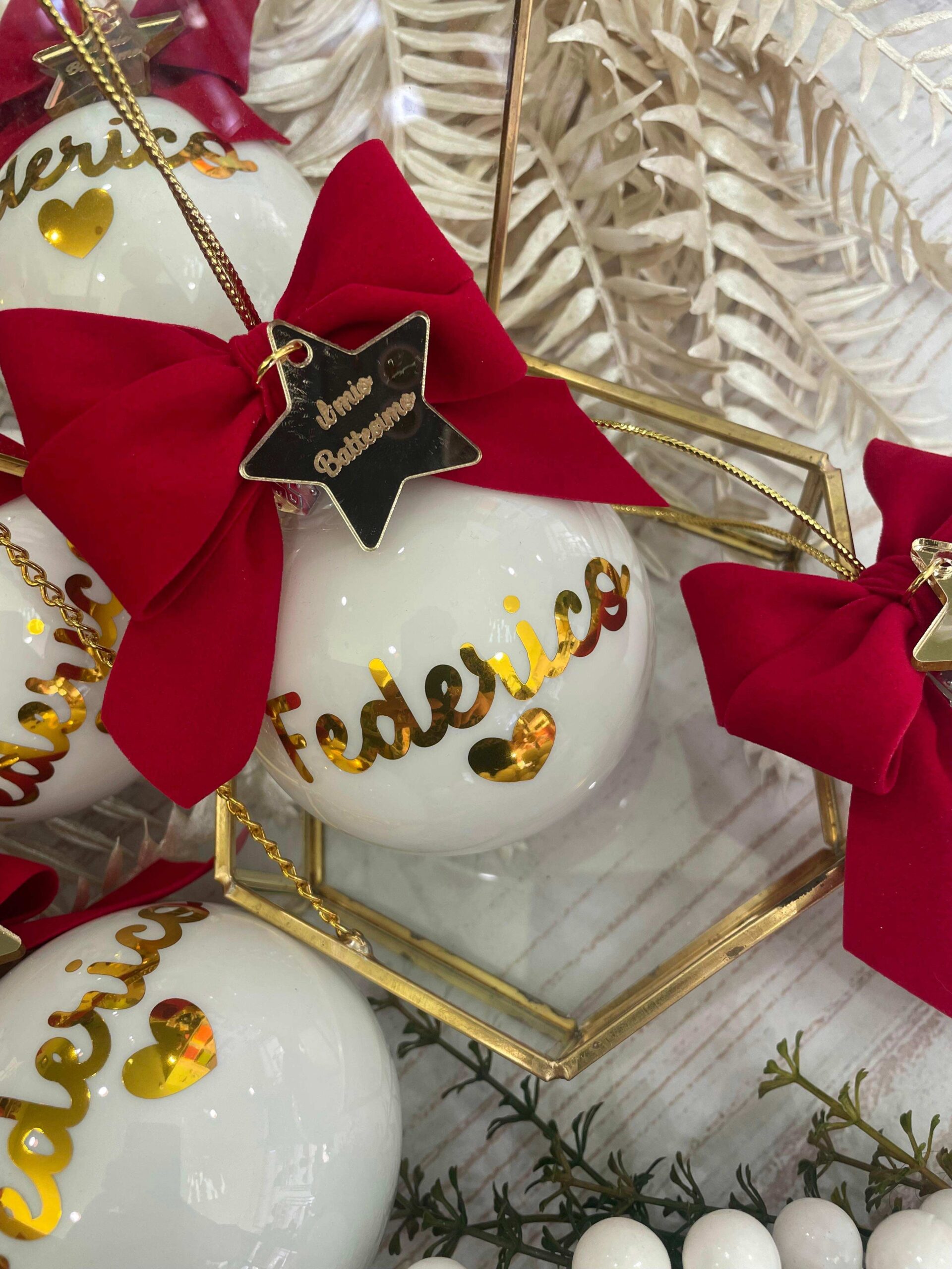 Pallina bianca in vetro personalizzata con nome o sagoma, in oro, con l’applicazione di una stellina con frase.