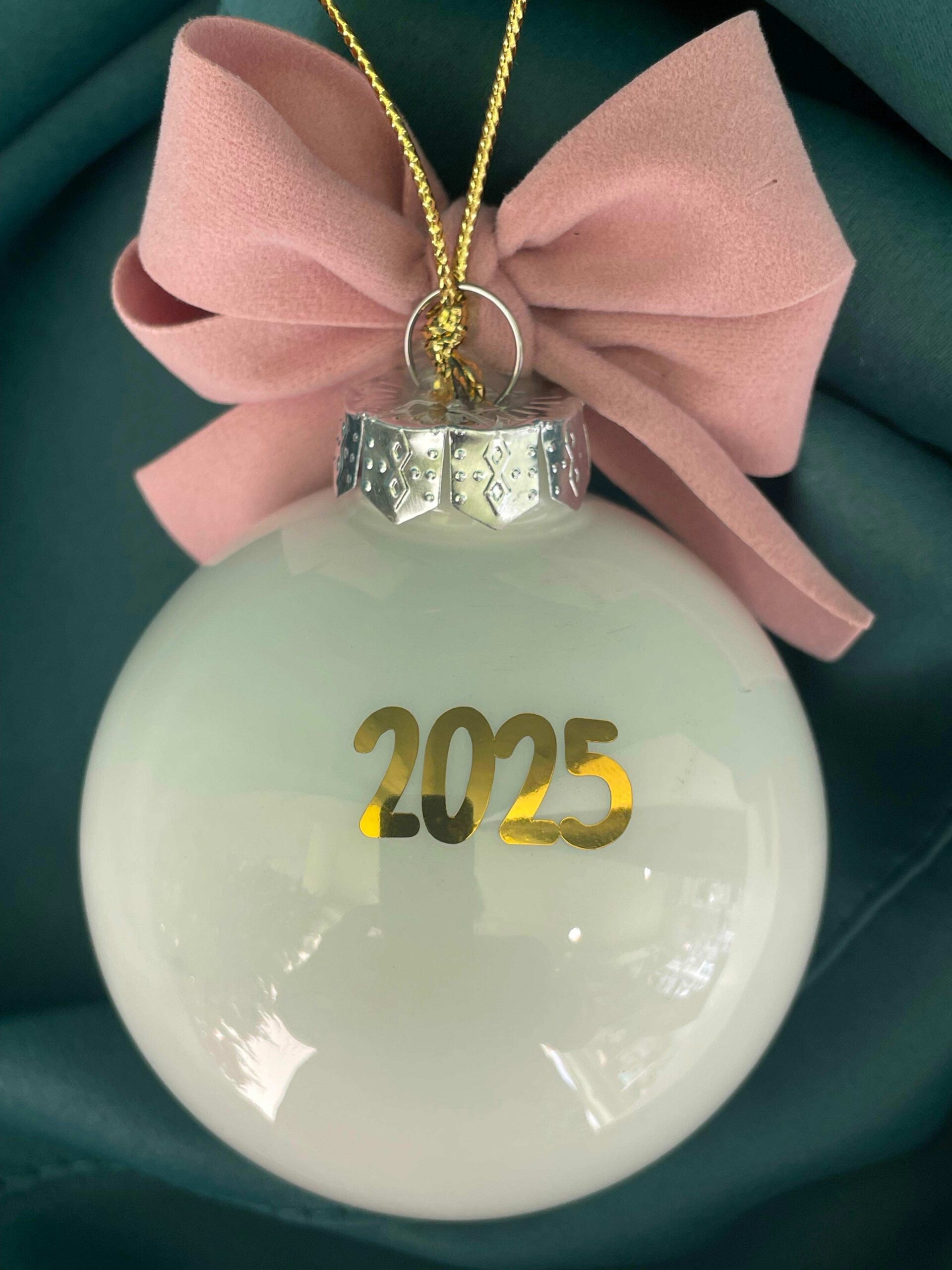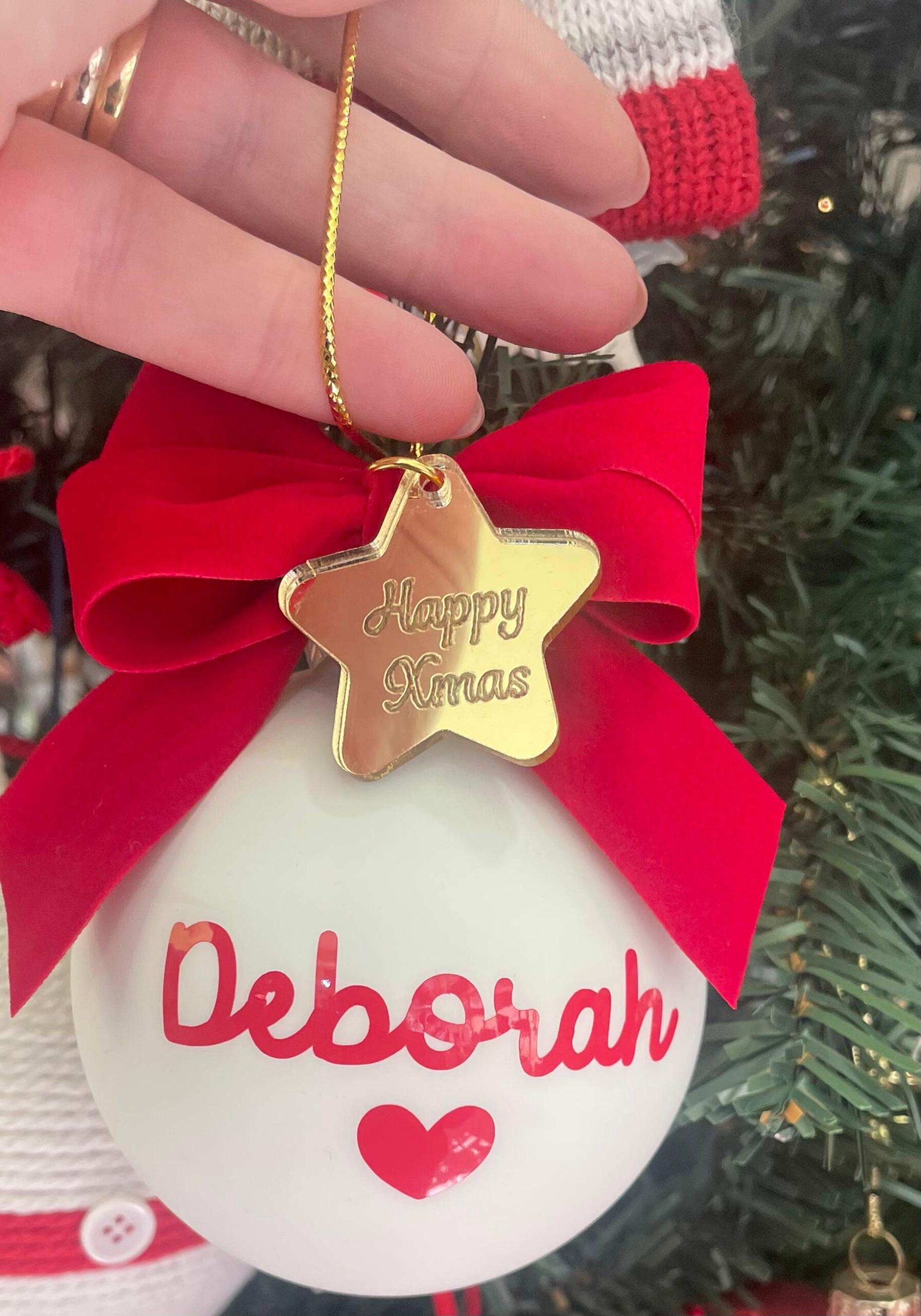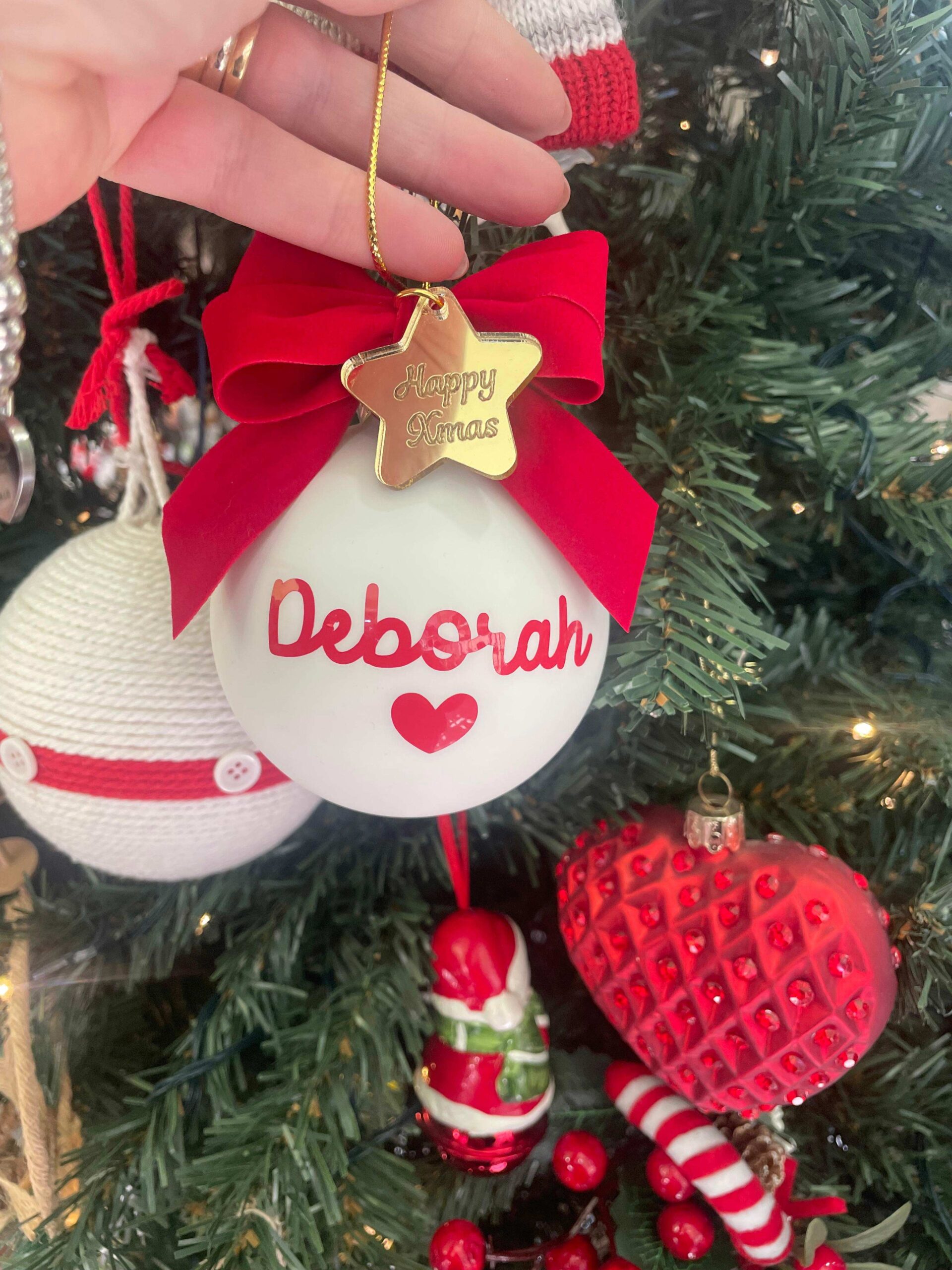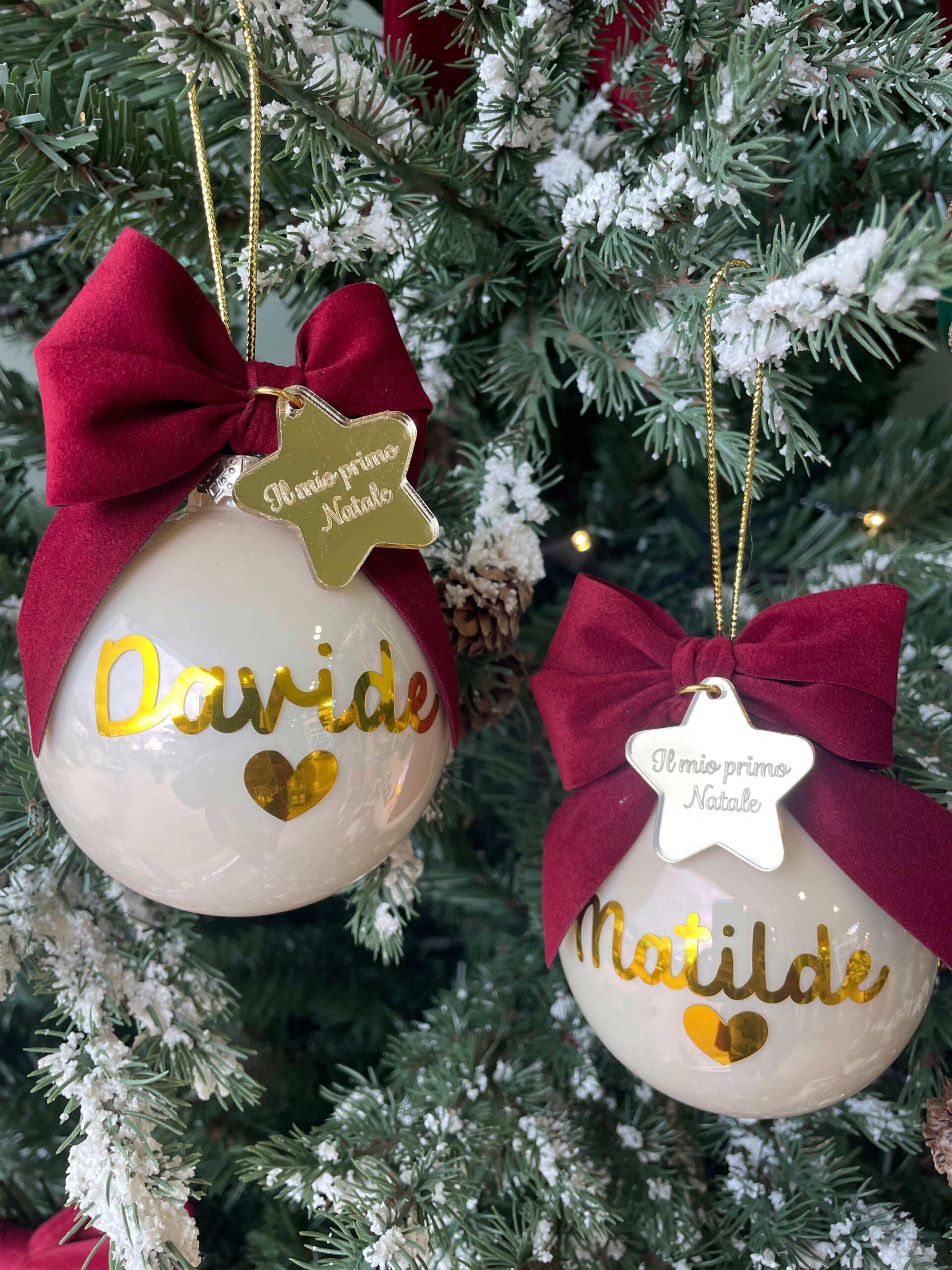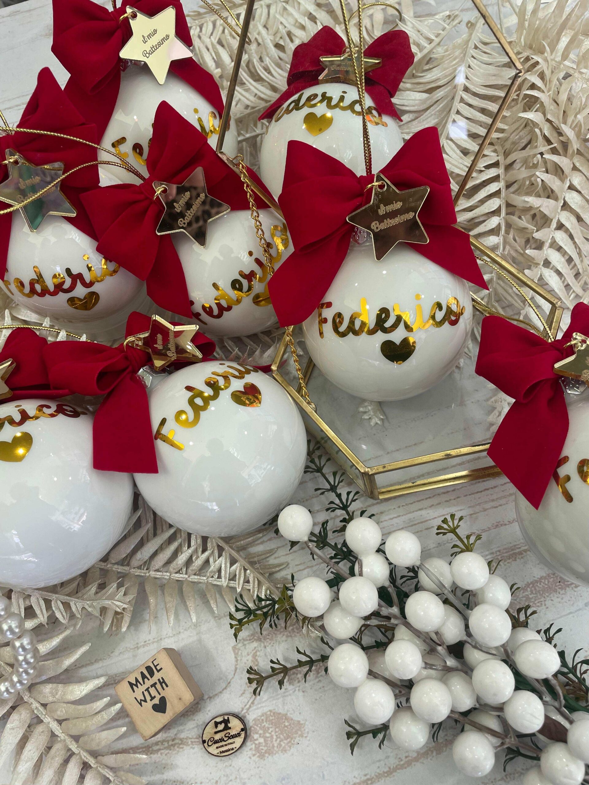 Pallina bianca in vetro personalizzata con nome o sagoma, in oro, con l’applicazione di una stellina con frase.