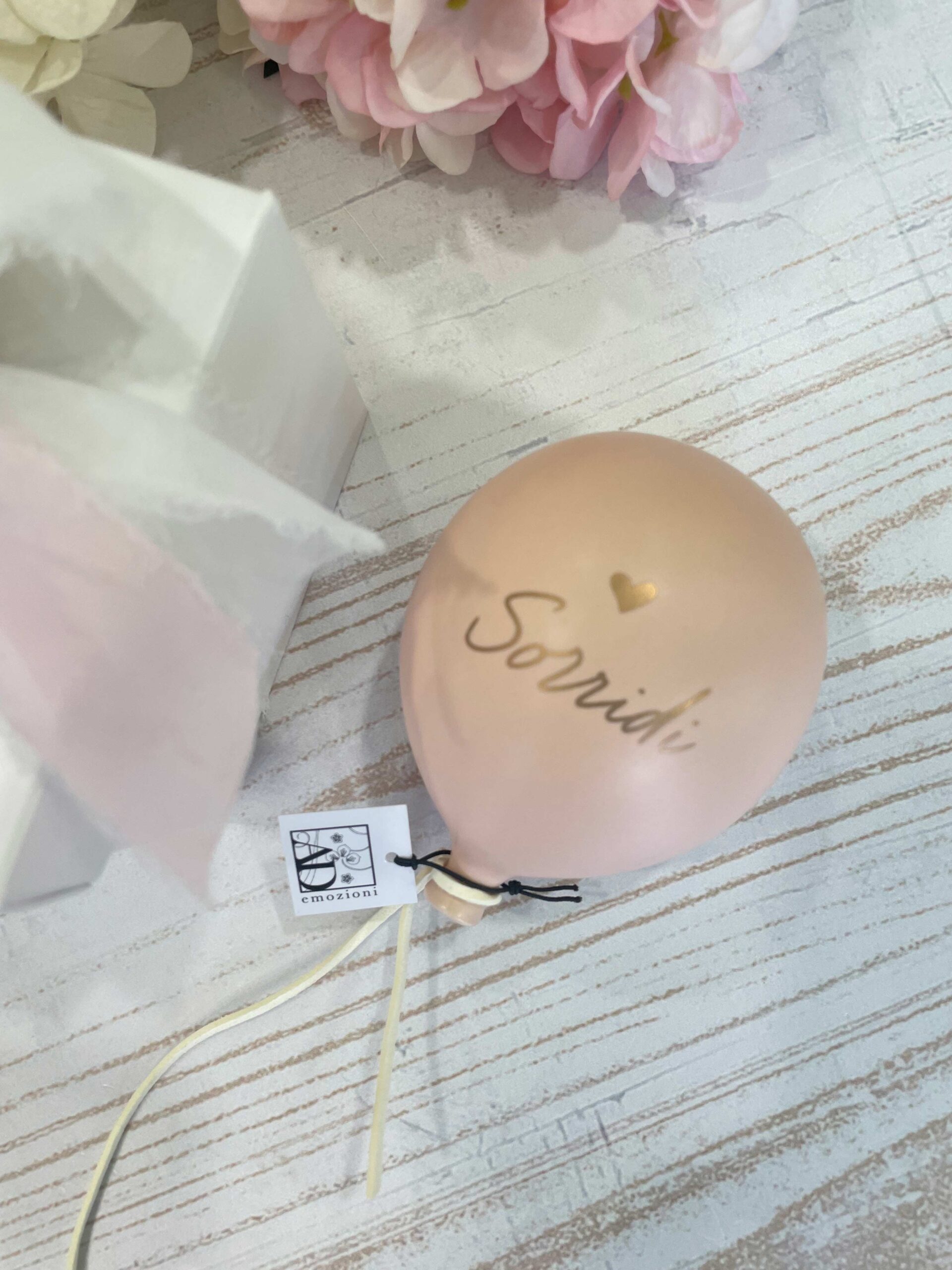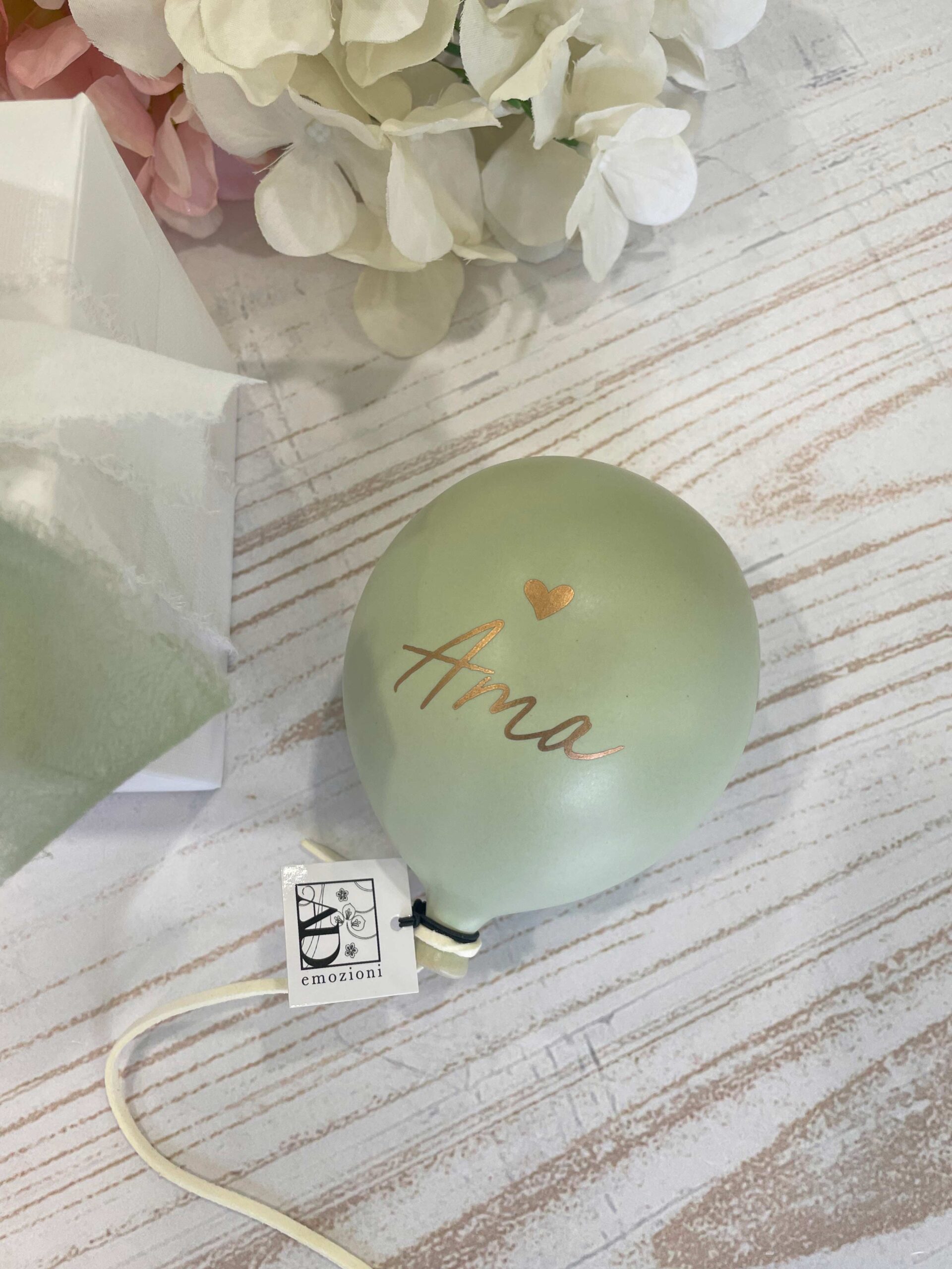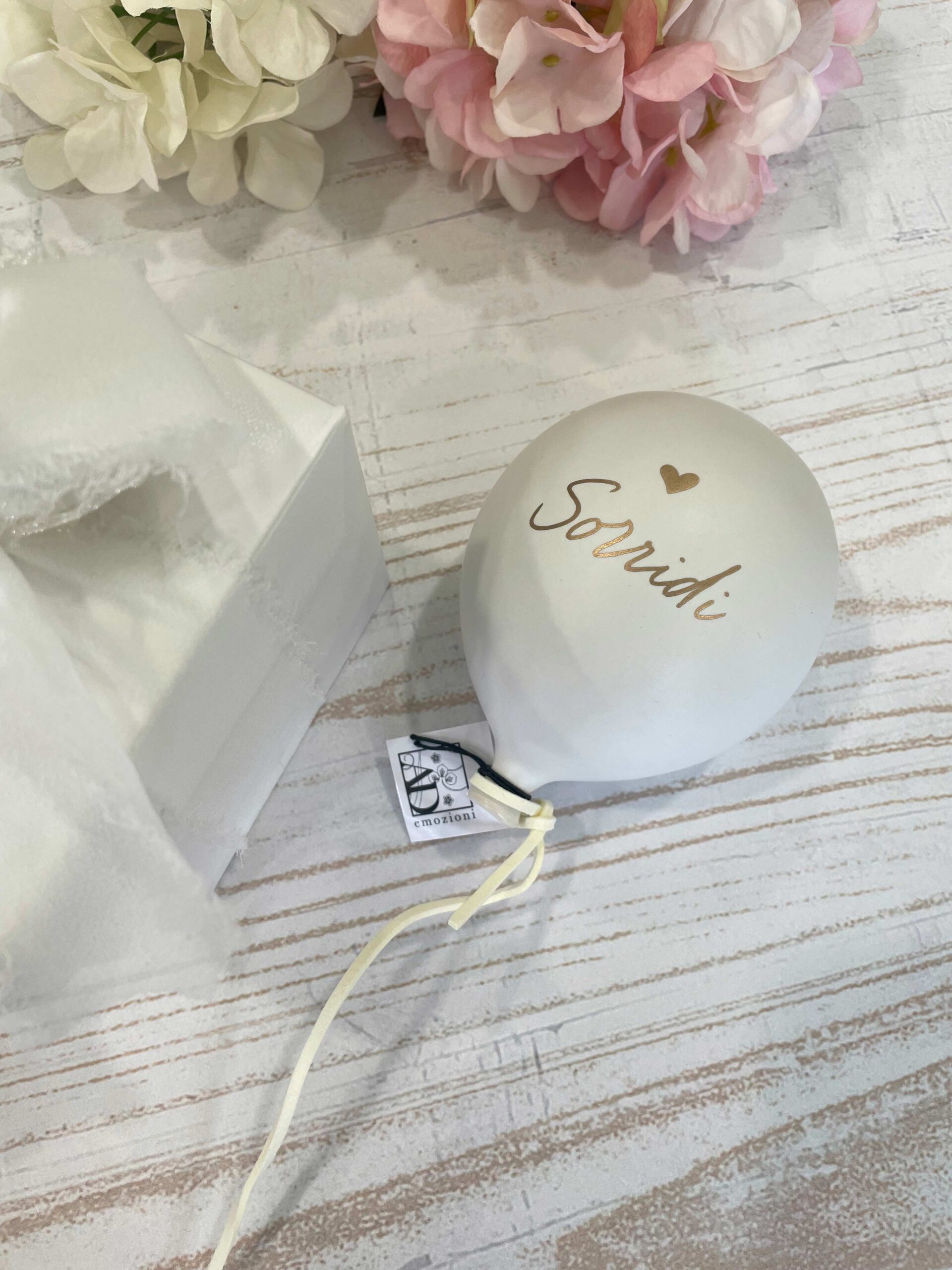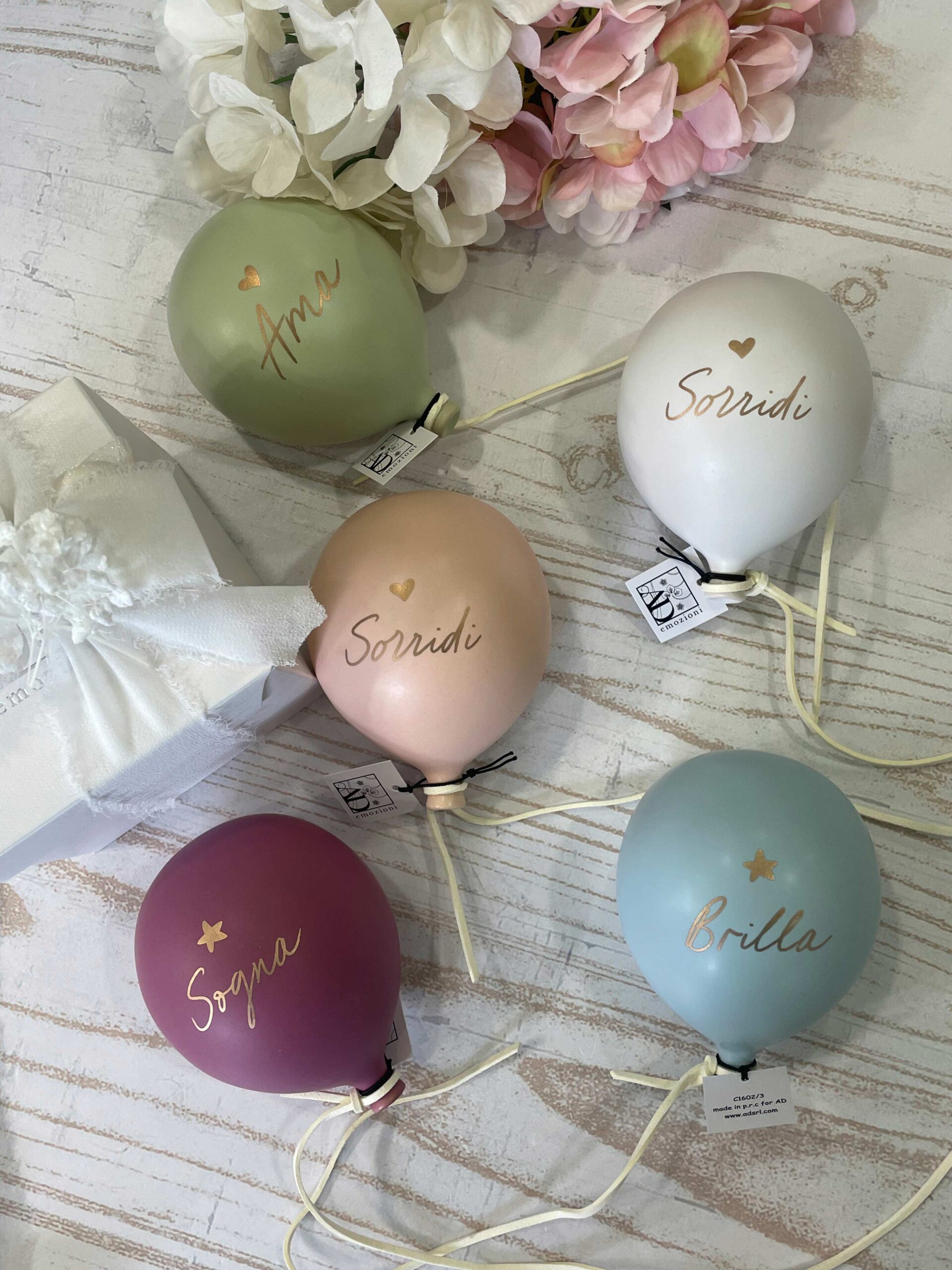 Palloncini in ceramica, in colori pastello, con parole ispirazionali colore oro. Art. C1602.