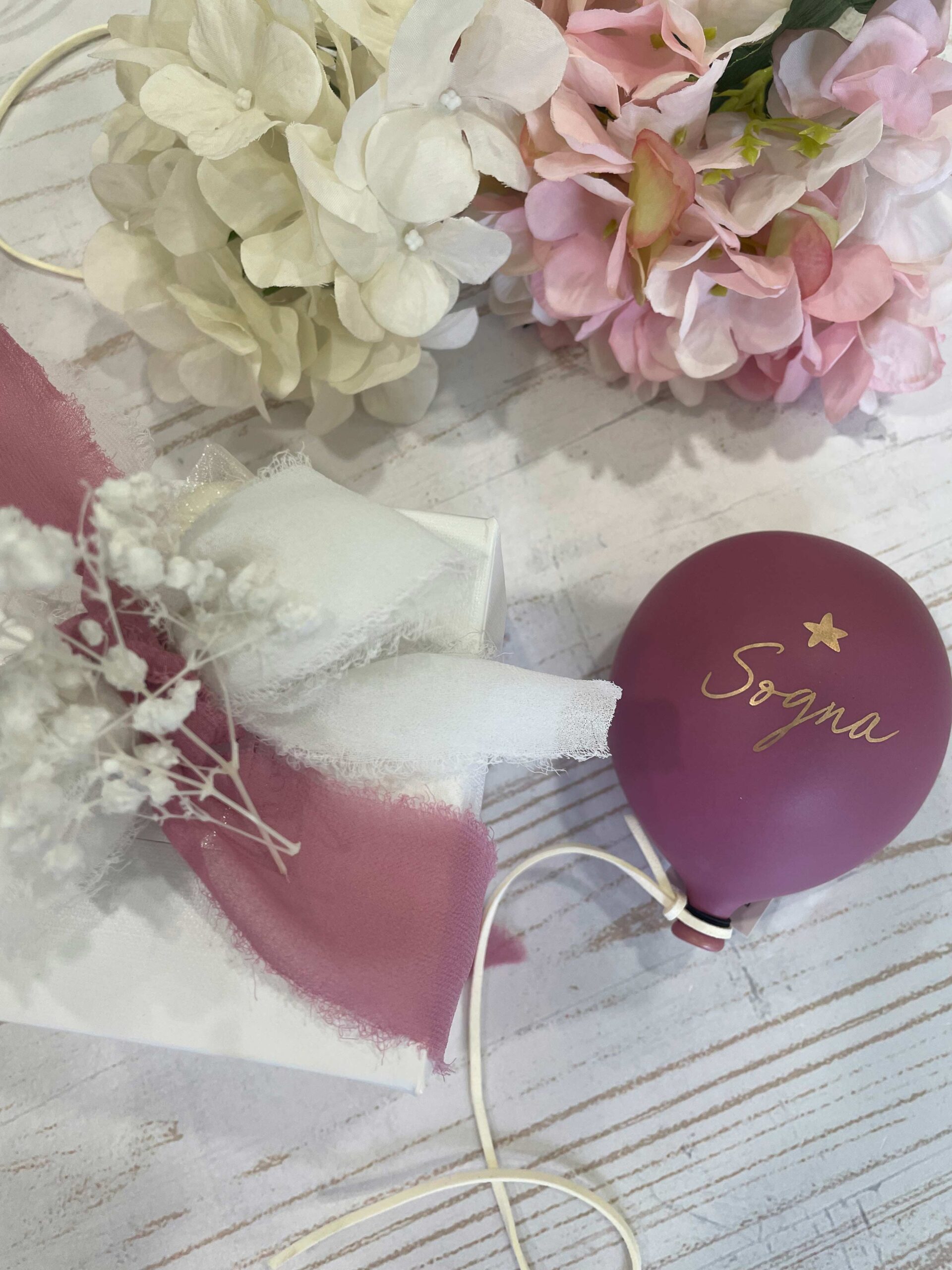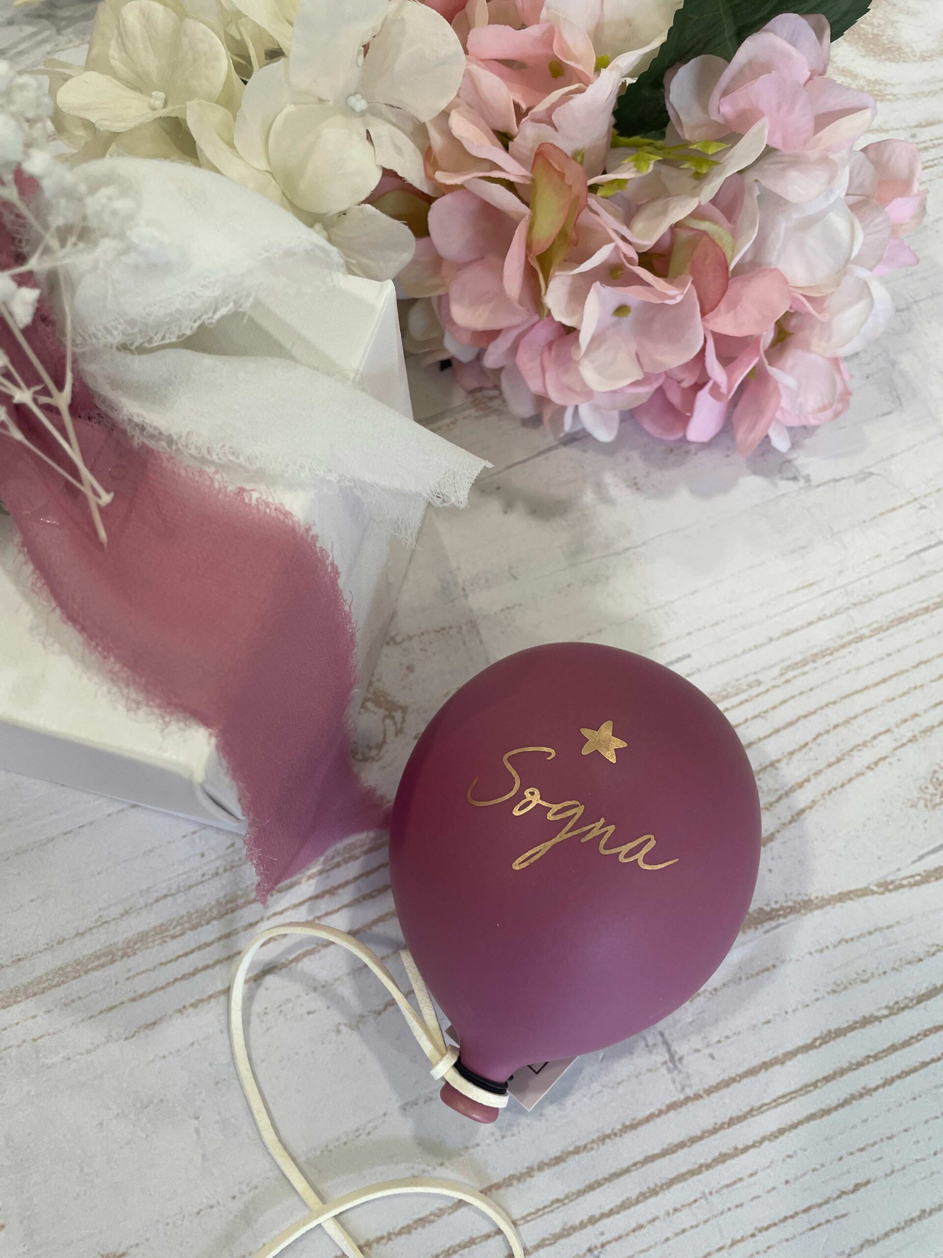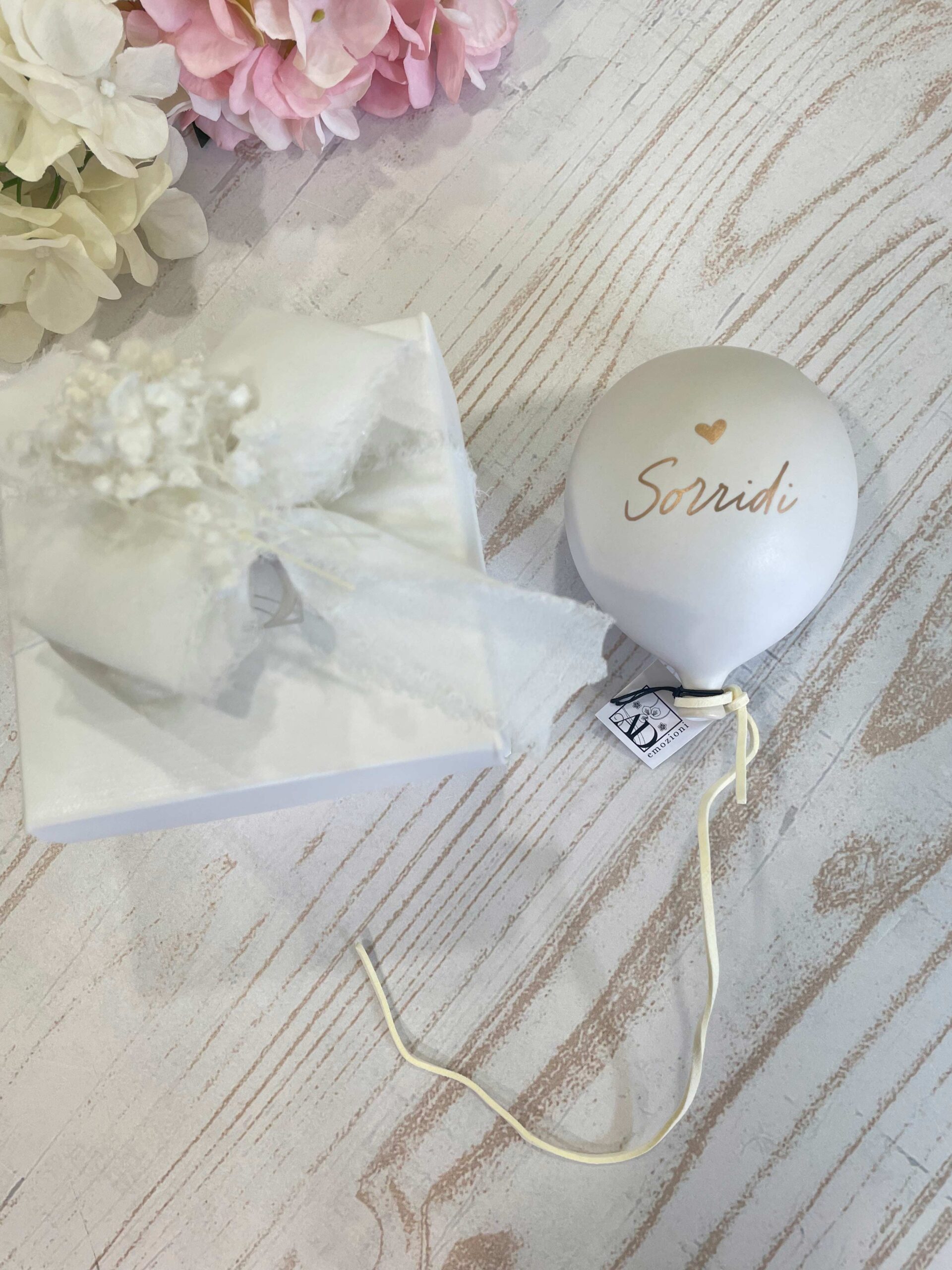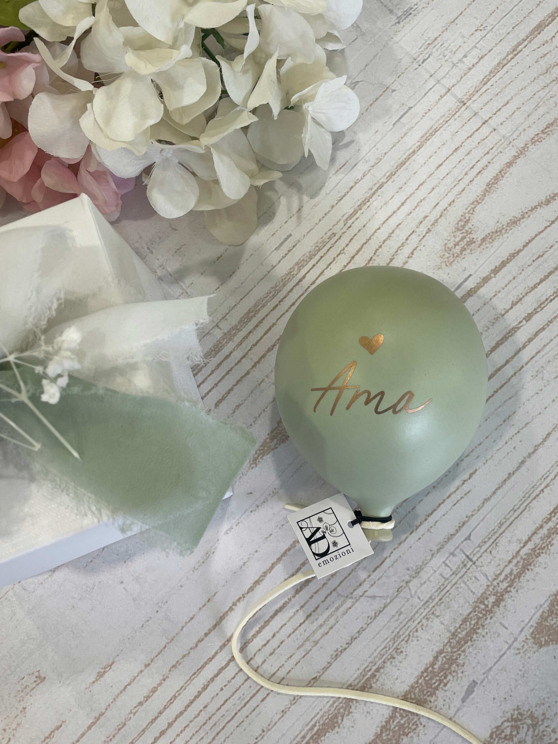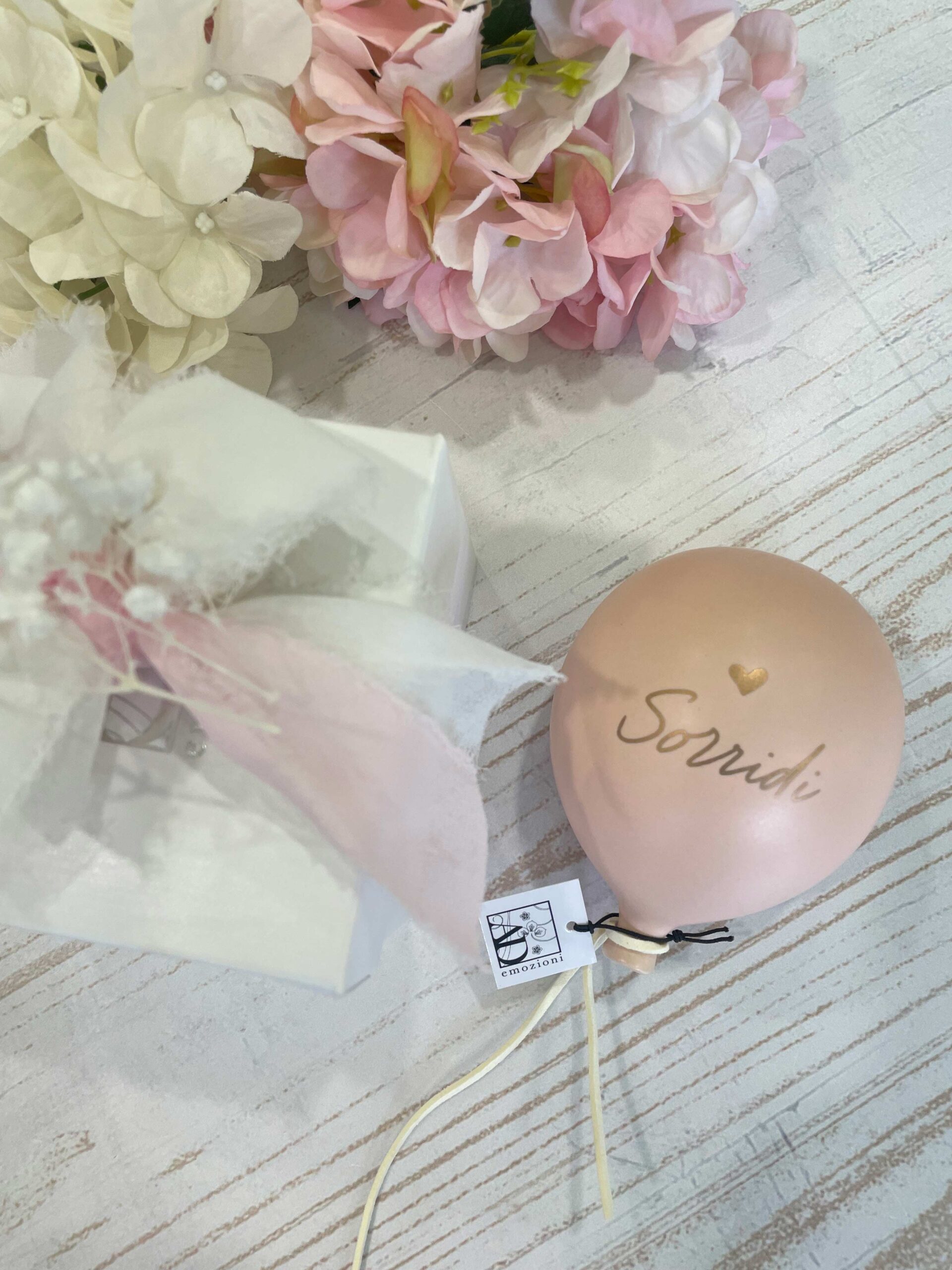 Palloncini in ceramica, in colori pastello, con parole ispirazionali colore oro. Art. C1602.