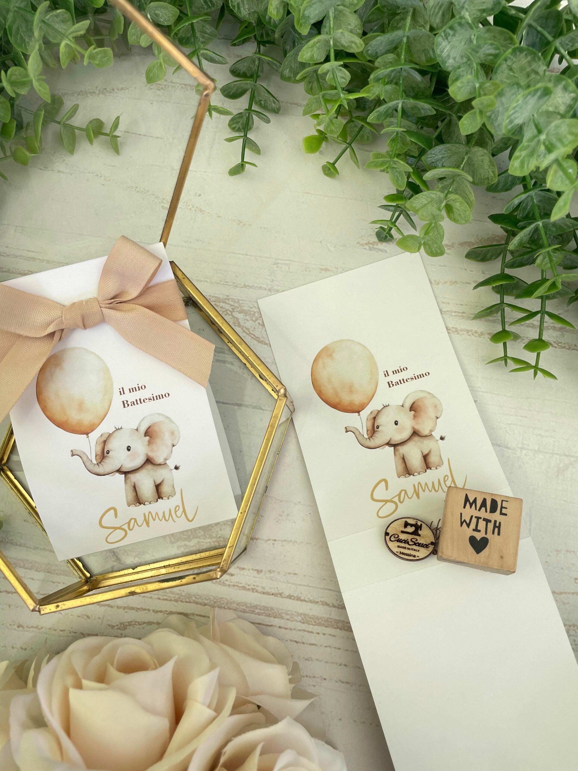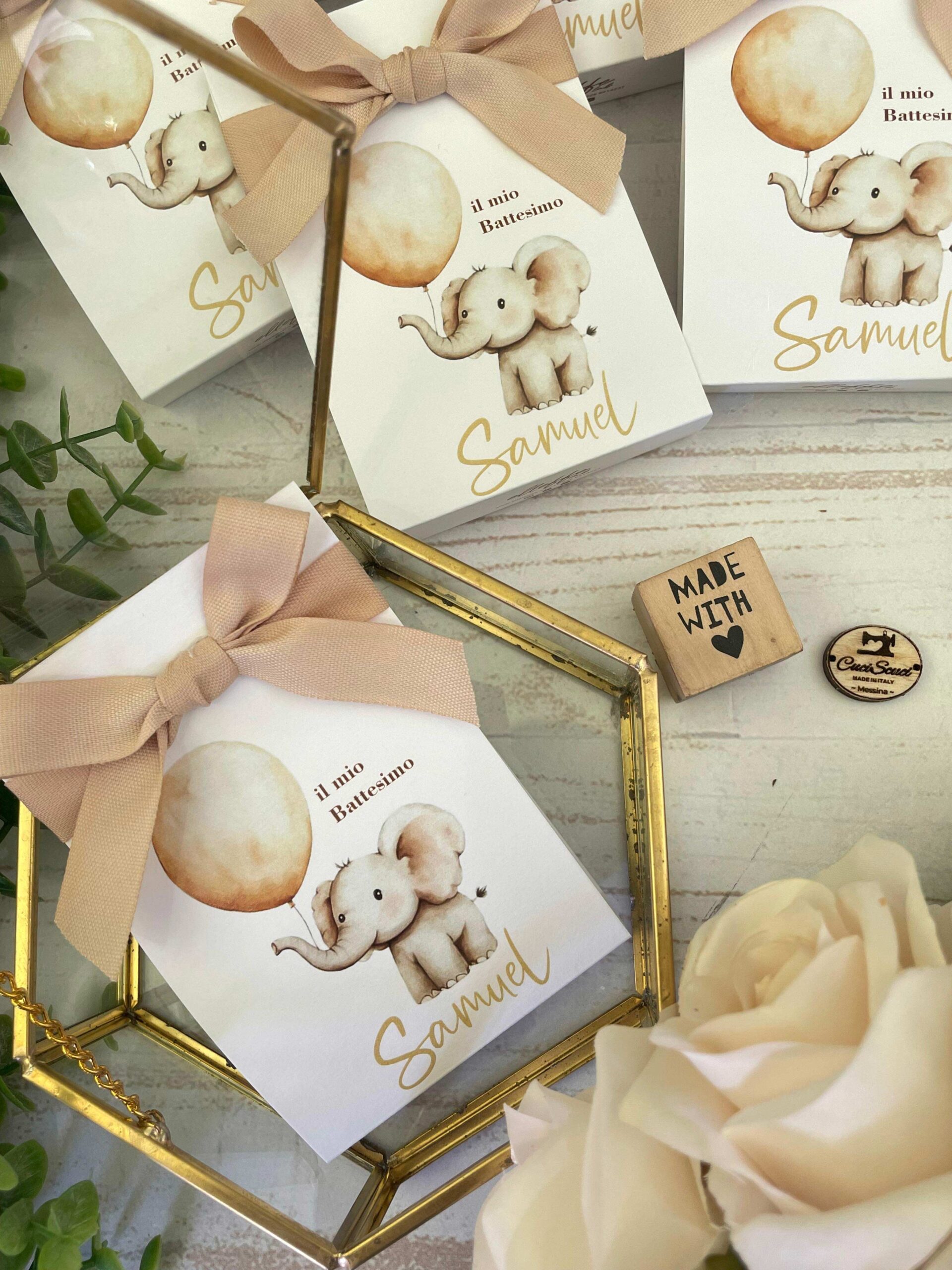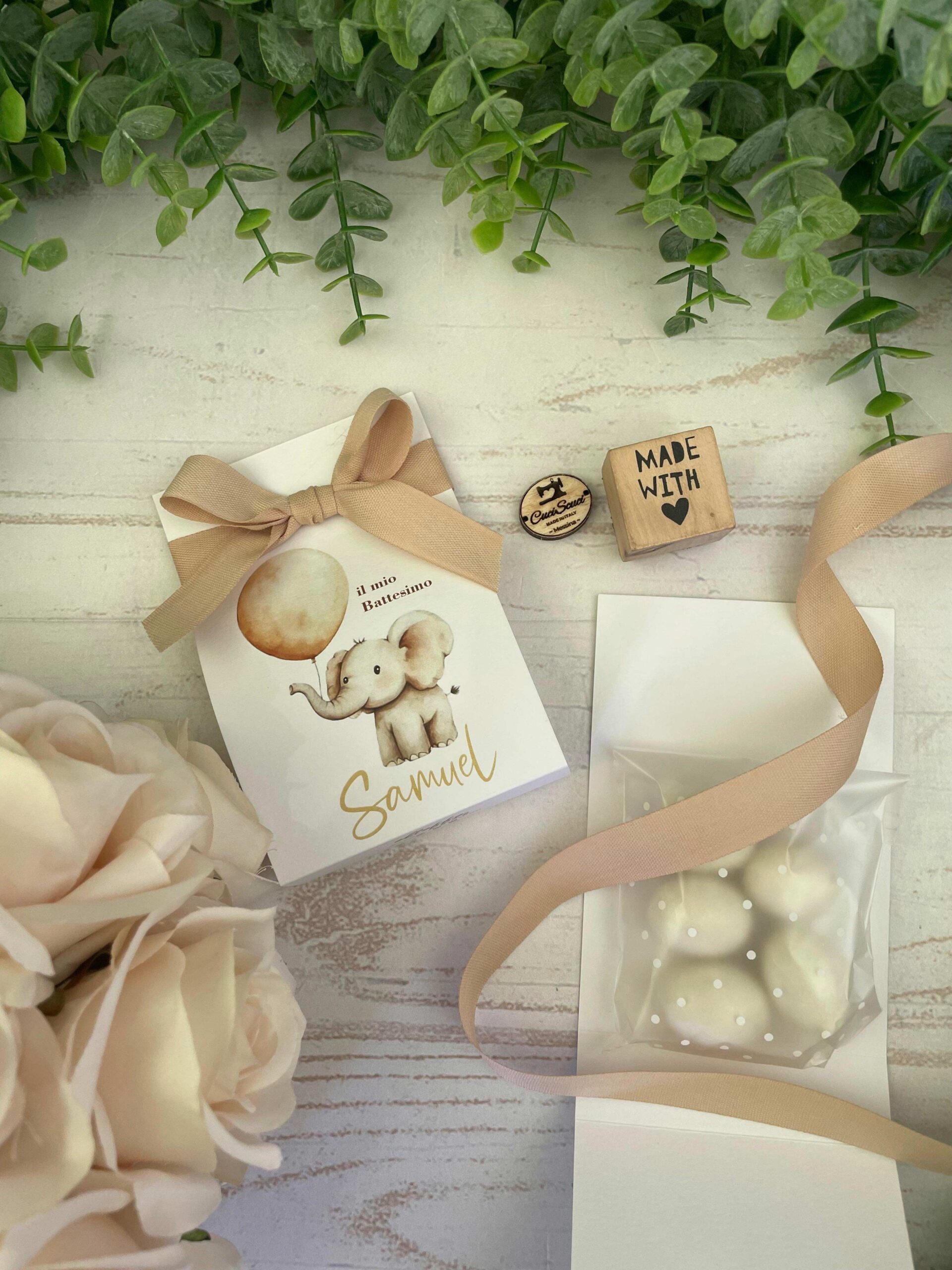 Porta confetti, con grafica personalizzata tema elefantino, in cartoncino.