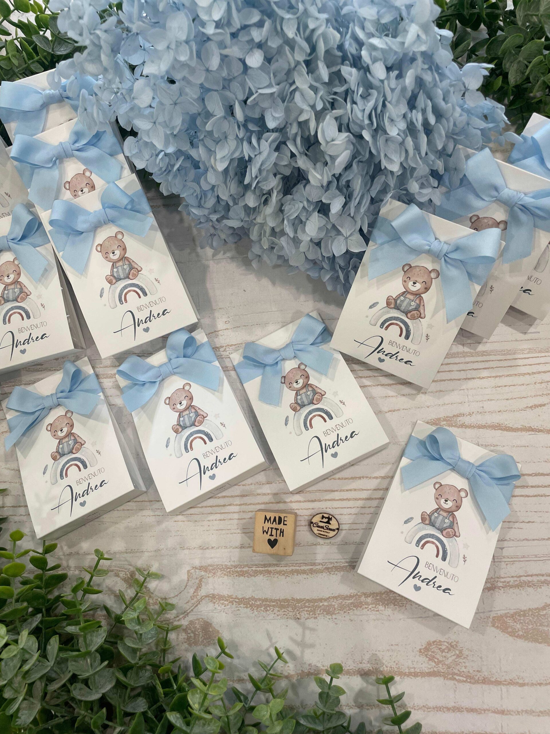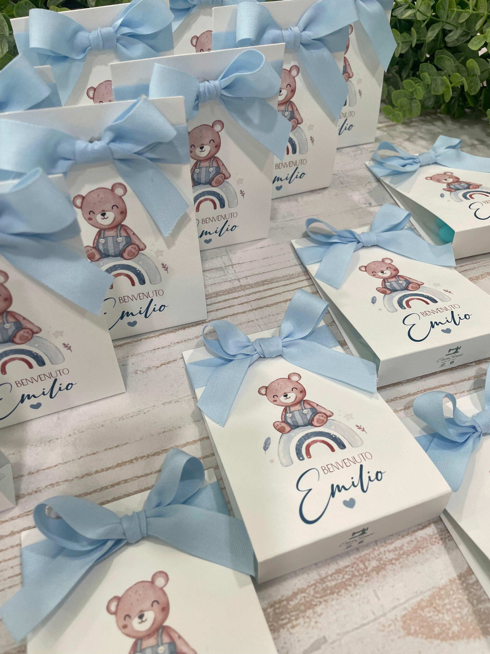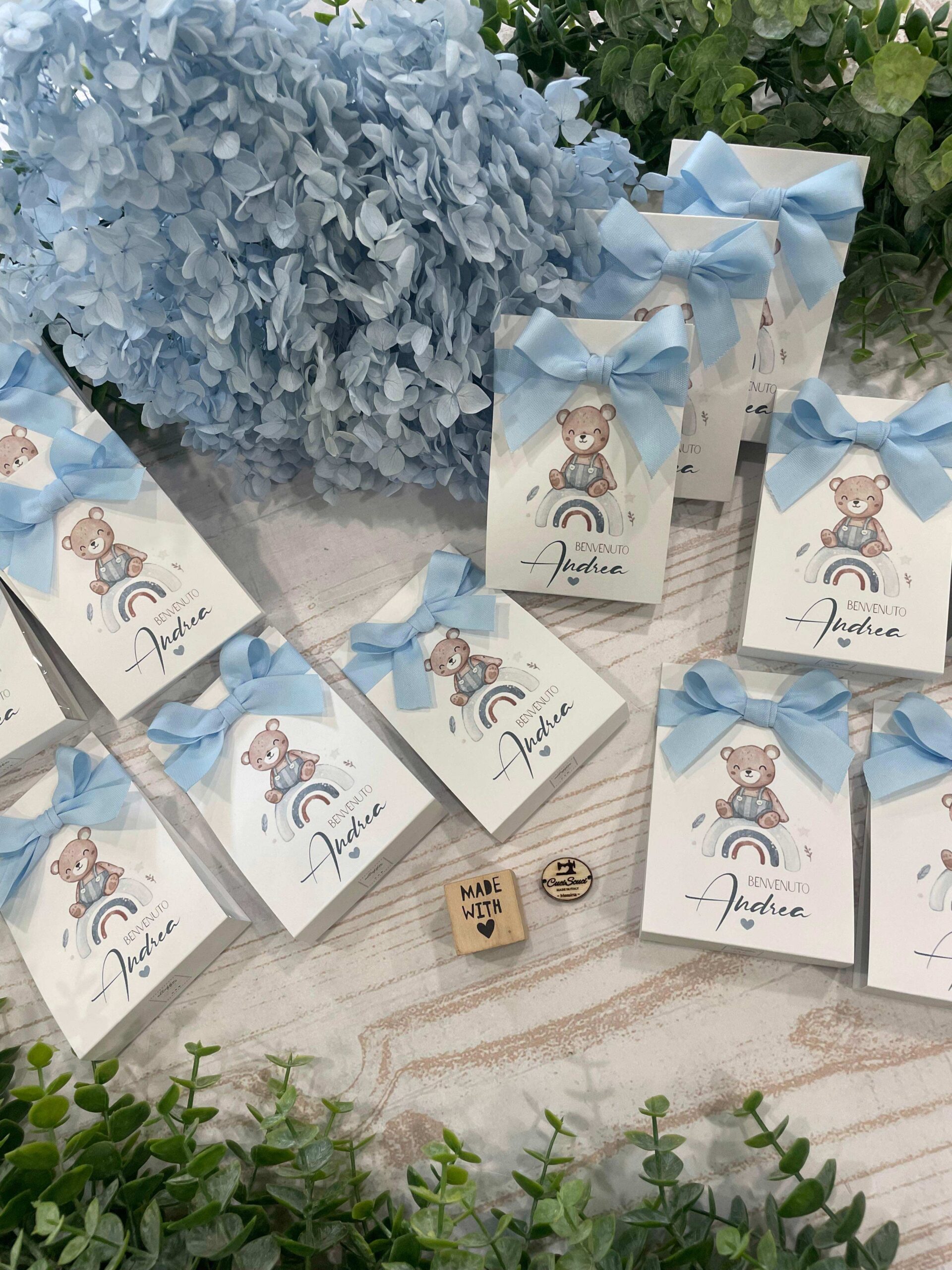 Porta confetti con grafica personalizzata, tema orsetto su arcobaleno nei toni del blu, in cartoncino. Art. 9225252001204