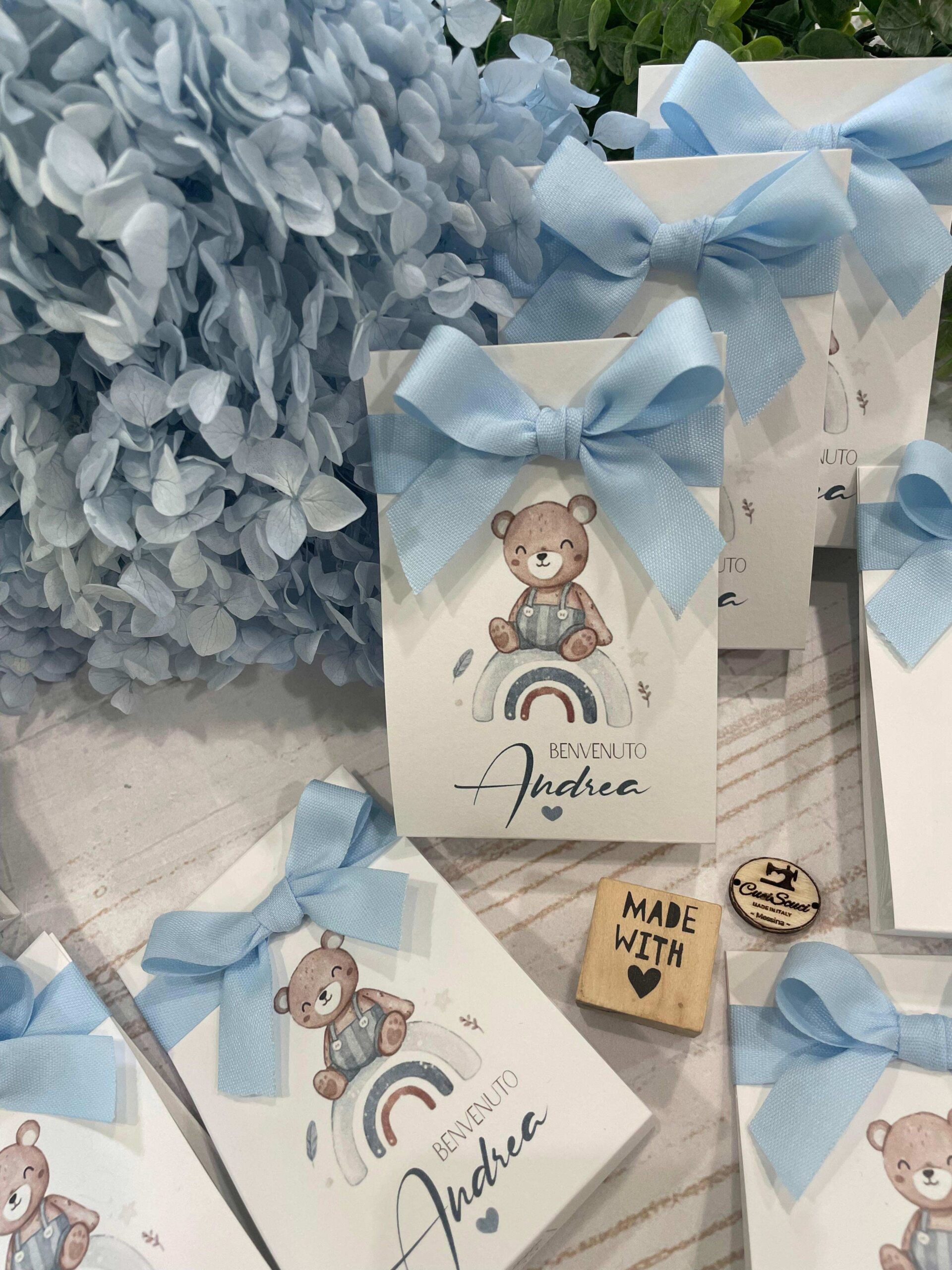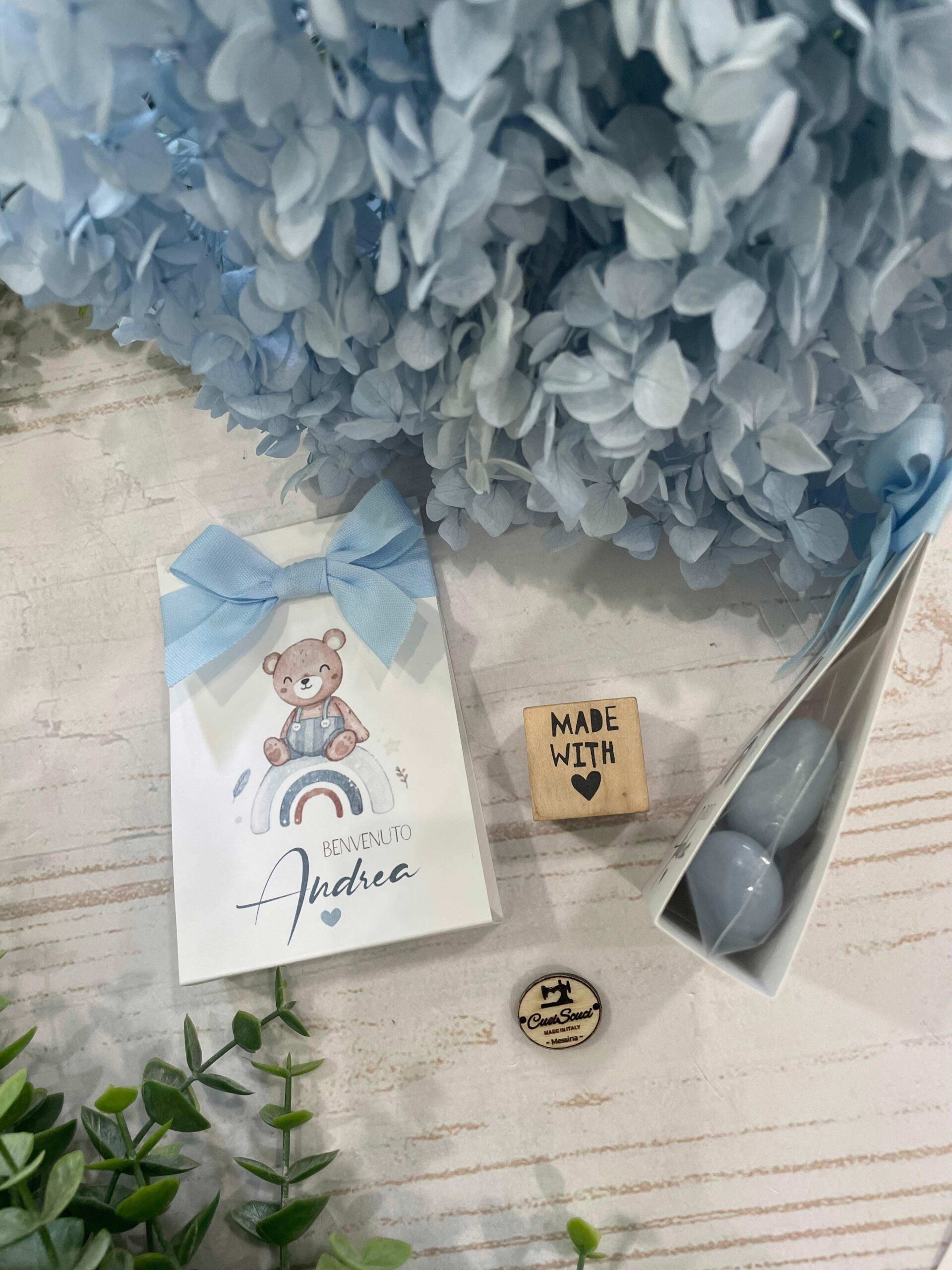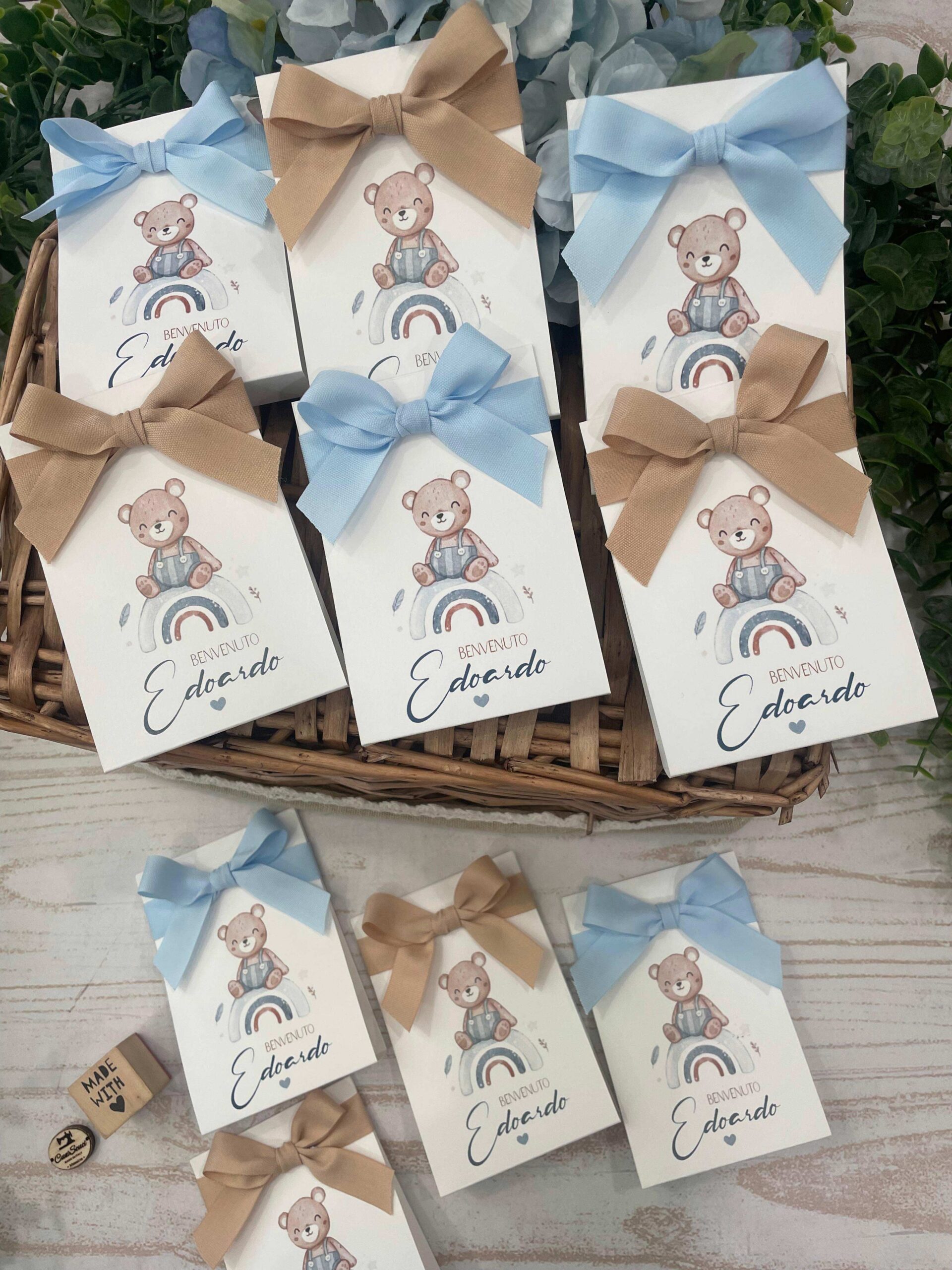 Porta confetti con grafica personalizzata, tema orsetto su arcobaleno nei toni del blu, in cartoncino. Art. 9225252001204