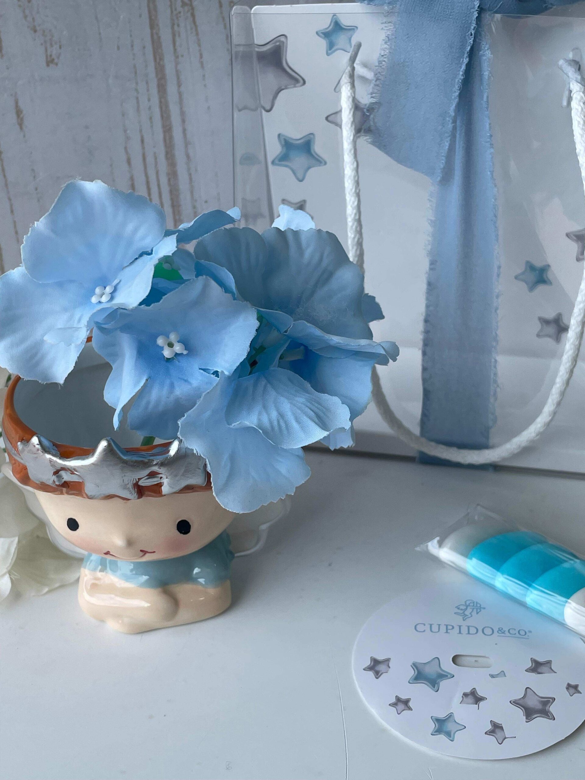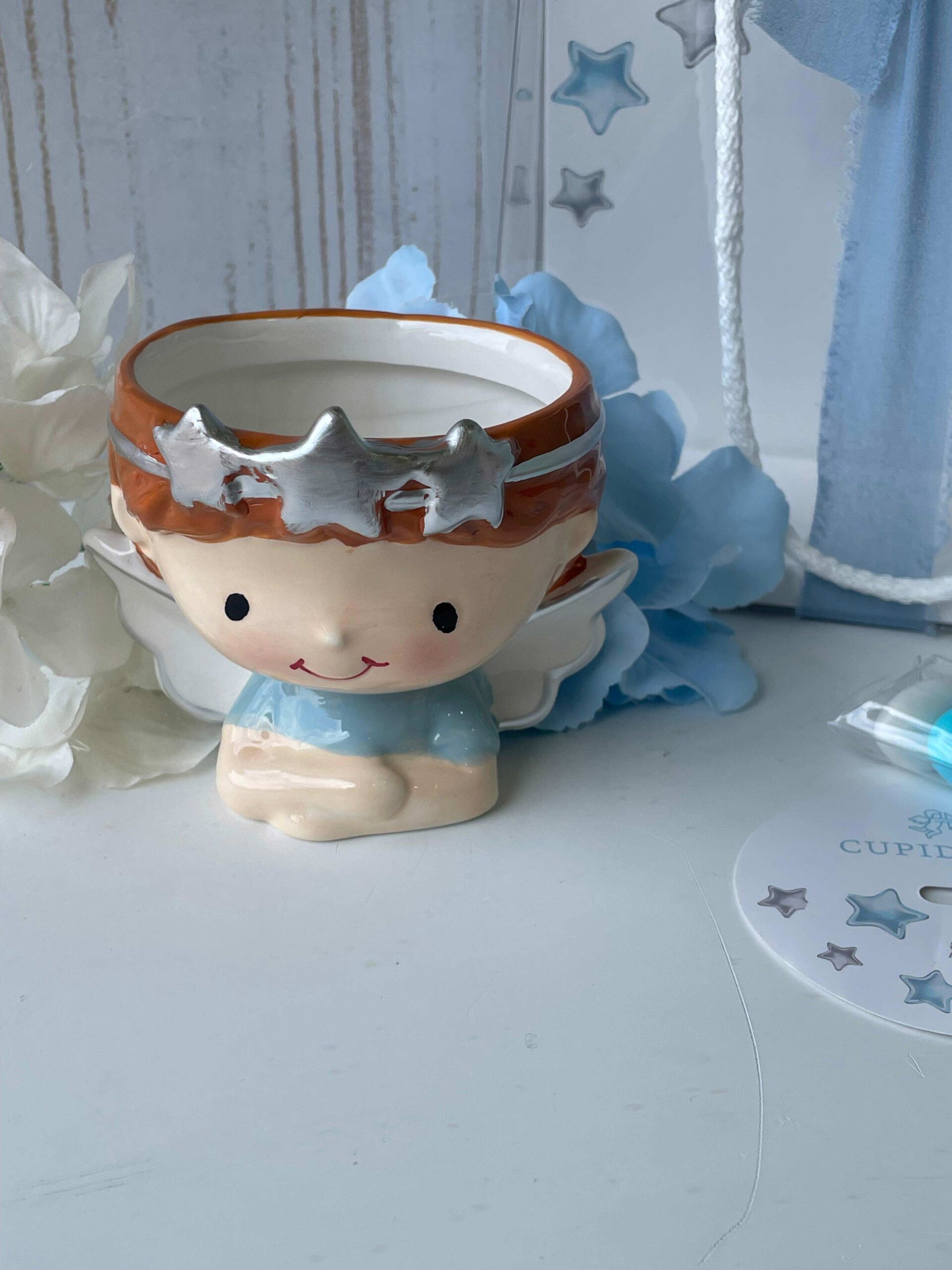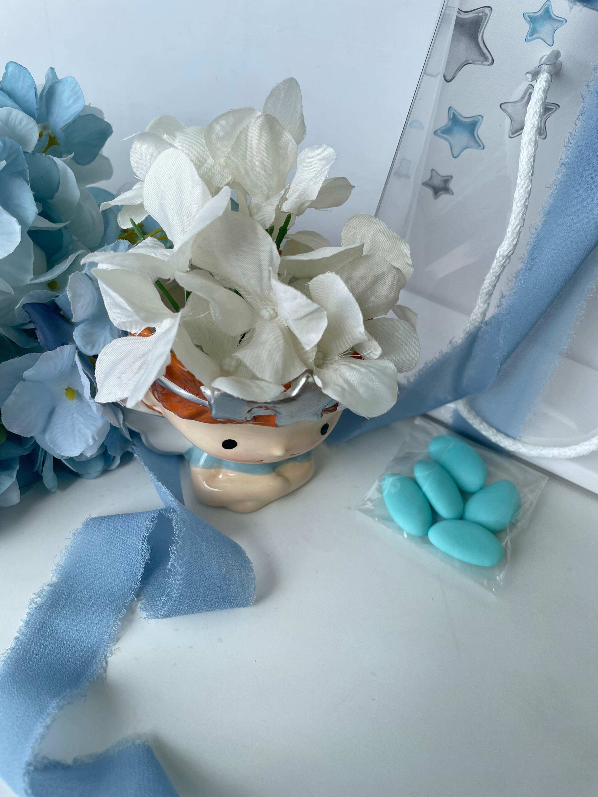 Porta piantina a forma di angioletto con tunica azzurra e ali bianche, decorato con una coroncina di stelle argento. Art. 249201S