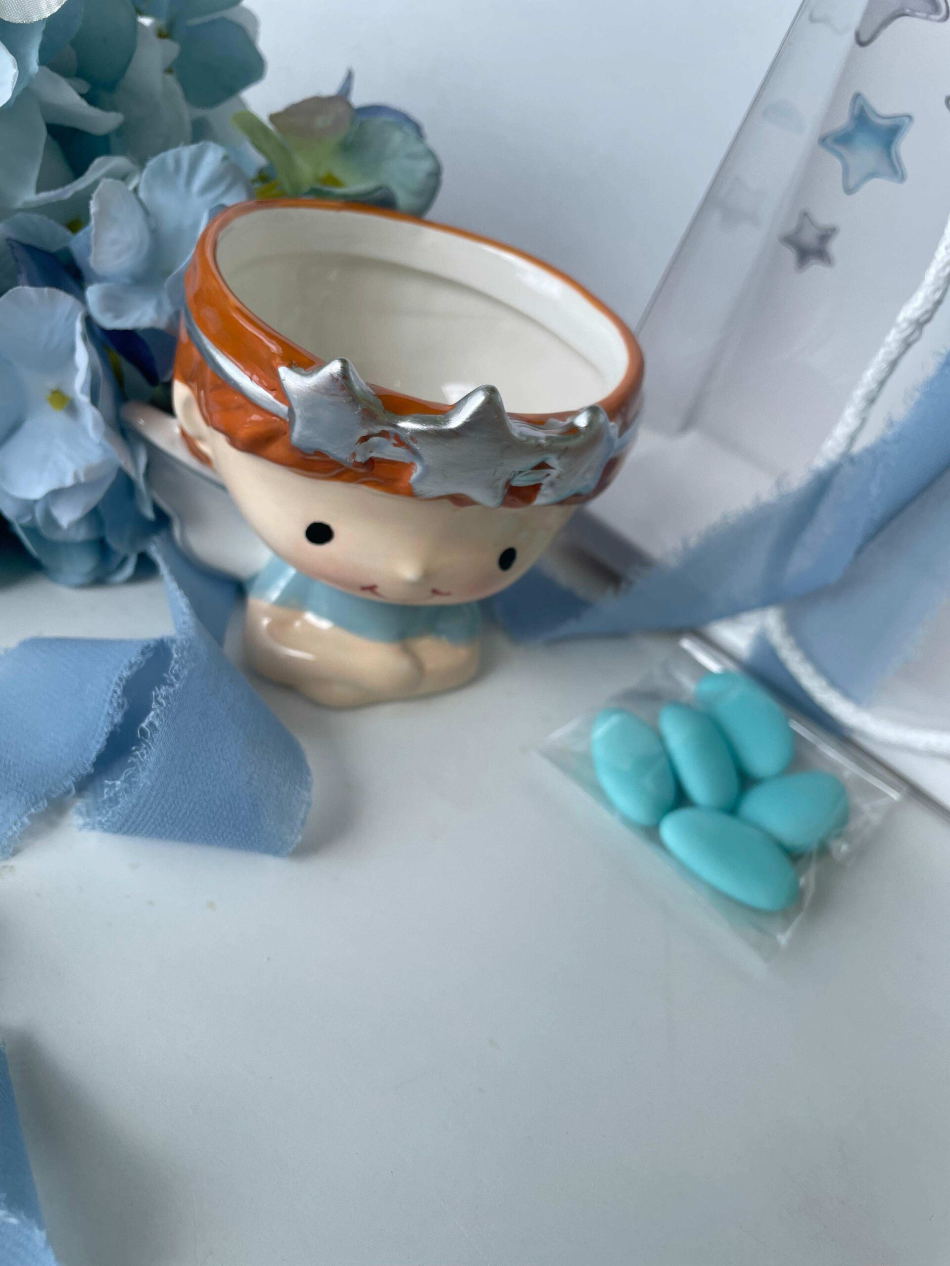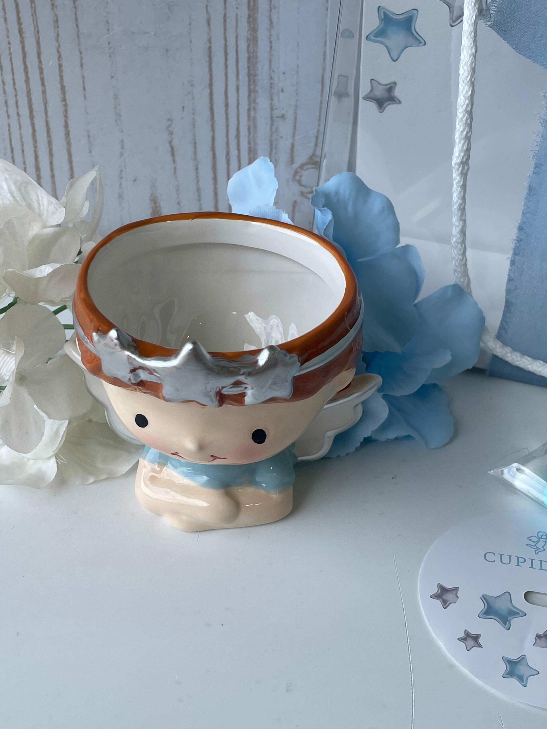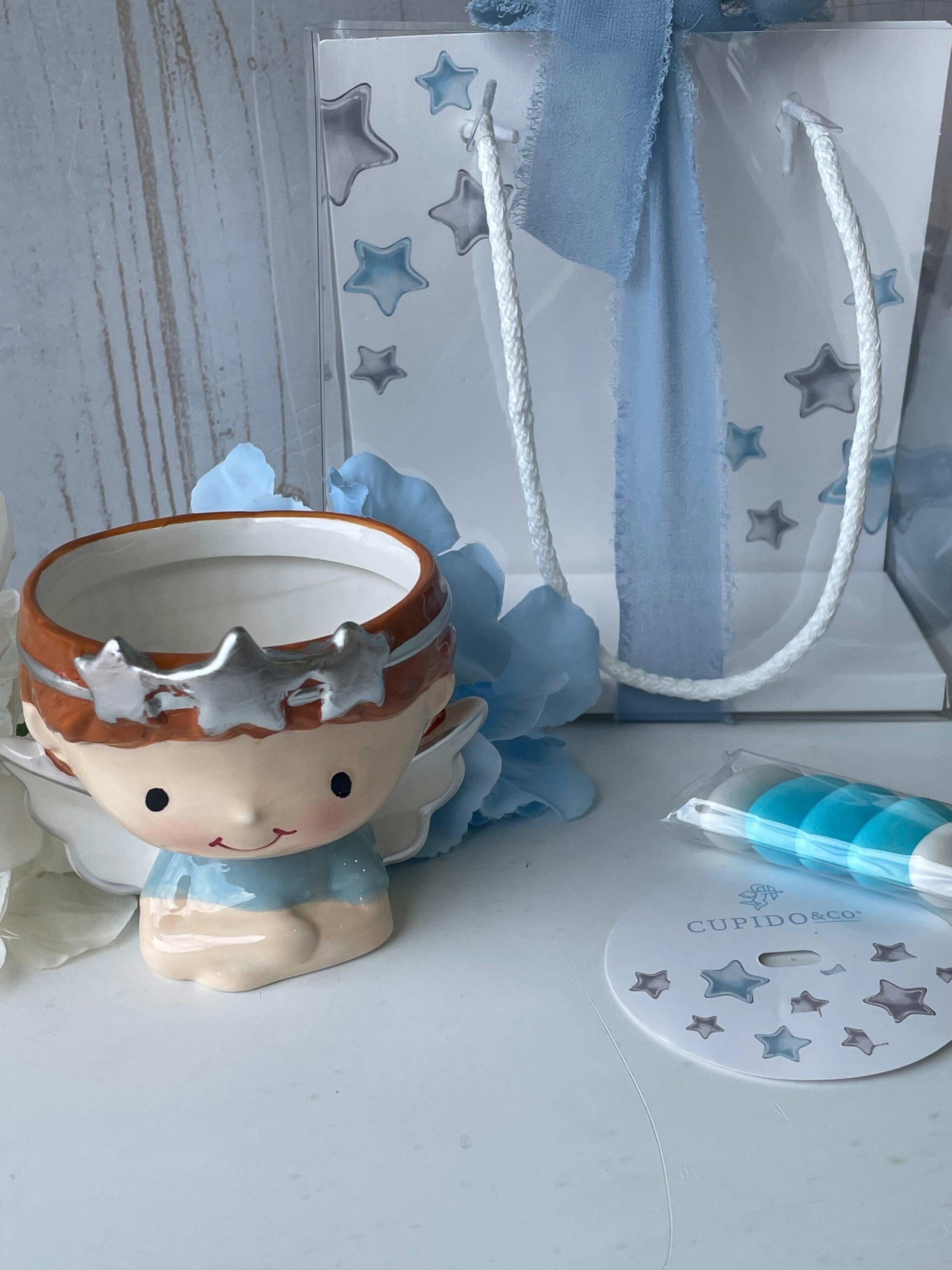 Porta piantina a forma di angioletto con tunica azzurra e ali bianche, decorato con una coroncina di stelle argento. Art. 249201S