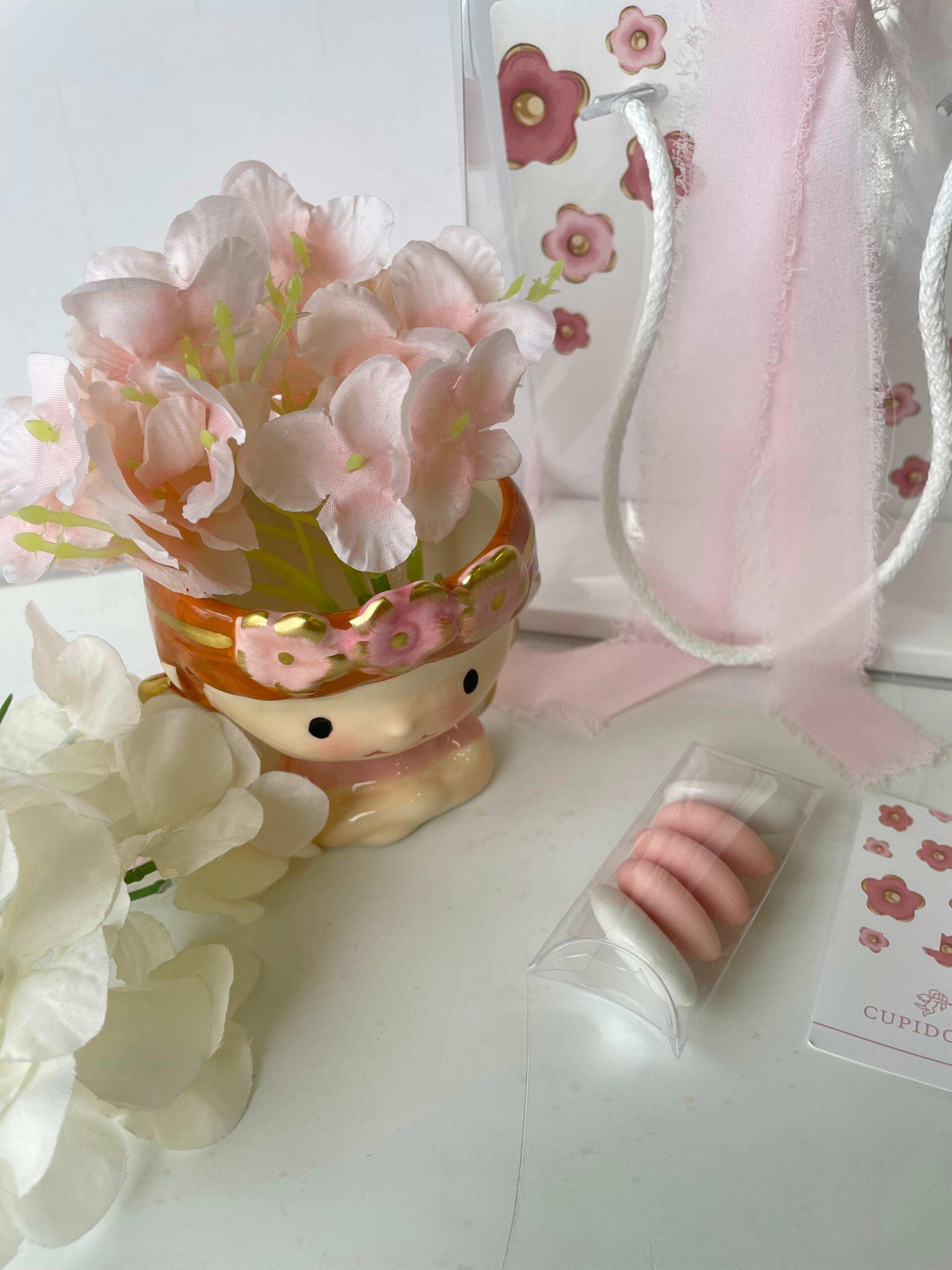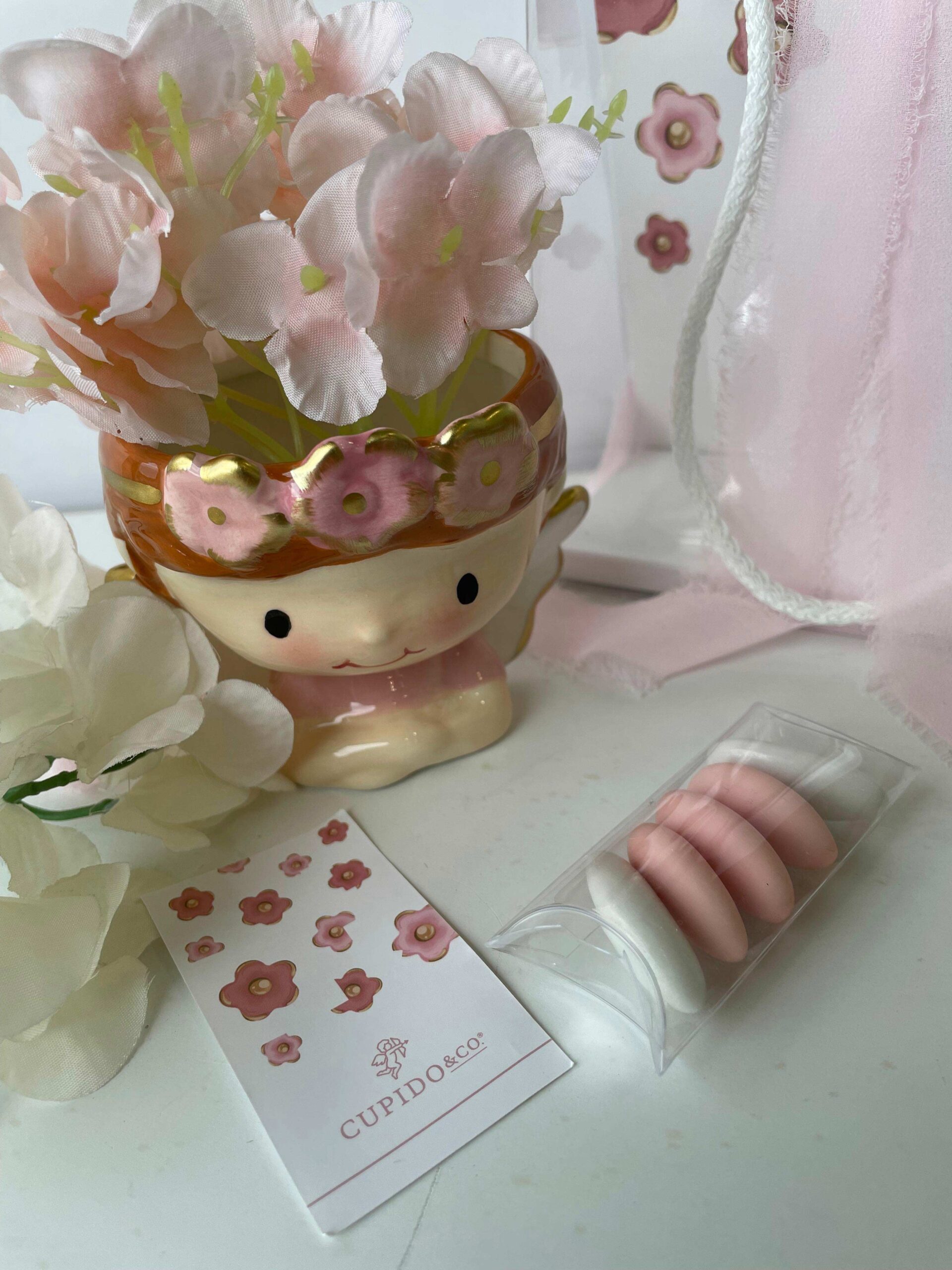 Porta piantina a forma di angioletto con tunica rosa e ali bianche, decorato con una coroncina di fiori rosa e dorati.