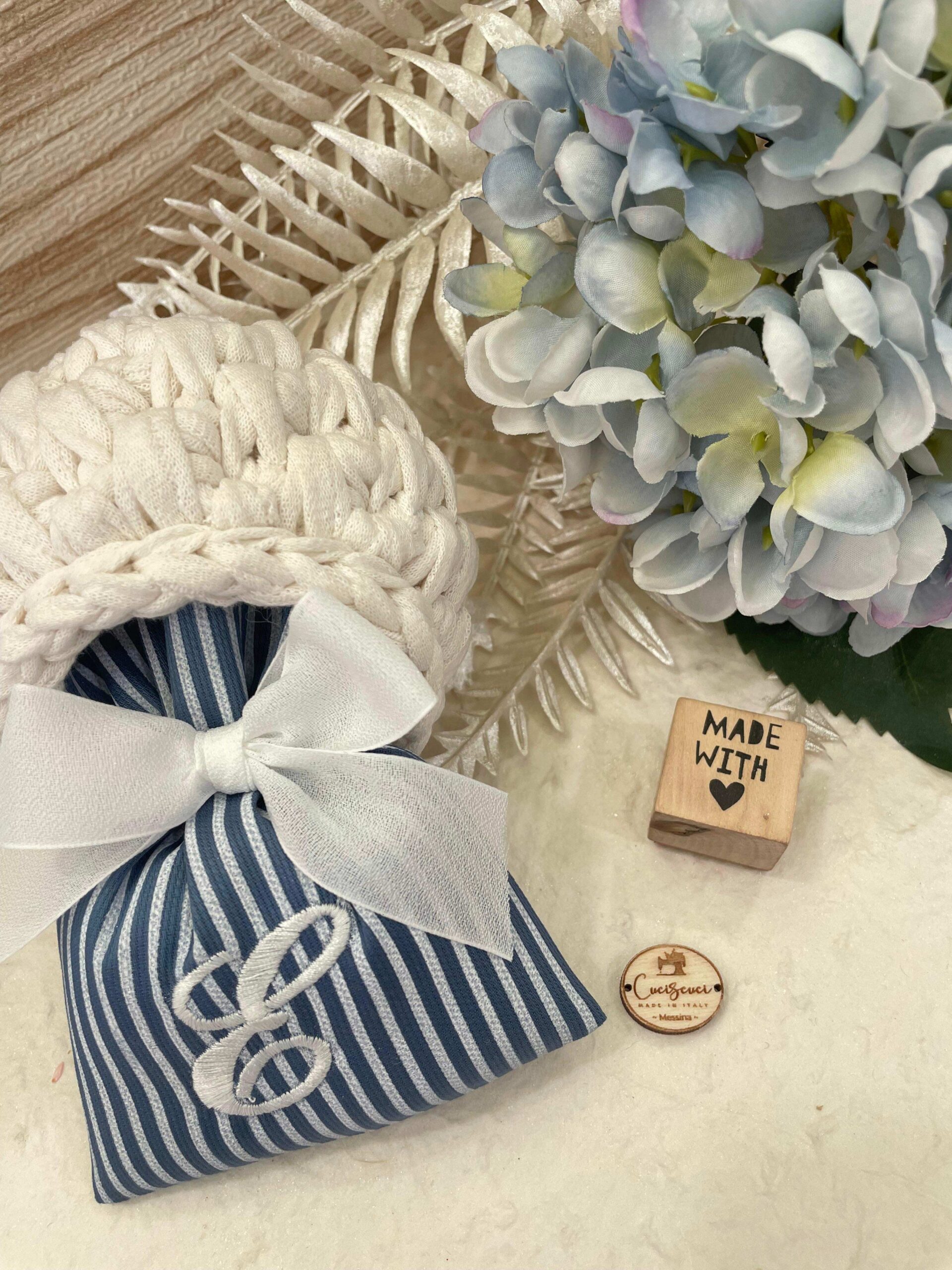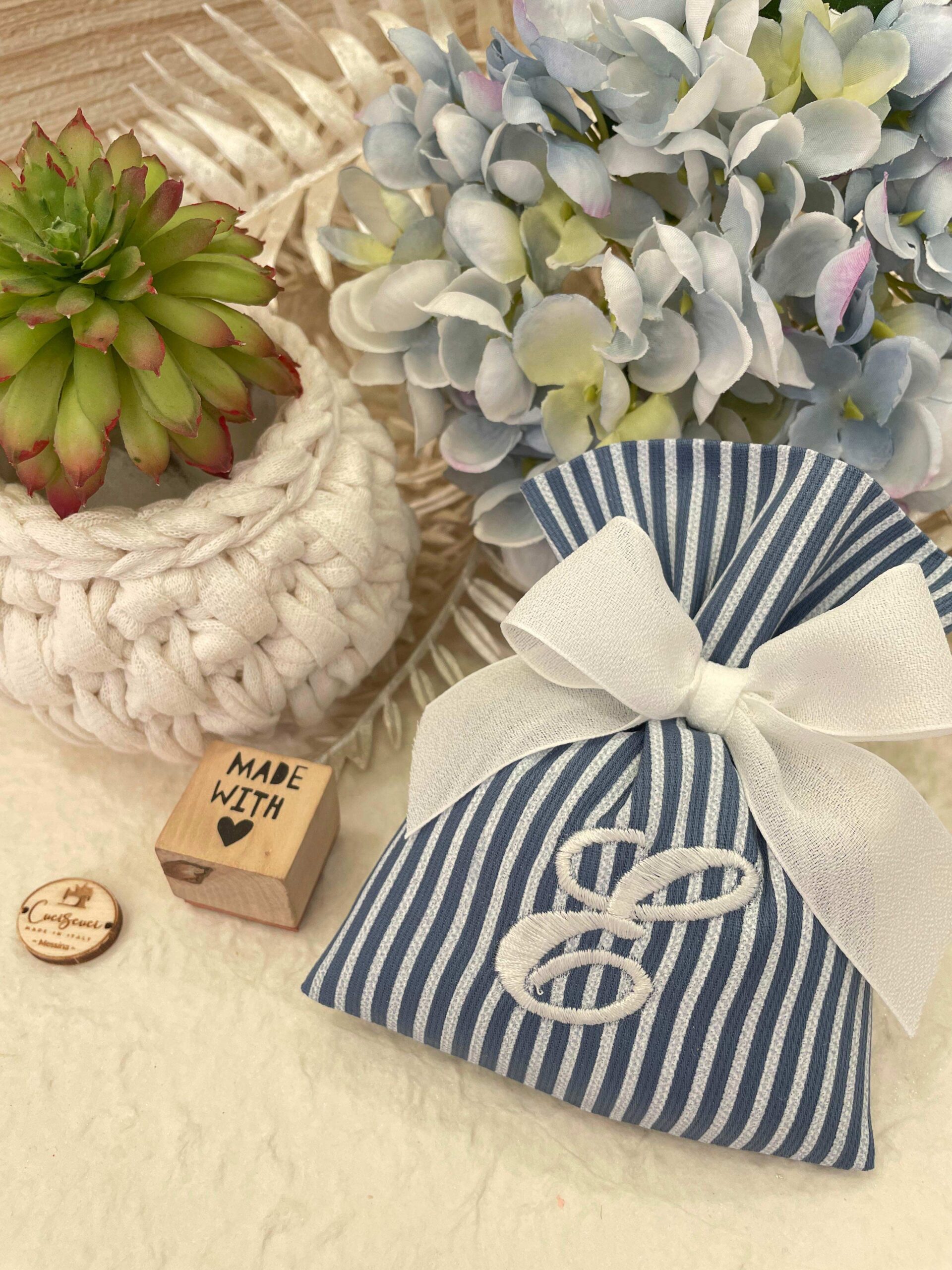 – Porta piantina e sacchetto sartoriale ricamato in rigatino di cotone carta da zucchero, confezionato con imbottitura in ovatta, fiocco abbinato, 5 confetti in busta sigillata e tag personalizzato.