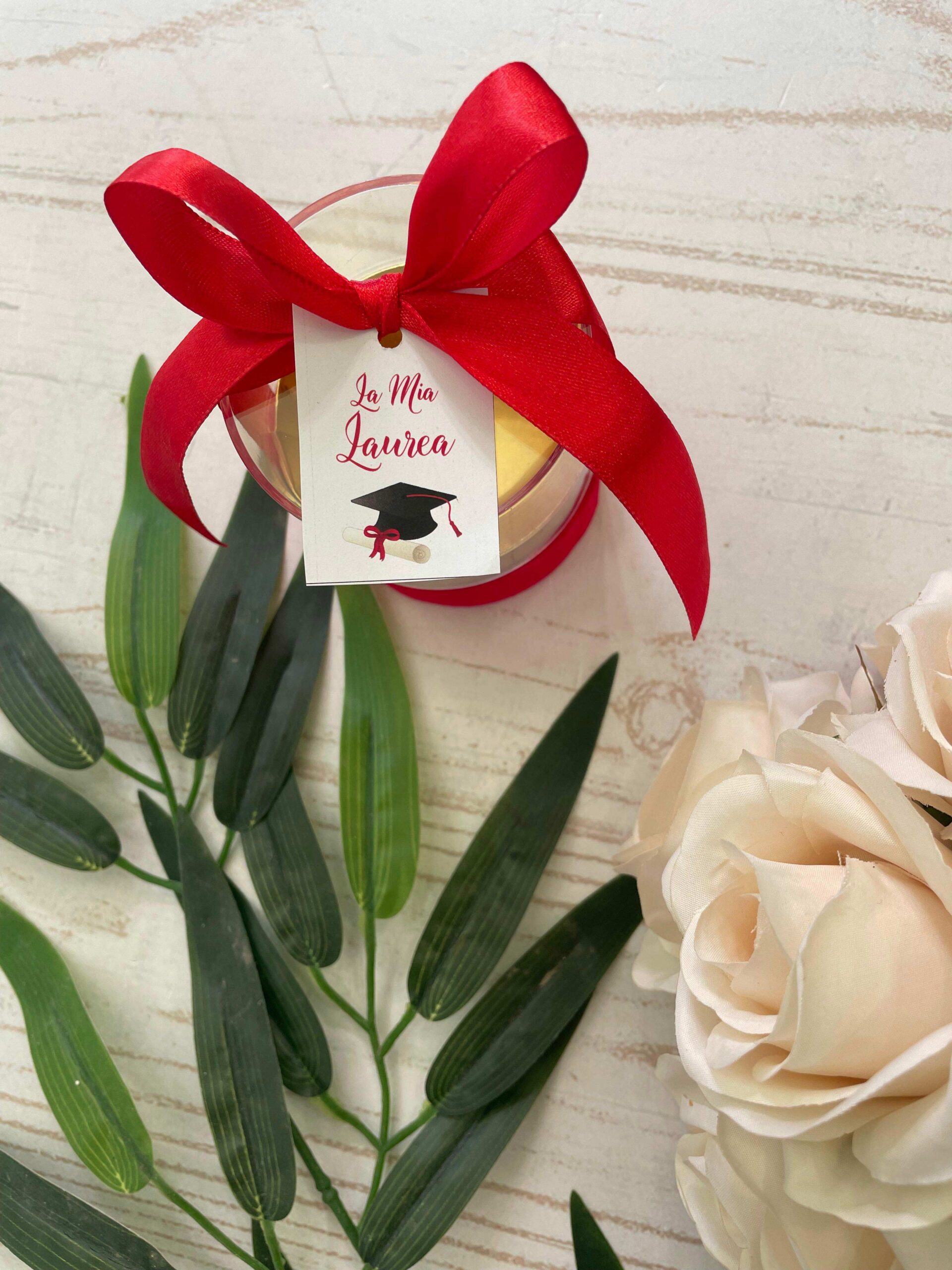 Il contenitore è completato da un coperchio trasparente, anch’esso caratterizzato internamente dalla stessa finitura dorata, che valorizza ulteriormente l’insieme mantenendo visibile il contenuto. A impreziosire la bomboniera è presente un nastro in raso color rosso annodato a fiocco, applicato attorno al contenitore per un tocco elegante e scenografico.