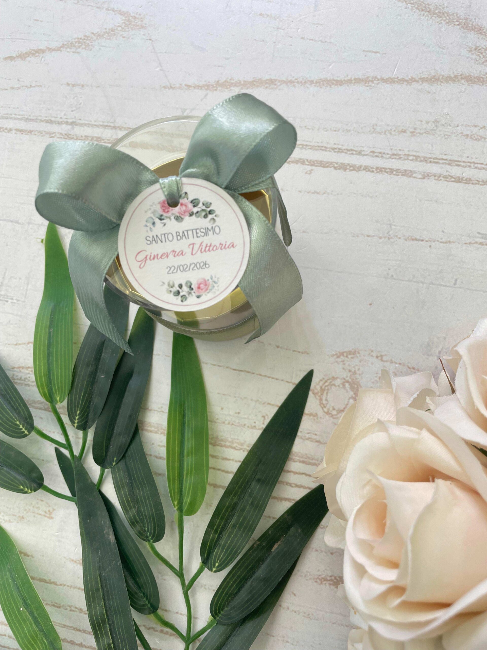 Il contenitore è completato da un coperchio trasparente, anch’esso caratterizzato internamente dalla stessa finitura dorata, che valorizza ulteriormente l’insieme mantenendo visibile il contenuto. A impreziosire la bomboniera è presente un nastro in raso color verde annodato a fiocco, applicato attorno al contenitore per un tocco elegante e delicato.