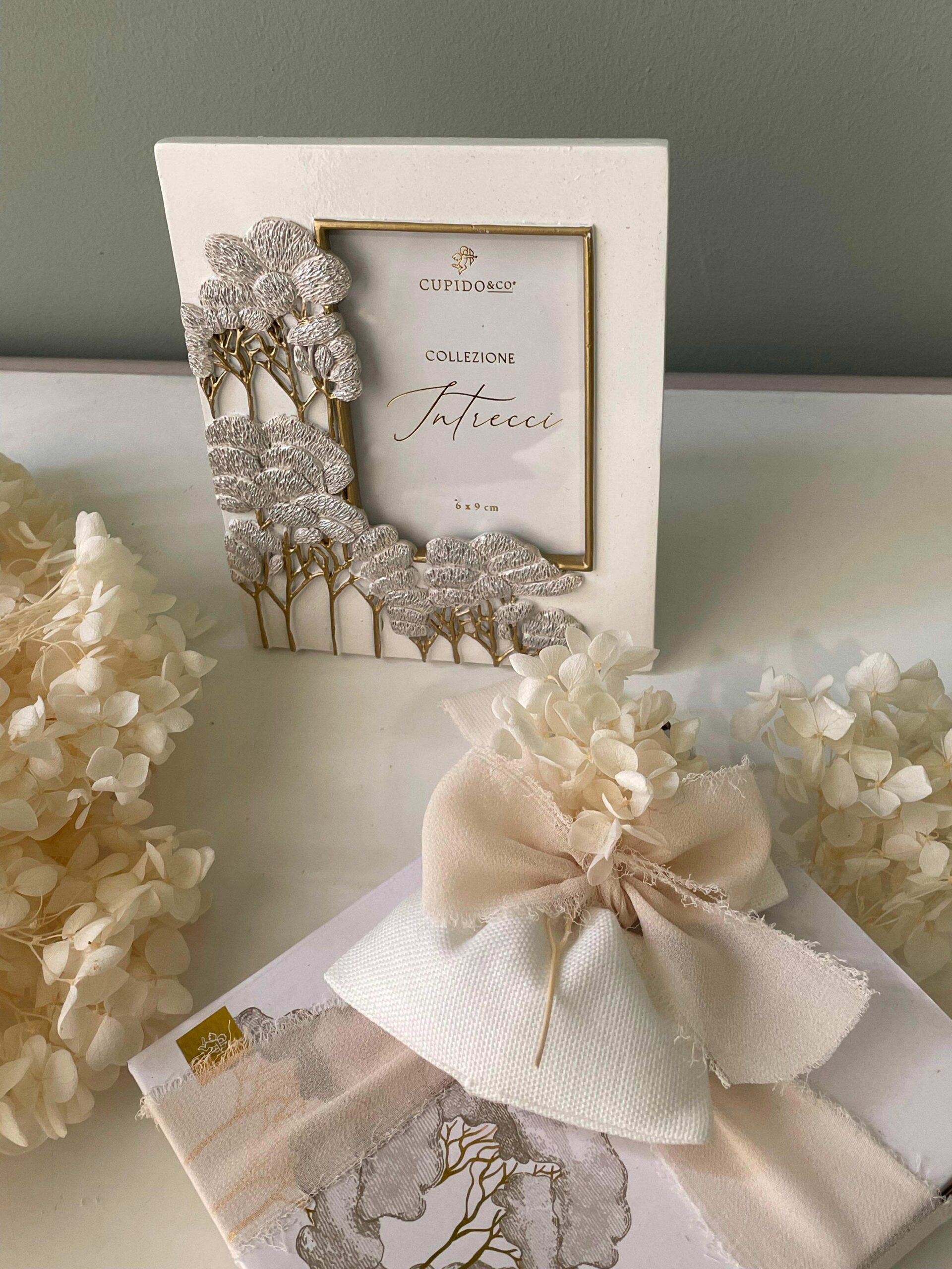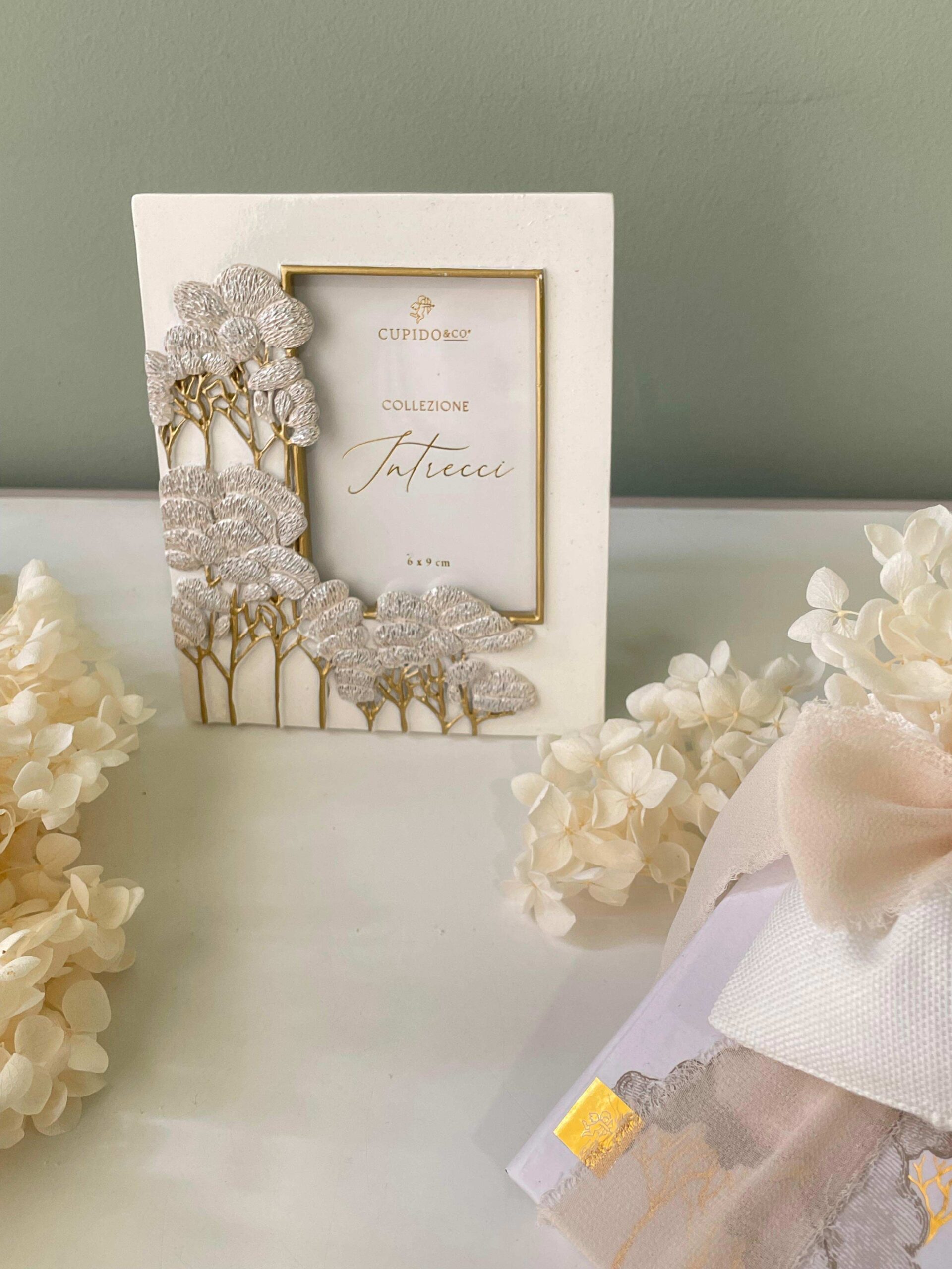 Portafoto decorativo appartenente alla raffinata Linea Intrecci di Cupido&Co., caratterizzato da una cornice elegante impreziosita da alberi in rilievo in tonalità dorata, che donano profondità, luminosità e un effetto materico di grande impatto visivo. Il bordo interno dorato valorizza lo spazio dedicato alla fotografia, incorniciandola con gusto e raffinatezza.