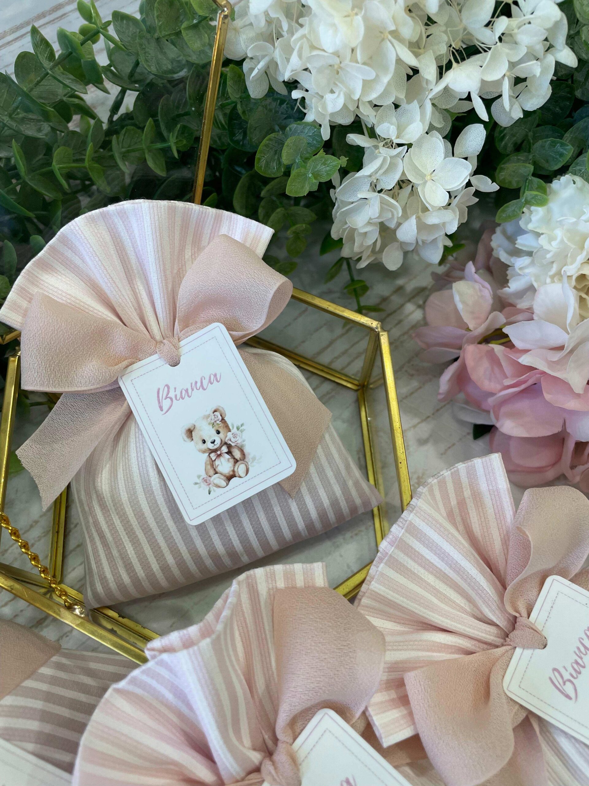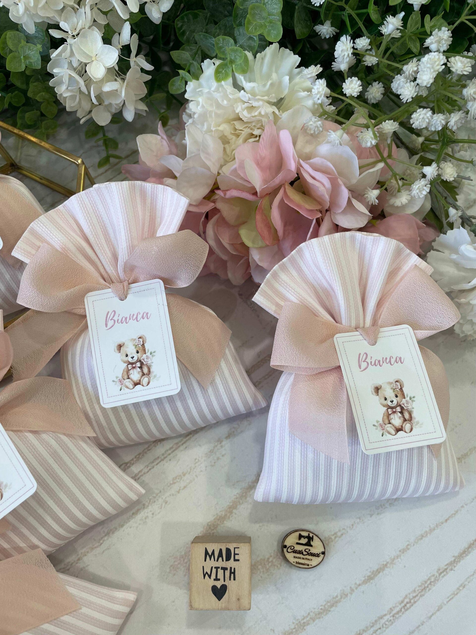 La bomboniera, pronta da donare ai tuoi ospiti, comprende il sacchetto, confezionato con imbottitura in ovatta, fiocco abbinato, 5 confetti in busta sigillata, con o senza tag.